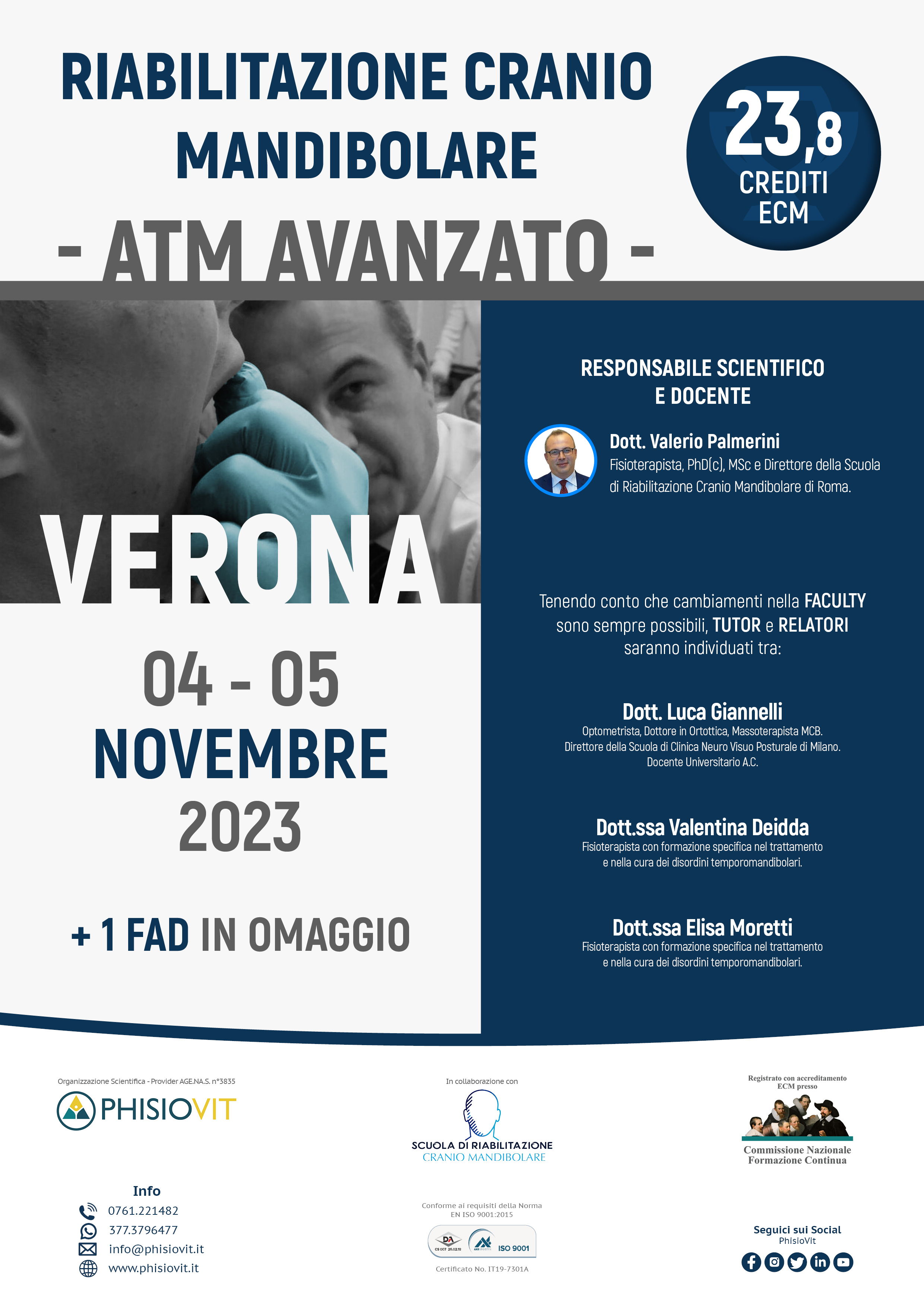 I vari livelli della scuola di riabilitazione cranio mandibolare offrono piani formativi completi per professionisti sanitari sui disordini temporomandibolari, dolore orofacciale e loro riabilitazione multidisciplinare, permettendo al discente una crescita ampia, graduale ed accurata. Durante la mattina del primo giorno del corso avanzato, dopo un riepilogo del livello precedente, viene approfondita la terza branca del trigemino, quella mandibolare, seguita dall'esecuzione di tecniche profonde come le Intraoral Myofascial Techniques; viene anche proposta la tecnica di riduzione manuale del disco dislocato, contestualizzata nell'adeguata fase terapeutica. Nel pomeriggio poi, spazio alla seconda branca del trigemino, al palato con l'illustrazione delle famiglie di bite più utilizzati e loro funzione. La prima giornata si conclude con la spiegazione dell'Axis II, col completamento del protocollo valutativo Diagnostic Criteria già introdotto nel livello base e con la distribuizione dei questionari utili ad un più ampio e corretto inquadramento del paziente con disordine temporomandibolare anche sotto un'ottica biopsicosociale. La mattina del secondo giorno è dedicata alle relazioni dell'ATM con lingua, osso ioide e reciproche influenze, accompagnata da una ricca parte pratica di tecniche manuali per i muscoli ioidei e integrata da semplici ma efficaci integrazioni di terapia miofunzionale. Nel pomeriggio poi, si completa l'approfondimento del nervo trigemino con la prima branca, quella oftalmica, impreziosito dall'esecuzione dei test neurovisuoposturali. La giornata si conclude con il capitolo dedicato al nervo faciale e ad alcune delle strategie riabilitative emergenti sia da un punto di vista clinico che di letteratura scientifica.