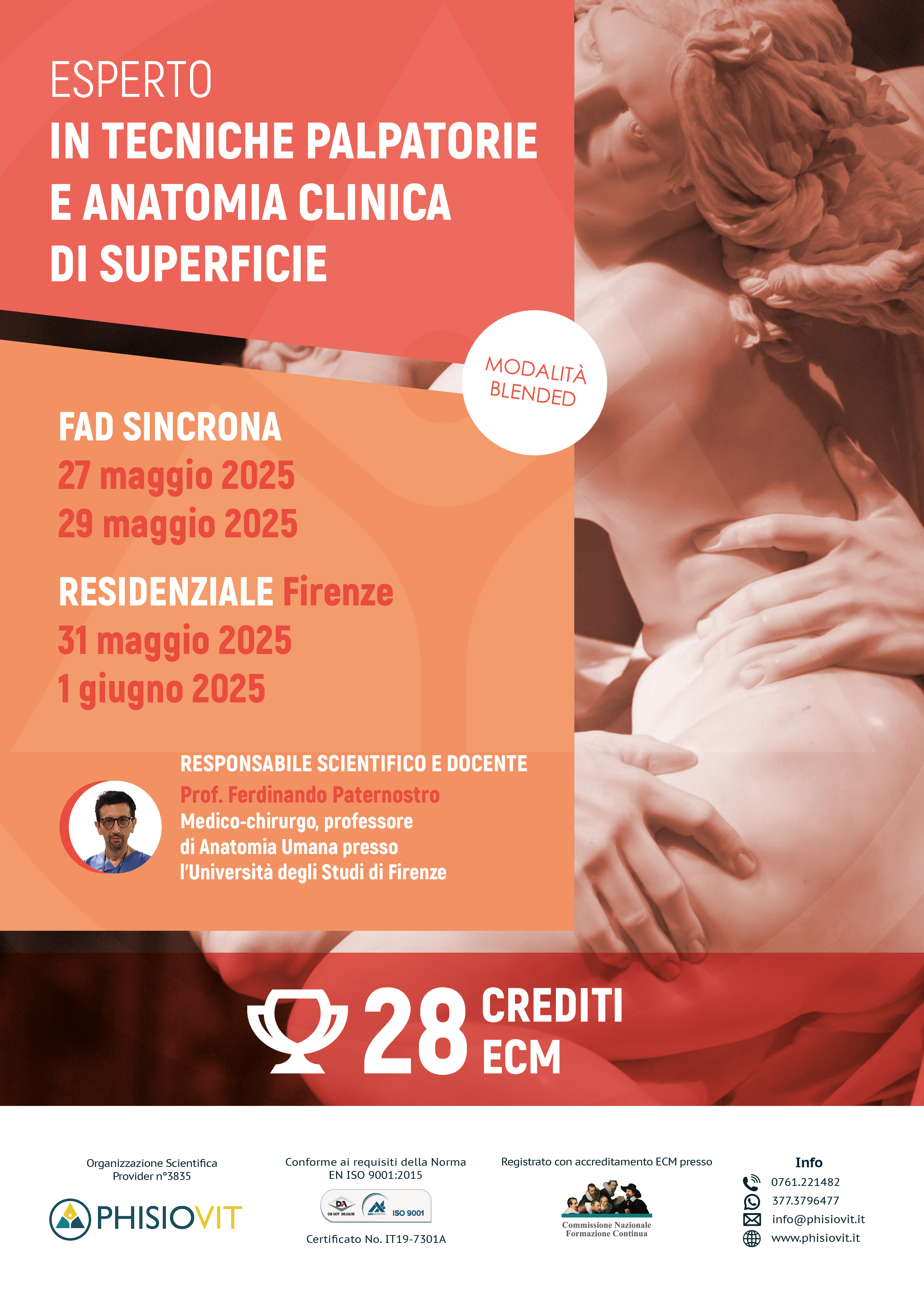 Esperto in Anatomia e Tecniche Palpatorie è un progetto didattico che mira a formare i professionisti dell'area medica, riabilitativa, rieducativa, sportiva e parasanitaria nello studio dell'anatomia di superficie, delle tecniche di palpazione e nel riconoscimento topografico. Include un pacchetto promozionale di due corsi ed eroga complessivamente 28 crediti ECM. I due eventi inclusi sono: "Tecniche Palpatorie e Anatomia Clinica di Superficie della Colonna Vertebrale e degli Arti Superiori", 14 crediti ECM, martedì 27 maggio 2025 dalle 21.00 alle 23.00 in diretta online e sabato 31 maggio 2025 in presenza a Firenze; "Tecniche Palpatorie e Anatomia Clinica di Superficie del Torace e degli Arti Inferiori", 14 crediti ECM, giovedì 29 maggio 2025 dalle 21.00 alle 23.00 in diretta online e domenica 1 giugno 2025 in presenza a Firenze.