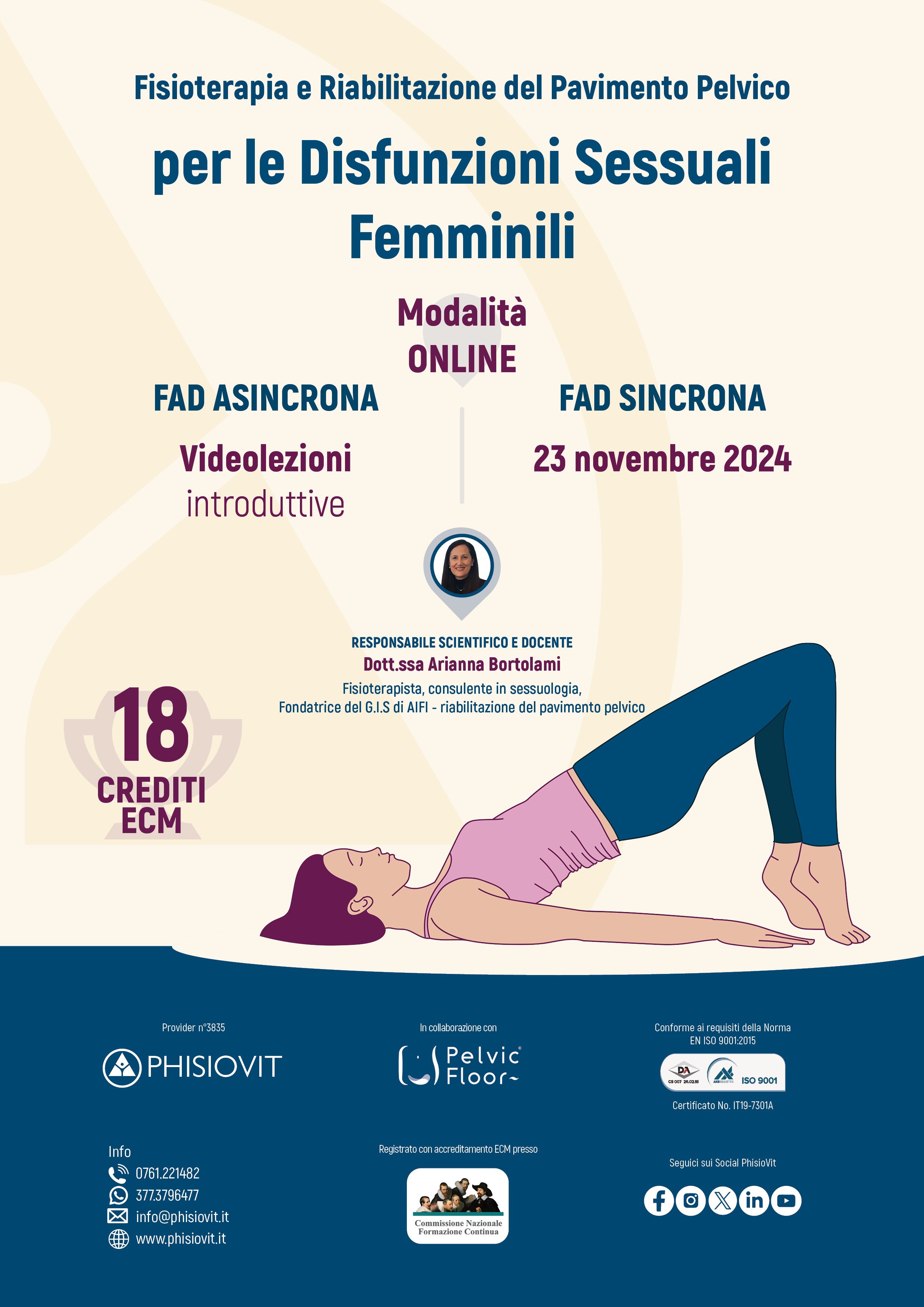 Questo progetto didattico è la versione in diretta in streaming on line del corso blended della Dott.ssa Arianna Bortolami che si tiene con data in presenza a Roma sabato 23 novembre 2024: si tratta di un evento specifico per questo tipo di disfunzioni, le quali costituiscono un sintomo che può peggiorare in modo importante la qualità di vita della donna e, di conseguenza, del partner e della famiglia, compromettendo così la sfera personale e talvolta sociale della donna stessa che ne soffre. In alcuni casi tali condizioni sono così gravi da impedire la maternità, danneggiando ulteriormente la vita della donna e di chi le vive accanto. Il riconoscimento delle disfunzioni sessuali femminili presuppone conoscenze nell'ambito della sessuologia, disciplina che si è sviluppata negli ultimi decenni. Il pavimento pelvico costituisce uno degli elementi della funzione sessuale e la sua compromissione può essere causa primaria o secondaria della disfunzione sessuale: tra le varie opzioni terapeutiche è appunto compresa la fisioterapia e riabilitazione del pavimento pelvico, che è costituita da una serie di tecniche e strumenti, le quali, all'interno di un processo di ragionamento clinico e alla luce del paradigma dell'evidence based practice, permettono la gestione del sintomo relativo alla disfunzione sessuale femminile.