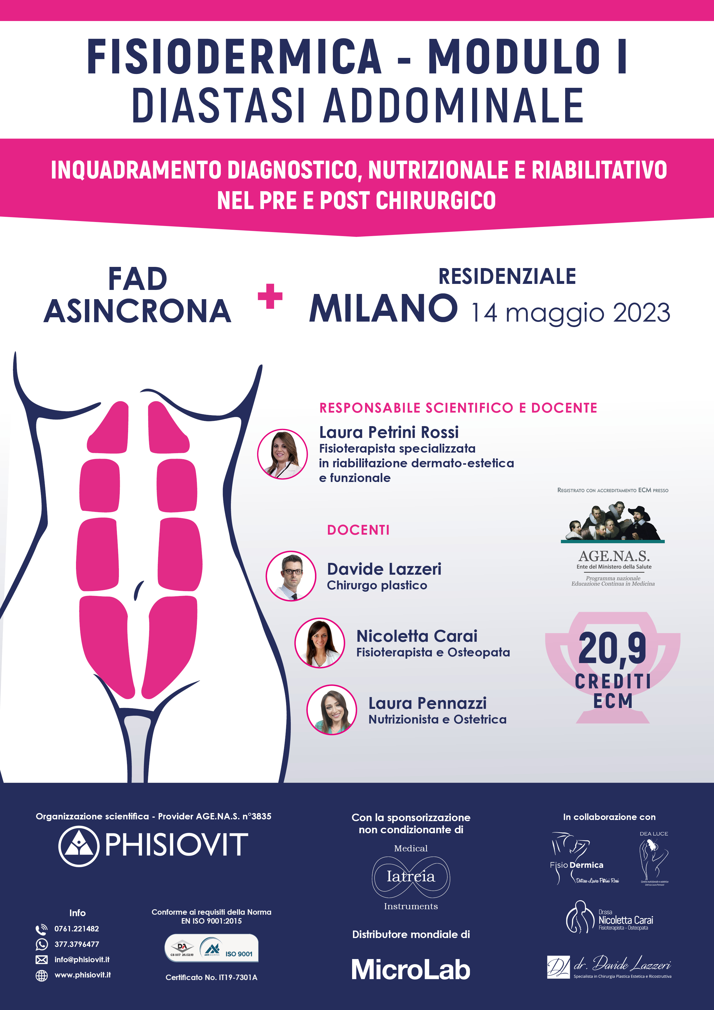 Il corso "Diastasi Addominale: Inquadramento Diagnostico, Nutrizionale e Riabilitativo nel Pre e Post Chirurgico" vede la presenza tra i relatori dei maggiori esperti di settore e nasce con l'obiettivo di favorire lo studio e la pratica clinica dei professionisti sanitari che intervengono in qualità di discenti. Si svolge parte on line e parte in presenza attraverso l'esposizione delle relazioni dei docenti: la successiva discussione che ne nasce attraverso l'elaborazione della valutazione funzionale più utile e del trattamento terapeutico più idoneo, alla luce del paradigma dell'Evidence Based Practice, migliora nettamente le abilità del partecipante favorito anche dal brain storming prima in aula virtuale e poi in aula fisica. Il corsista stesso può anche esporre i dubbi insorti in itinere durante gli incontri in presenza e a distanza così da aumentare, attraverso l'interazione diretta con i relatori e con la classe stessa, l'esperienza e la sicurezza in materia di riabilitazione dermato-estetica e funzionale.
