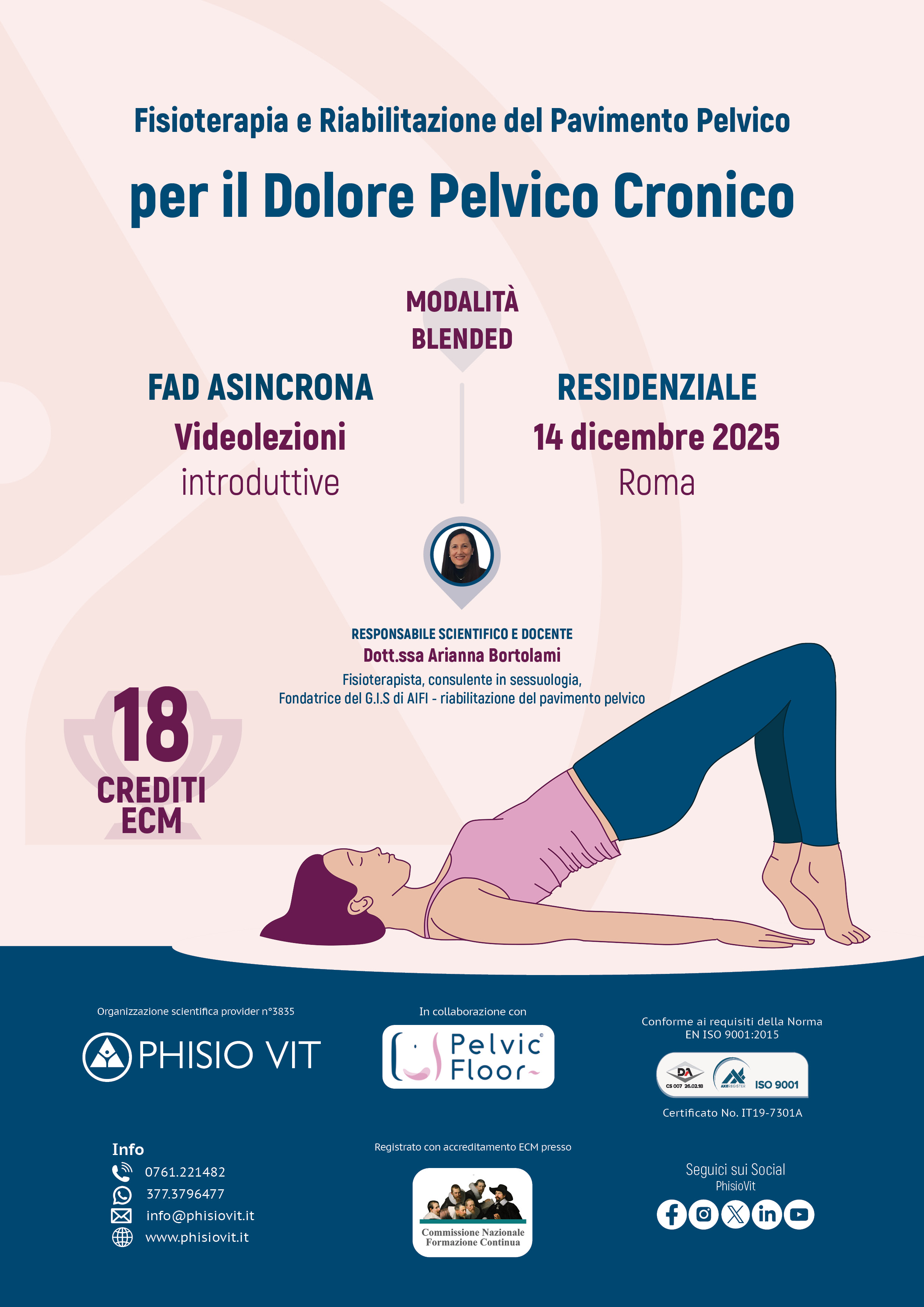 - STEP 1: si inizia con una FAD asincrona relativa a fisioterapia e riabilitazione del pavimento pelvico per il dolore pelvico cronico che contiene tutta la teoria esposta dalla docente in video lezioni. In questa fase vengono anche consegnate dispense per studio e approfondimento. Questa formazione serve a introdurre all'argomento il partecipante, resta nella sua disponibilità all'interno del proprio pannello di controllo in piattaforma didattica ed è accessibile da qualsiasi dispositivo. Può essere iniziata, ripresa e interrotta quando e quante volte si vuole ma comunque completata prima dello STEP 2 illustrato qui di seguito.