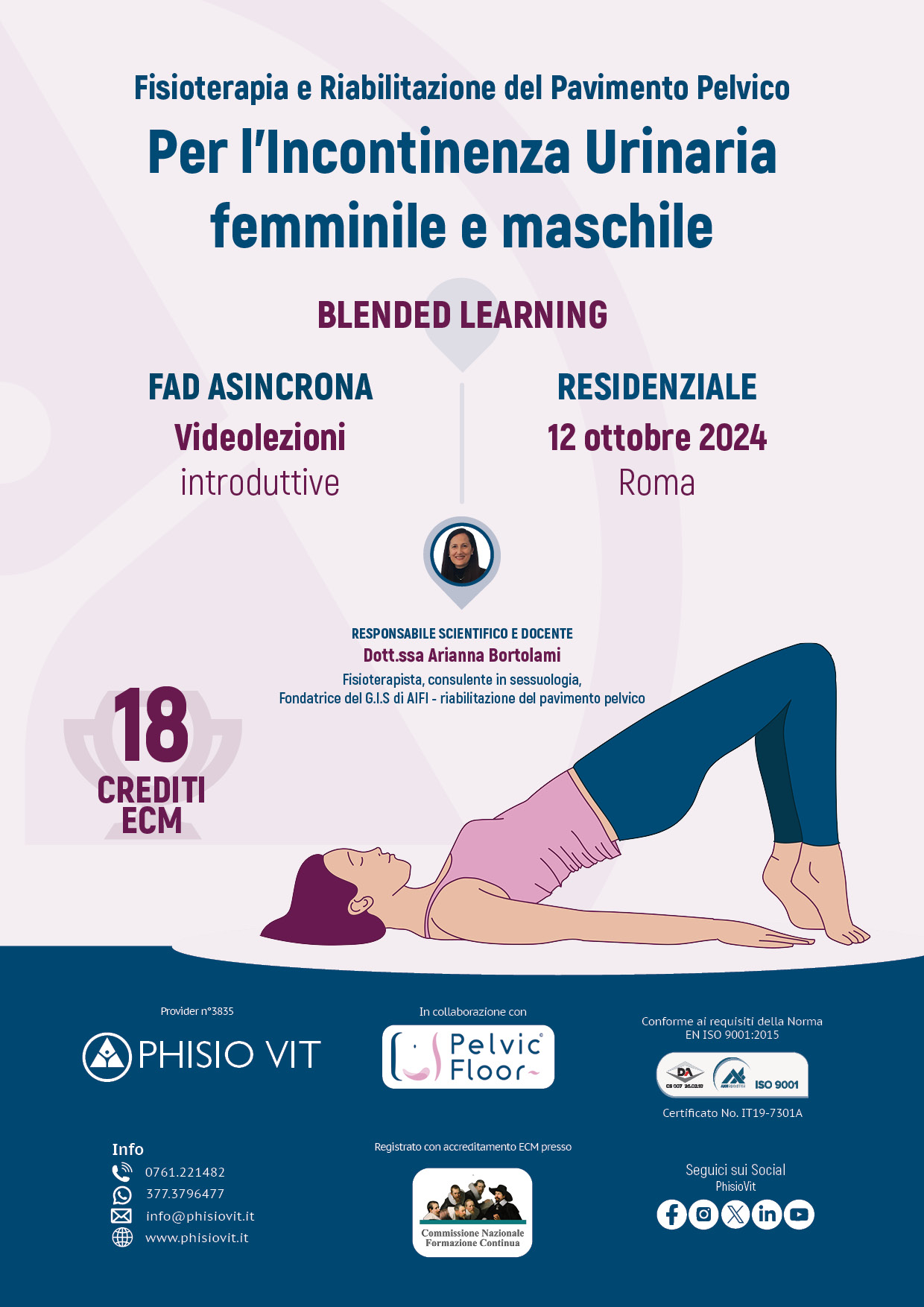 Questo progetto didattico interamente curato dalla Dott.ssa Arianna Bortolami è in versione blended, ovvero prevede tutta la teoria in modalità FAD asincrona e tutta la pratica in modalità residenziale in aula. Si tratta di un evento specifico per questo tipo di disfunzioni e include strategie riabilitative per le diverse forme di incontinenza urinaria femminile e maschile di origine non neurogena. La fisioterapia e la riabilitazione del pavimento pelvico costituiscono la prima opzione terapeutica per l'incontinenza urinaria di origine non neurogena. Questo sintomo, definito come la perdita involontaria di urina, riguarda intimamente la qualità di vita: chi ne soffre spesso riferisce sensazioni di imbarazzo, frustrazione, disagio nei confronti dell'ambiente circostante e delle persone che gli stanno vicino. A ciò possono conseguire alterazioni della vita affettiva, relazionale e sociale. Inoltre, l'incontinenza può avere un costo economico considerevole. Negli ultimi decenni la letteratura internazionale ha dedicato molta attenzione a questo problema: in questo modo l'evidenza scientifica e le prove ottenute hanno dimostrato l'efficacia delle varie opzioni terapeutiche, tra le quali è appunto compresa la fisioterapia e la riabilitazione del pavimento pelvico. Essa è costituita da una serie di tecniche e strumenti, che all'interno di un processo di ragionamento clinico e alla luce del paradigma dell'evidence based practice, permettono la gestione del sintomo relativo all'incontinenza urinaria di origine non neurogena.