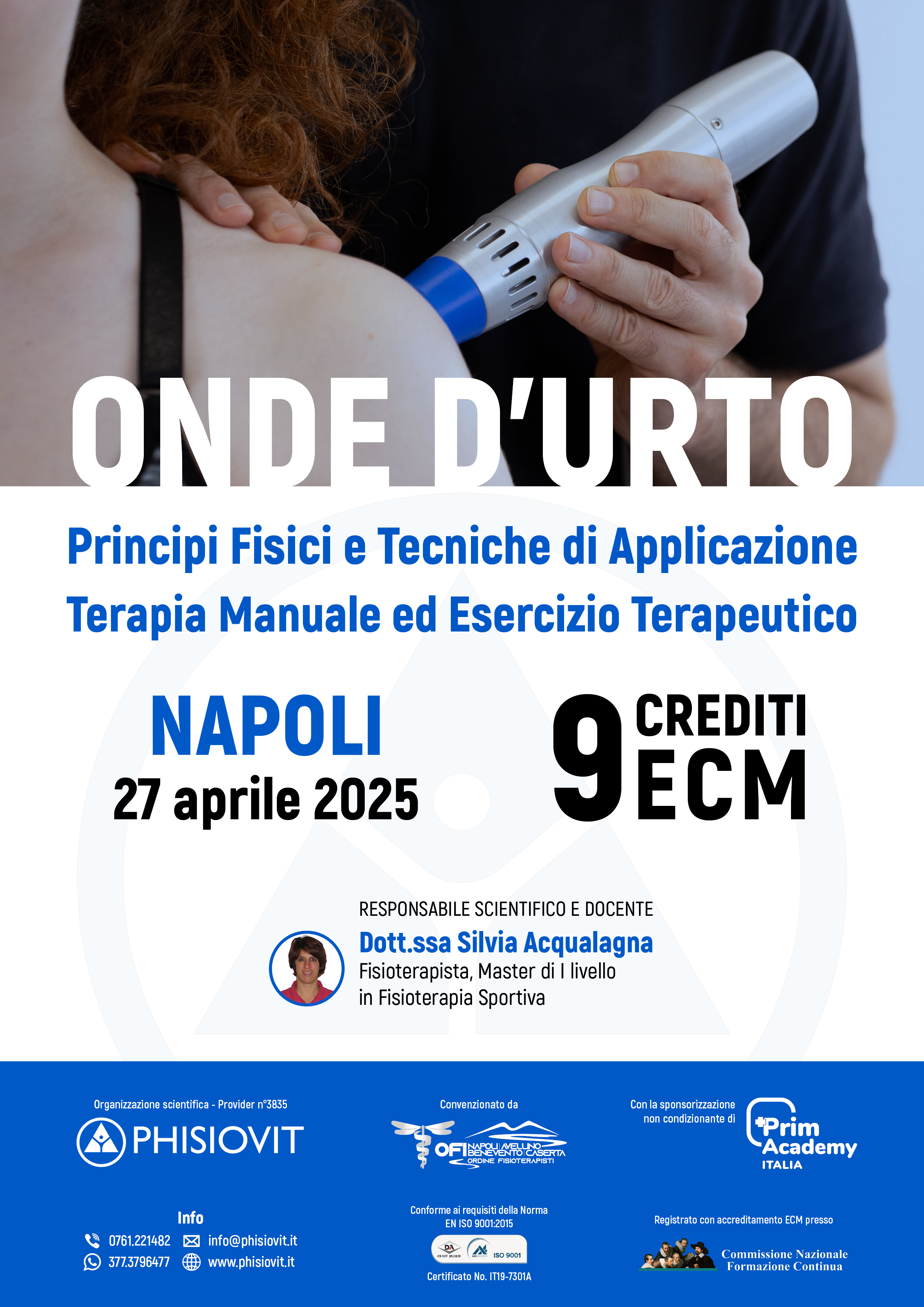 Questo corso, realizzato grazie alla sponsorizzazione non condizionante di PrimAcademy Italia, combina alta qualità scientifica e pratica clinica. I partecipanti apprenderanno l'integrazione di Onde d'Urto, terapia manuale ed esercizio terapeutico attraverso esercitazioni pratiche su apparecchiature di ultima generazione. Le sessioni di laboratorio, supervisionate dalla docente, permetteranno di sperimentare direttamente protocolli di trattamento integrati e strategie riabilitative evidence-based.
