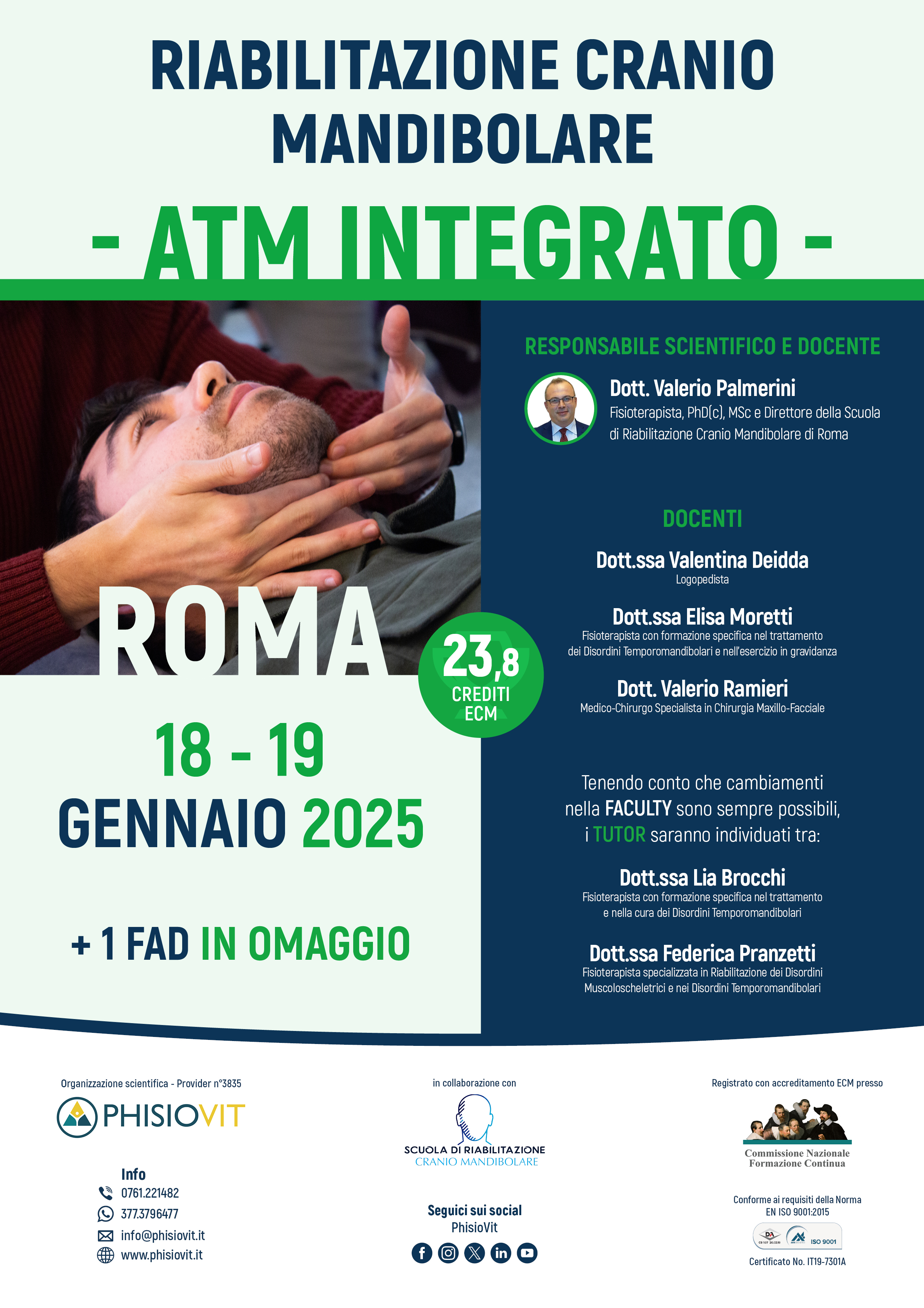 I vari livelli della scuola di riabilitazione cranio mandibolare offrono piani formativi completi per professionisti sanitari sui disordini temporomandibolari, dolore orofacciale e loro riabilitazione multidisciplinare, permettendo al discente una crescita ampia, graduale e accurata. La mattina del primo giorno del corso integrato ORL e maxillo-facciale viene dedicata a introdurre al meglio il partecipante a riconoscere i più diffusi splint occlusali utilizzati per la terapia dei disordini cranio mandibolari. Viene analizzato il ruolo del palato attraverso l'illustrazione di alcune tecniche di terapia manuale dedicate a questo sensibile distretto della bocca. Nel pomeriggio, sono approfonditi segni e sintomi della sfera otorinolaringoiatrica nei pazienti con disordine temporomandibolare, attraverso esercizi terapeutici e valutativi semplici, pratici ed efficaci. Dalle componenti della crescita facciale, alle relazioni dell'ATM con osso ioide e a come funzionano la voce o la deglutizione, viene offerta un'ampia e sempre descritta in letteratura antologia di tecniche terapeutiche miofunzionali. La giornata si conclude con un approfondimento sui tinnitus, in particolare su quelli di sottotipo somatosensoriale e temporomandibolare, a come riconoscerli e all'approccio riabilitativo. Nella mattinata del secondo giorno, vengono illustrate le tecniche di chirurgia maxillo-facciale di più frequente riscontro clinico in ambito cranio mandibolare. Il partecipante può così ampliare le sue conoscenze in materia di chirurgia maxillo-facciale traumatica, oncologica e ortognatica. Può inoltre apprendere i protocolli riabilitativi e le tecniche previste in ciascuna situazione. Il pomeriggio si conclude con un approfondimento sul nervo faciale e sulle problematiche che possono comportarne paralisi: vengono introdotte tecniche riabilitative più classiche ma anche più innovative, come ad esempio l'utilizzo delle emozioni per un più veloce recupero e una migliore ripresa.
