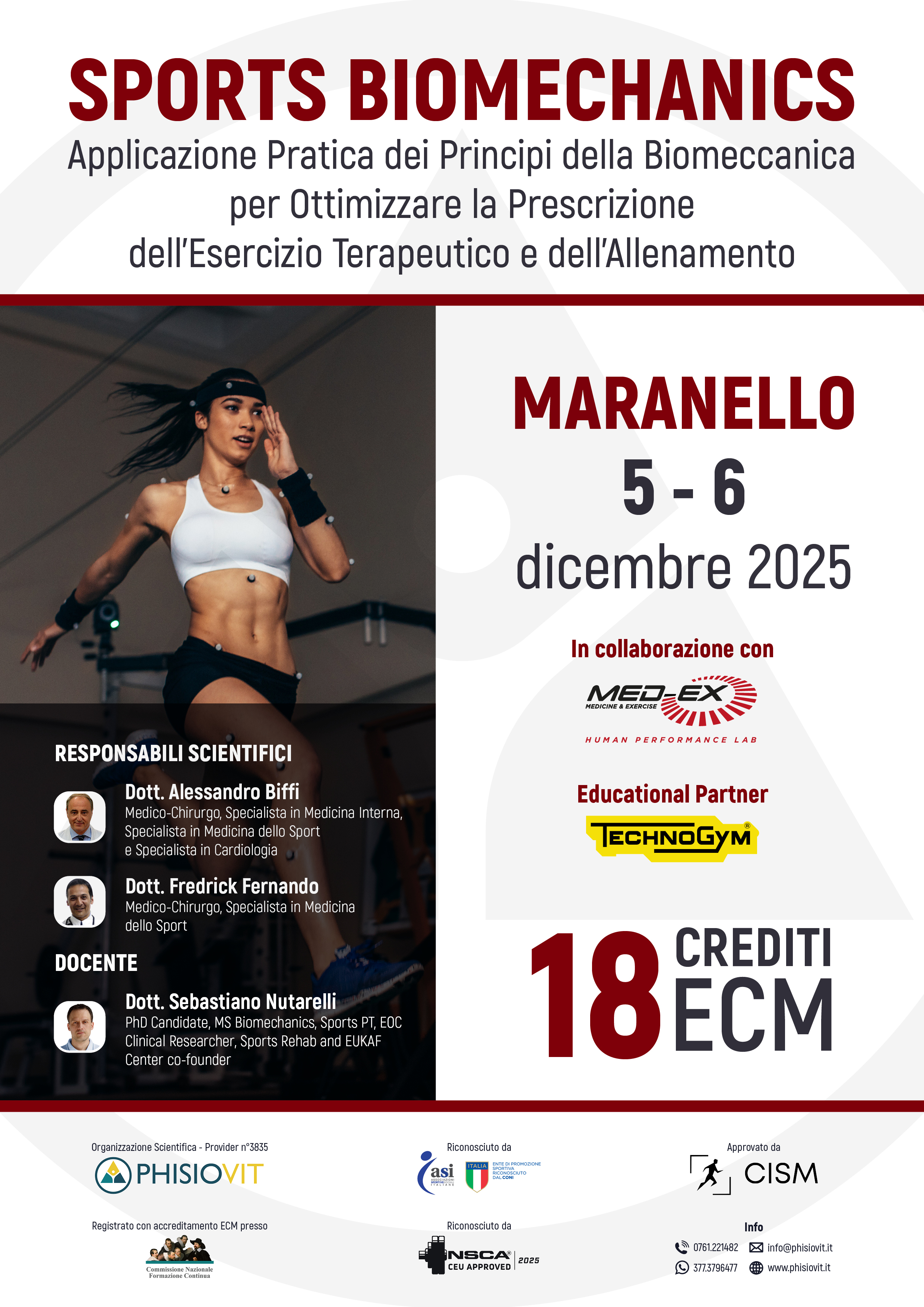 Questo corso ha l'obiettivo di preparare i discenti all'applicazione dei principi della biomeccanica nel campo della riabilitazione, della performance e del ritorno al gesto sportivo, attraverso un percorso strutturato per essere facilmente comprensibile e immediatamente applicabile. L'intento è anche quello di offrire una comprensione approfondita della biomeccanica da una prospettiva immediatamente applicabile alla pratica. Saranno analizzate diverse modalità operative, basate sulla comprensione biomeccanica del gesto richiesto nella pratica sportiva, sia nei casi in cui l'atleta infortunato miri a rientrare in campo, sia per ottimizzare l'allenamento di atleti sani, al fine di massimizzare la performance. Le stesse conoscenze saranno applicate anche alla valutazione di pazienti in fase riabilitativa. Verranno inoltre presentati i principali sistemi per l'analisi del movimento umano, capaci di fornire in tempo reale informazioni su accelerazione, velocità angolare, orientamento e spostamento del punto d'applicazione, in relazione al distretto corporeo oggetto di studio nel gesto sportivo. Infine, i partecipanti familiarizzeranno con i principali strumenti di misurazione della forza, fondamentali per oggettivare lo stato di baseline e i miglioramenti ottenuti grazie al lavoro svolto, integrando tutti questi aspetti in un unico percorso formativo coerente e completo.