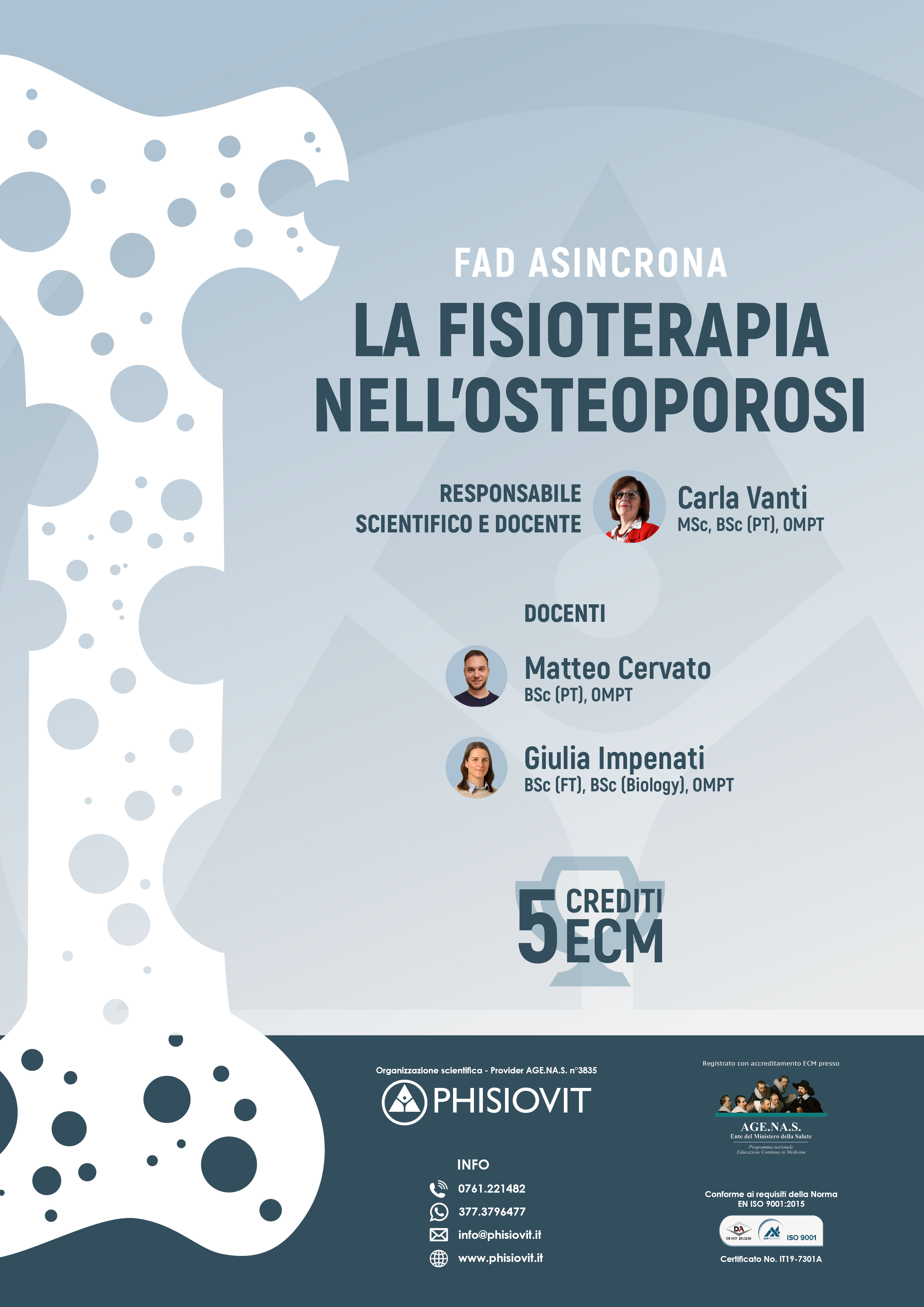 Questo corso è un prodotto didattico derivato da un webinar registrato che gli autori hanno sostenuto per il pubblico: la registrazione viene così messa a disposizione in questo corso per intero e in formato originale lasciando invariata l'interazione che c'è stata durante la diretta e che ha compreso lezioni, domande dell'uditorio e dibattito finale. Il corso si propone di fornire al partecipante un completo panorama della valutazione e del trattamento fisioterapico dell'osteoporosi, integrato con un approccio informativo ed educativo. È articolato in una sessione in cui si affrontano l'inquadramento clinico, i principi di prevenzione e di mantenimento comprensivi di esercizio, attività fisica e dieta, e le procedure di trattamento negli esiti di frattura osteoporotica del rachide, sia gestita con modalità conservative, che con intervento chirurgico di vertebroplastica. Il corso ha un taglio prevalentemente pratico, per fornire al partecipante un'ampia scelta di procedure terapeutiche e guidarlo al loro utilizzo mirato all'interno della propria pratica clinica.