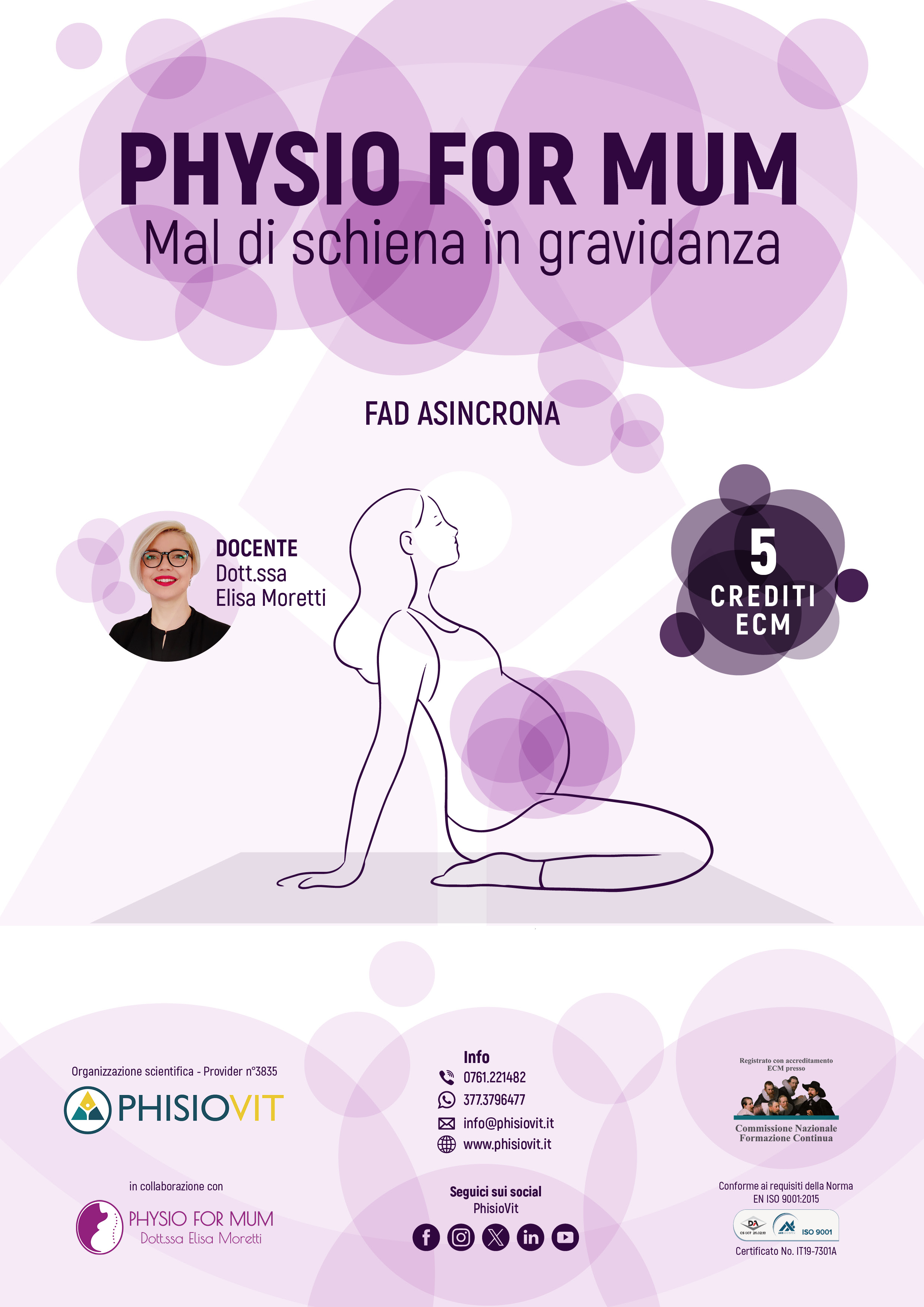 Questo corso fa parte del PACCHETTO PROMO - Physio For Mum Online (Docente: E. Moretti) - che include sette eventi FAD asincroni: "Physio For Mum 1 - 99 Esercizi In Gravidanza", 5 crediti ECM; "Physio For Mum 2 - Esercizi nel Post Parto", 5 crediti ECM; "Physio For Mum 3 - Mal di Schiena in Gravidanza", 5 crediti ECM; "Physio For Mum 4 - Ripresa dell'Attività Fisica, Diastasi e Cicatrice", 5 crediti ECM; "Physio For Mum 5 - Sindrome del Tunnel Carpale e Circolazione Periferica", 5 crediti ECM; "Physio For Mum 6 - La Prevenzione Pre e Post Parto: Attività Fisica", 5 crediti ECM e "Physio For Mum 7 - Pavimento Pelvico e Respirazione", 5 crediti ECM. CLICCA QUI per avere maggiori informazioni.