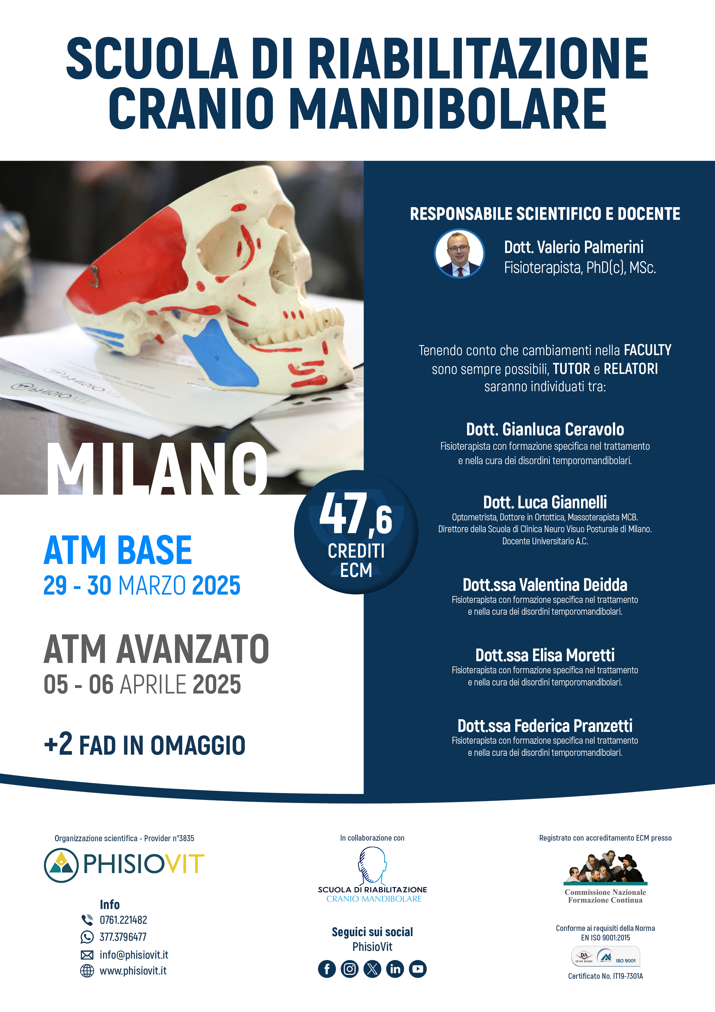 Scuola di Riabilitazione Cranio Mandibolare è un progetto didattico blended che mira a formare i professionisti dell'area riabilitativa e rieducativa nella fisioterapia e nella riabilitazione dei disordini dell'articolazione temporomandibolare (DTM) e delle disfunzioni cranio cervico mandibolari (DCCM). Include un pacchetto promozionale di quattro corsi ed eroga complessivamente 47,6 crediti ECM. I quattro eventi inclusi sono: "Riabilitazione Cranio Mandibolare - ATM Base", 21,8 crediti ECM, Milano, 29-30 marzo 2025; "Riabilitazione Cranio Mandibolare - ATM Avanzato", 21,8 crediti ECM, Milano, 5-6 aprile 2025 e due corsi FAD asincroni che si possono svolgere a distanza dal titolo "Anatomia dell'ATM", 2 crediti ECM e "I Nervi Cranici", 2 crediti ECM, essenziali per prepararsi al meglio alla serie di eventi in aula. Questi due corsi FAD vengono rilasciati a cura della segreteria di PhisioVit ai discenti regolarmente iscritti al pacchetto didattico poco prima dell'inizio delle lezioni residenziali, una volta attivati gli eventi e saldata la quota.
