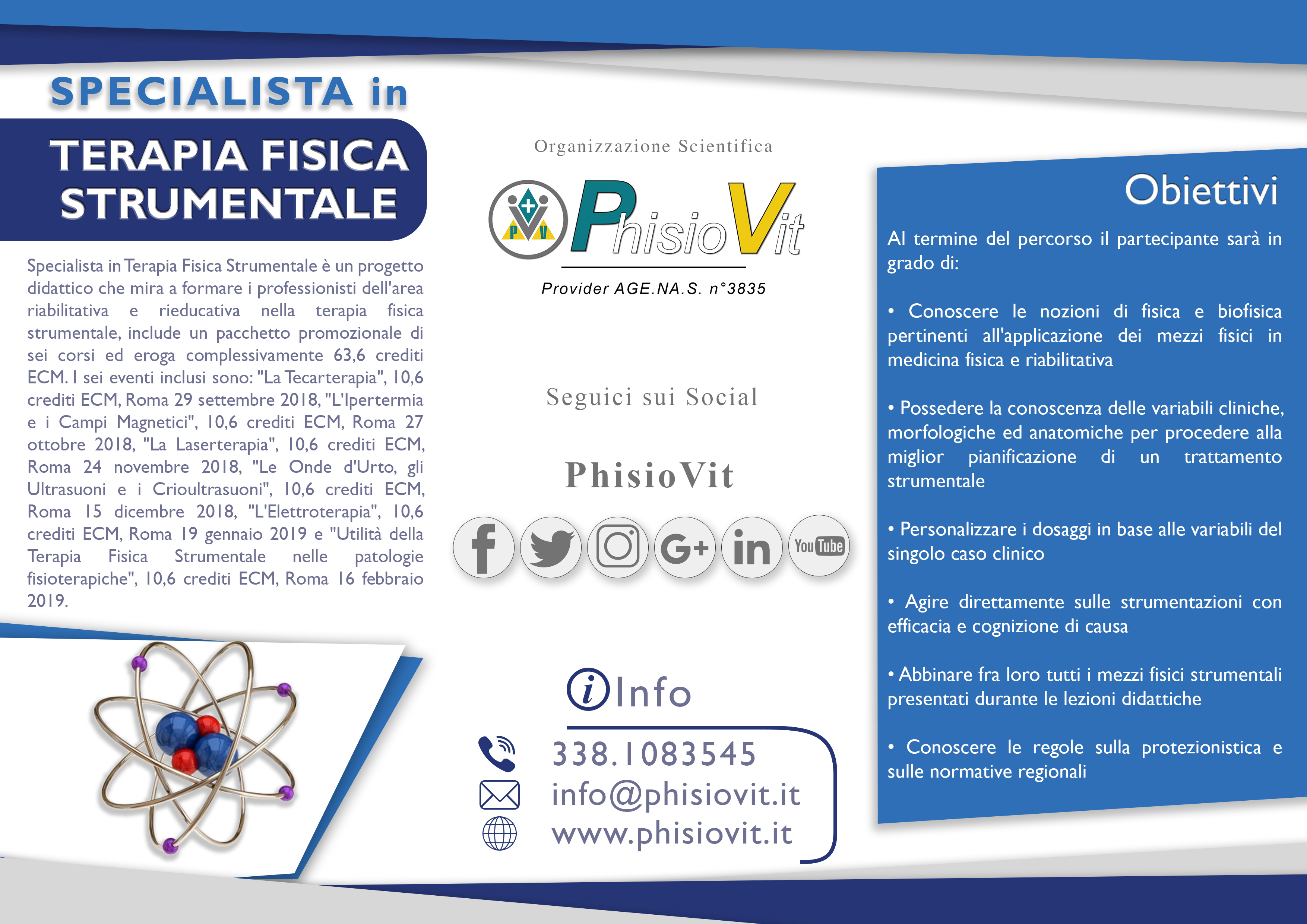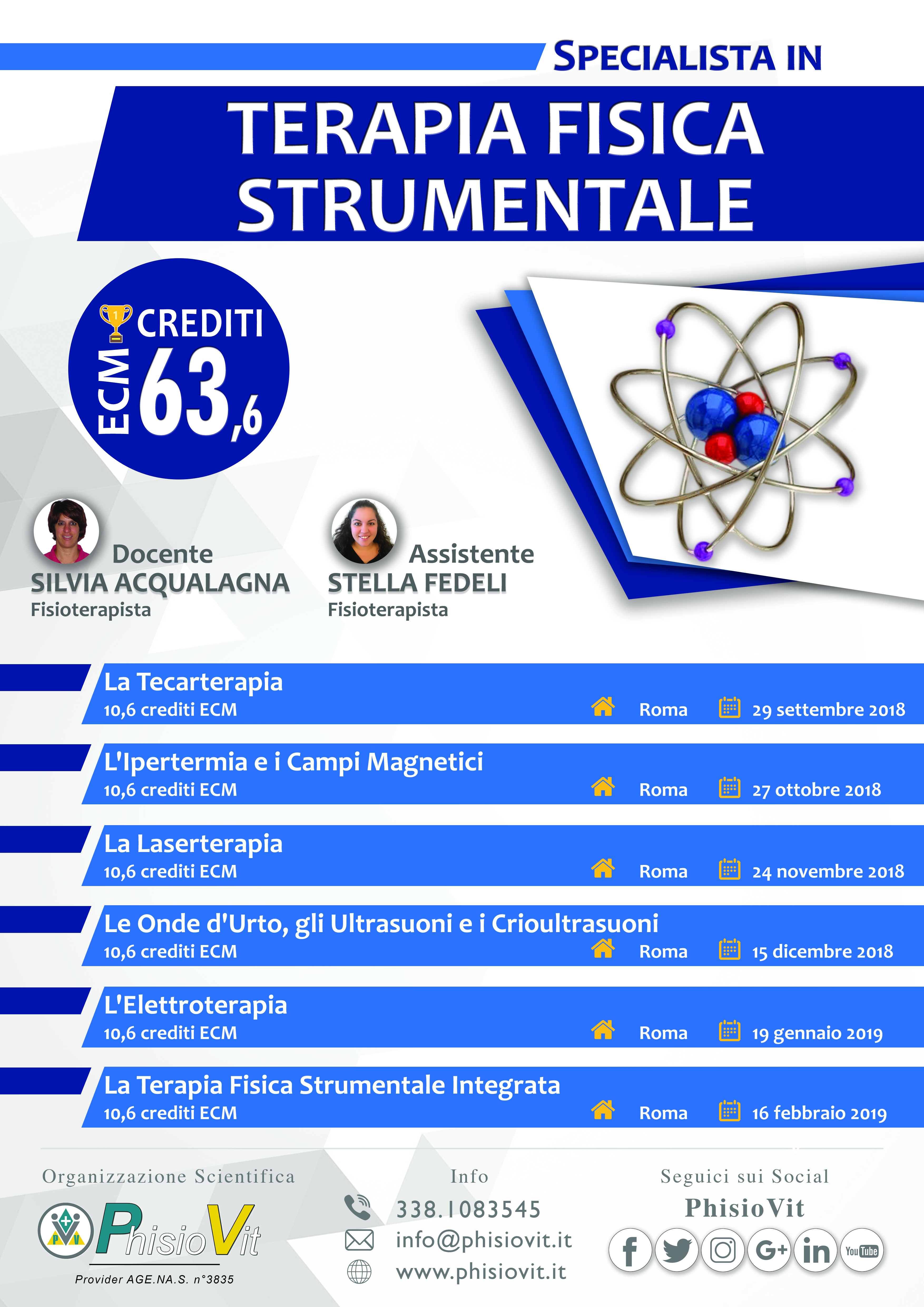 Specialista in Terapia Fisica Strumentale è un progetto didattico che mira a formare i professionisti dell'area riabilitativa e rieducativa nella terapia fisica strumentale, include un pacchetto promozionale di sei corsi ed eroga complessivamente 63,6 crediti ECM. I sei eventi inclusi sono: "La Tecarterapia", 10,6 crediti ECM, Roma 29 settembre 2018, "L'Ipertermia e i Campi Magnetici", 10,6 crediti ECM, Roma 27 ottobre 2018, "La Laserterapia", 10,6 crediti ECM, Roma 24 novembre 2018, "Le Onde d'Urto, gli Ultrasuoni e i Crioultrasuoni", 10,6 crediti ECM, Roma 15 dicembre 2018, "L'Elettroterapia", 10,6 crediti ECM, Roma 19 gennaio 2019 e "Utilità della Terapia Fisica Strumentale nelle patologie fisioterapiche", 10,6 crediti ECM, Roma 16 febbraio 2019.