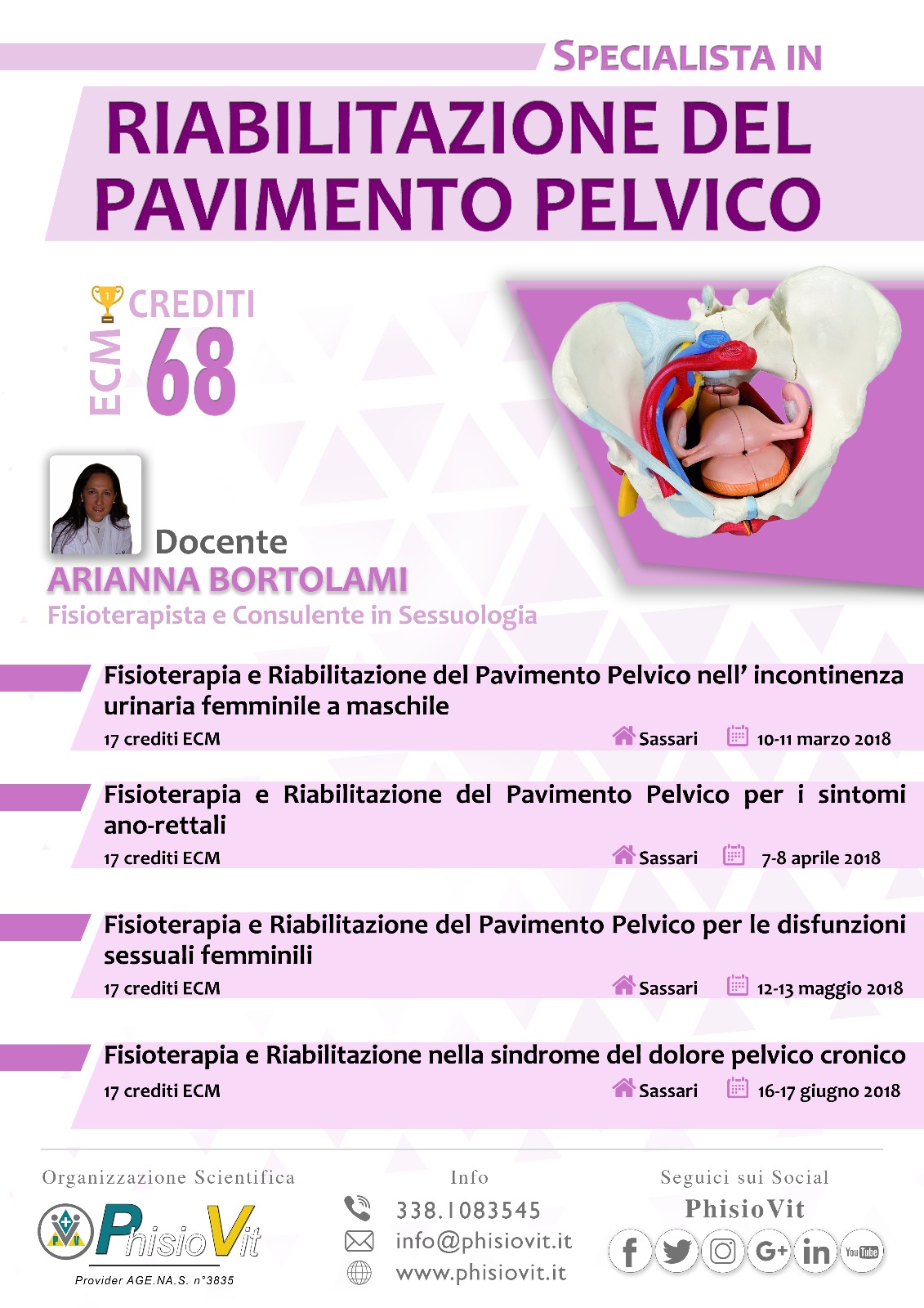 Specialista in Riabilitazione del Pavimento Pelvico è un progetto didattico che mira a formare i professionisti dell'area riabilitativa e rieducativa nella fisioterapia e nella riabilitazione del pavimento pelvico, include un pacchetto promozionale di quattro corsi ed eroga complessivamente 68 crediti ECM. I quattro eventi inclusi sono: "Fisioterapia e riabilitazione del pavimento pelvico nell'incontinenza urinaria femminile e maschile", 17 crediti ECM, Sassari 10-11 Marzo 2018; "Fisioterapia e Riabilitazione del Pavimento Pelvico per i sintomi ano-rettali", 17 crediti ECM, Sassari 7-8 Aprile 2018; "Fisioterapia e Riabilitazione del Pavimento Pelvico per le disfunzioni sessuali femminili", 17 crediti ECM, Sassari 12-13 Maggio 2018 e "Fisioterapia e Riabilitazione nella sindrome del dolore pelvico cronico", 17 crediti ECM, Sassari 16-17 Giugno 2018.