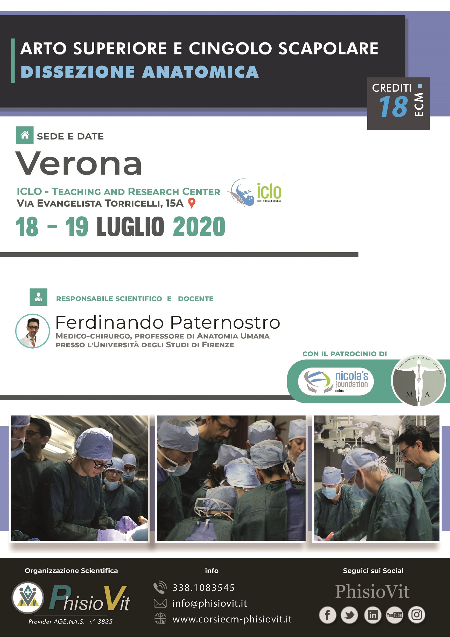 E' indubbio che oggigiorno il professionista in riabilitazione debba possedere una solida conoscenza anatomica dell'apparato muscoloscheletrico, al fine si saper orientare con maggiore cura e precisione il proprio atto terapeutico. In questo corso, partendo dall'anatomia di superficie, passando per quella topografica e attraverso la dissezione su cadavere sotto la guida del proprio tutor, si evidenzieranno le diverse strutture con la possibilità per il partecipante di saggiarle e palparle (hands-on) al fine di comprenderne ubicazione, forma, rapporti e avere così una migliore percezione della tridimensionalità del corpo umano. I discenti potranno effettuare differenti manovre e tecniche sul pezzo anatomico, evidenziando così la risposta articolare, muscolare e biomeccanica delle strutture coinvolte. In questo corso verrà effettuata la dissezione del cingolo scapolare, dell'arto superiore e della sua parte libera col preciso fine di evidenziare le strutture posteriori nel primo dei due giorni e quelle anteriori nel secondo.