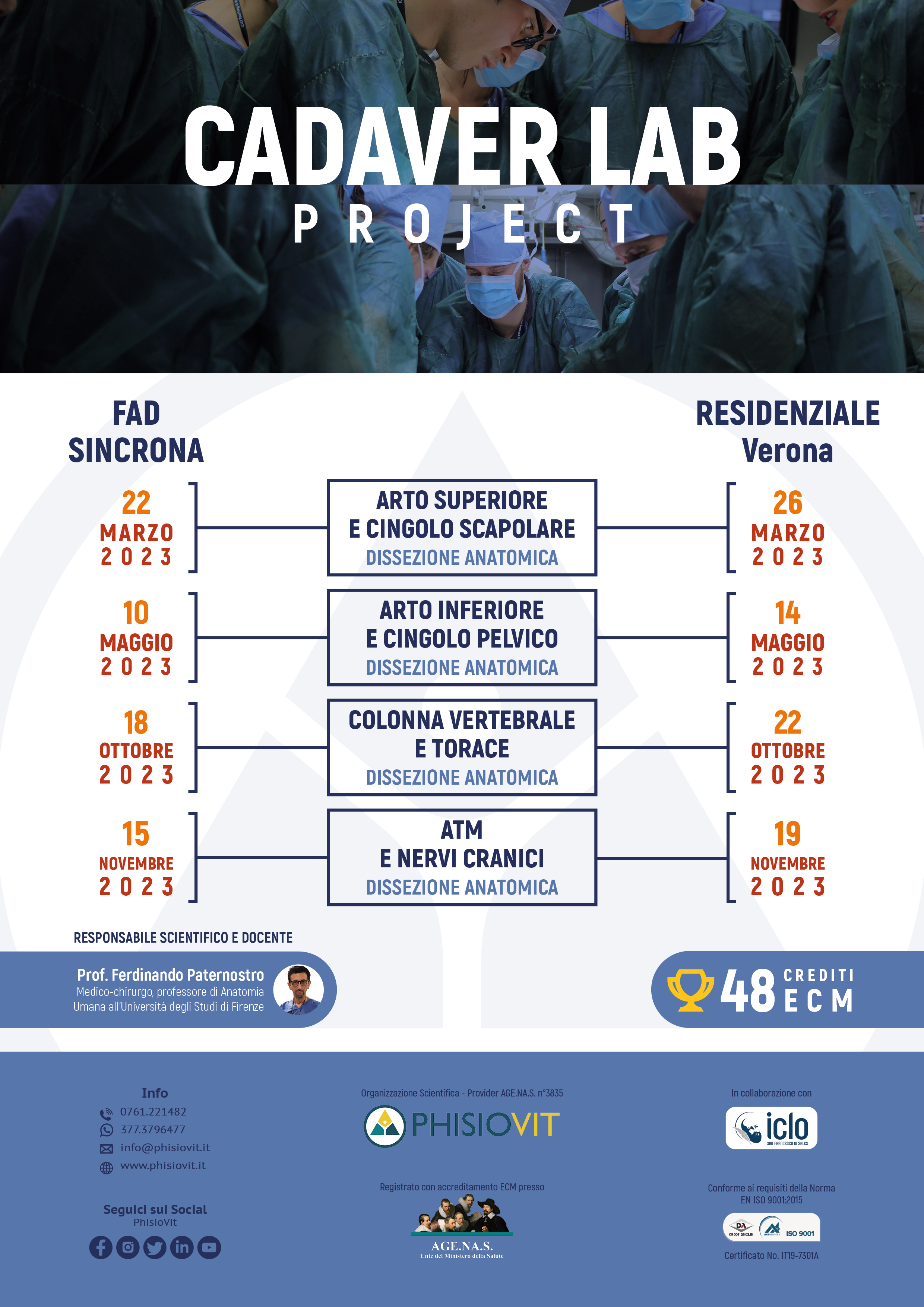 Cadaver Lab Project è un progetto didattico che mira a formare i professionisti dell'area medica, riabilitativa, rieducativa, sportiva e parasanitaria nello studio dell'anatomia umana attraverso la dissezione dell'arto superiore e del cingolo scapolare, dell'arto inferiore e del cingolo pelvico, della colonna vertebrale, del torace e dell'addome, dell'articolazione temporomandibolare e dei nervi cranici. Include un pacchetto promozionale di quattro corsi ed eroga complessivamente 48 crediti ECM. I quattro eventi inclusi sono: "Arto Superiore e Cingolo Scapolare: Dissezione Anatomica", 12 crediti ECM con FAD sincrona mercoledì 22 marzo 2023 e giornata in presenza a Verona domenica 26 marzo 2023; "Arto Inferiore e Cingolo Pelvico: Dissezione Anatomica", 12 crediti ECM con FAD sincrona mercoledì 10 maggio 2023 e giornata in presenza a Verona domenica 14 maggio 2023; "Colonna Vertebrale e Torace: Dissezione Anatomica", 12 crediti ECM, con FAD sincrona mercoledì 18 ottobre 2023 e giornata in presenza a Verona domenica 22 ottobre 2023; "ATM e Nervi Cranici: Dissezione Anatomica", 12 crediti ECM, con FAD sincrona mercoledì 15 novembre 2023 e giornata in presenza a Verona domenica 19 novembre 2023. La formazione sincrona in diretta anticipatoria delle lezioni in presenza in aula settoria serve ad introdurre gli argomento, a studiare i principi cardine dell'anatomia, a recuperare concetti base di anatomia muscoloscheletrica e a garantire una prima preparazione allo studente attraverso un'interazione diretta col docente e con gli altri discenti in vista degli incontri in presenza nelle aule sede delle dissezioni anatomiche.