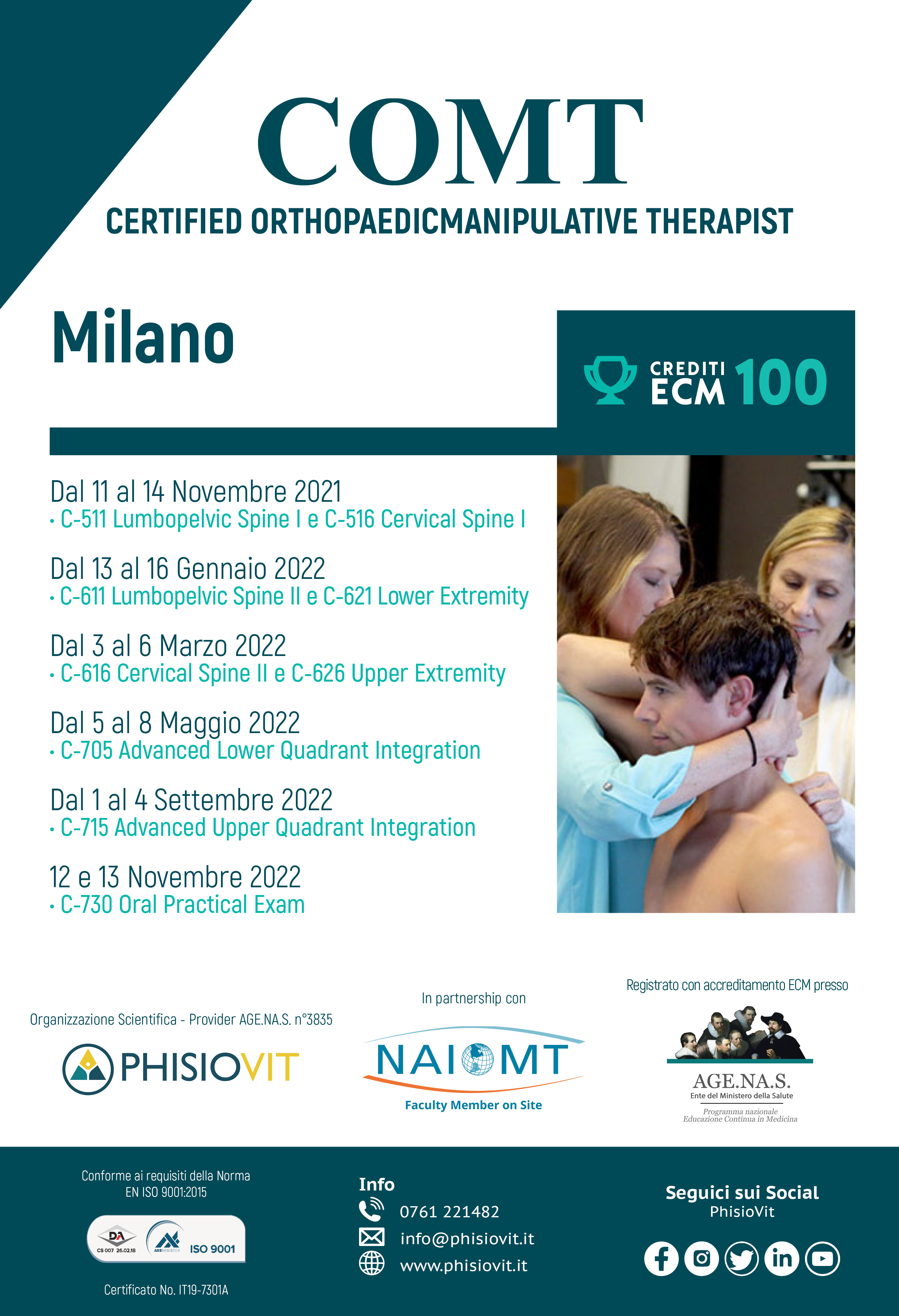 NAIOMT - North American Institute of Orthopaedic Manual Therapy -, uno dei più importanti e riconosciuti istituti mondiali di terapia manuale ortopedica, e PhisioVit sono da molti anni legati in Italia da una solida partnership volta ad offrire programmi formativi in terapia manuale ortopedica (Orthopaedic Manual Therapy - OMT) aggiornati con le più recenti conoscenze e supportati dalle migliori evidenze scientifiche. L'offerta didattica che ne è derivata, avviene attraverso l'organizzazione di questa percorso di certificazione internazionalmente riconosciuto da NAIOMT stessa e registrato con accreditamento ECM in Italia da PhisioVit presso Age.Na.S. - ente del Ministero della Salute: il COMT - Certified Orthopaedic Manipulative Therapist -. Si tratta di una formazione messa a punto negli anni nei minimi dettagli e che beneficia di varie edizioni precedenti: la didattica parte dalle basi per portare il discente non solo ad un livello dapprima intermedio e quindi avanzato in terapia manuale ortopedica, ma anche per fornirgli specifiche abilità di ragionamento clinico e approcci integrati di valutazione e gestione dei pazienti. Uno degli obiettivi principali è quello di costruire un'esplorazione dettagliata delle possibili eziologie alla base del deterioramento del movimento, della sua degradazione nel paziente e delle condizioni di salute che ne impediscono la piena partecipazione al lavoro e alle attività di vita quotidiana.