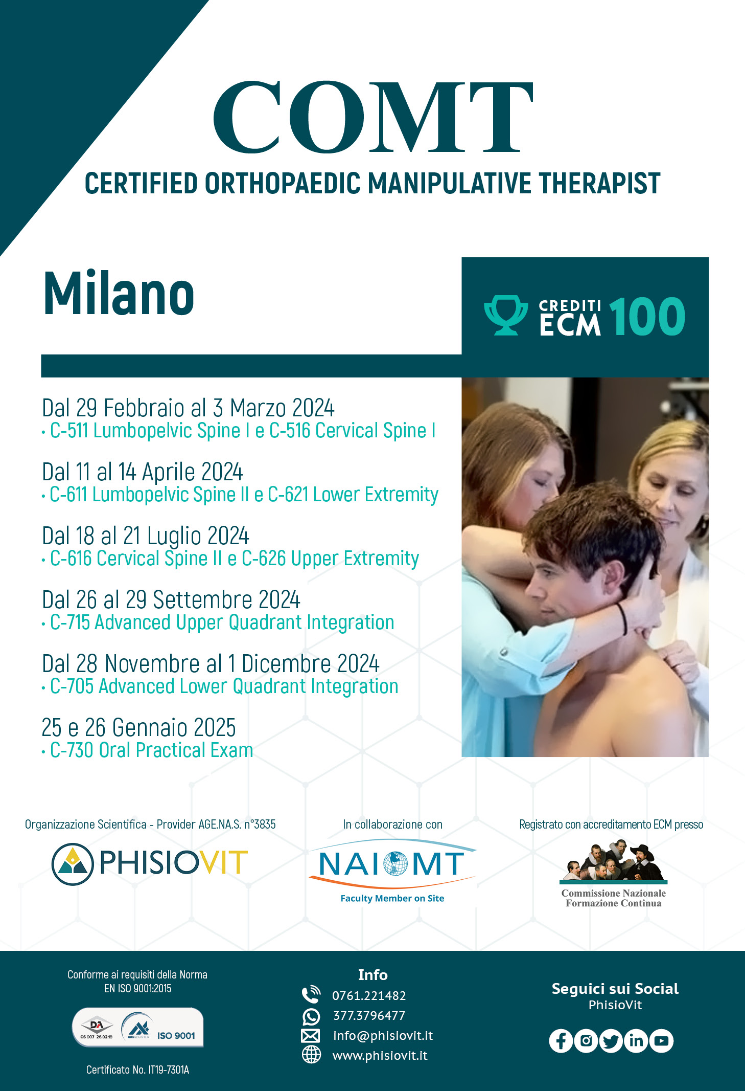 NAIOMT - North American Institute of Orthopaedic Manual Therapy - uno dei più importanti e riconosciuti istituti mondiali di terapia manuale ortopedica, e PhisioVit sono da molti anni legati in Italia da una solida partnership volta ad offrire programmi formativi in terapia manuale ortopedica (Orthopaedic Manual Therapy - OMT) aggiornati con le più recenti conoscenze e supportati dalle migliori evidenze scientifiche. L'offerta didattica che ne è derivata, avviene attraverso l'organizzazione di questo percorso di certificazione internazionalmente riconosciuto da NAIOMT stessa e registrato con accreditamento ECM in Italia da PhisioVit presso Age.Na.S. - ente del Ministero della Salute: il COMT - Certified Orthopaedic Manipulative Therapist. Si tratta di una formazione messa a punto negli anni nei minimi dettagli e che beneficia di varie edizioni precedenti: la didattica parte dalle basi per portare il discente non solo ad un livello dapprima intermedio e quindi avanzato in terapia manuale ortopedica, ma anche per fornirgli specifiche abilità di ragionamento clinico e approcci integrati di valutazione e gestione dei pazienti. Uno degli obiettivi principali è quello di costruire un'esplorazione dettagliata delle possibili eziologie alla base del deterioramento del movimento, della sua degradazione nel paziente e delle condizioni di salute che ne impediscono la piena partecipazione al lavoro e alle attività di vita quotidiana.