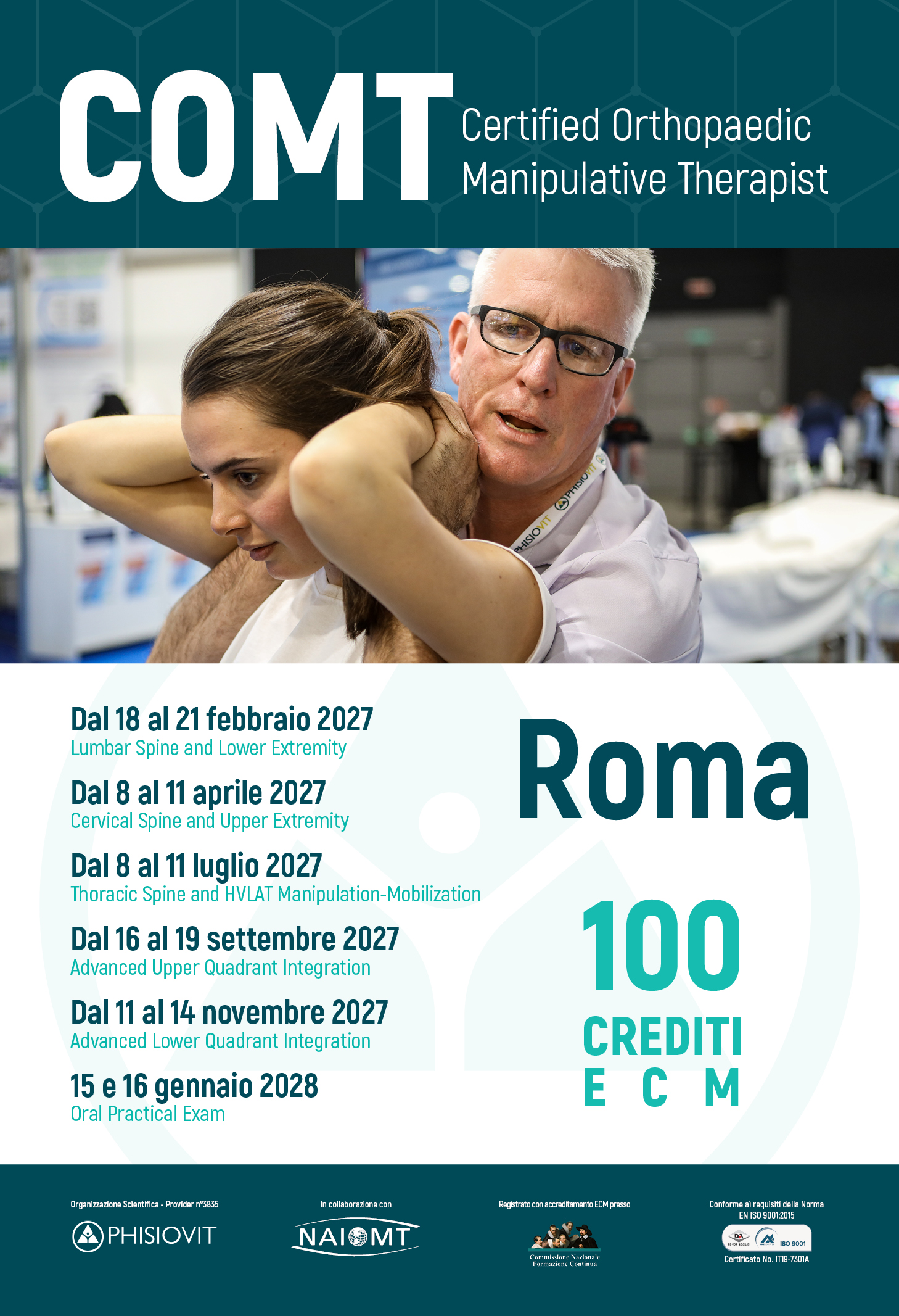 NAIOMT - North American Institute of Orthopaedic Manual Therapy - uno dei più importanti e riconosciuti istituti mondiali di terapia manuale ortopedica, e PhisioVit sono da molti anni legati in Italia da una solida partnership volta ad offrire programmi formativi in terapia manuale ortopedica (Orthopaedic Manual Therapy - OMT) aggiornati con le più recenti conoscenze e supportati dalle migliori evidenze scientifiche. L'offerta didattica che ne è derivata, avviene attraverso l'organizzazione di questo percorso di certificazione internazionalmente riconosciuto da NAIOMT stessa e registrato con accreditamento ECM in Italia da PhisioVit presso Age.Na.S. - ente del Ministero della Salute: il COMT - Certified Orthopaedic Manipulative Therapist. Si tratta di una formazione messa a punto negli anni nei minimi dettagli e che beneficia di varie edizioni precedenti: la didattica parte dalle basi per portare il discente non solo ad un livello dapprima intermedio e quindi avanzato in terapia manuale ortopedica, ma anche per fornirgli specifiche abilità di ragionamento clinico e approcci integrati di valutazione e gestione dei pazienti. Uno degli obiettivi principali è quello di costruire un'esplorazione dettagliata delle possibili eziologie alla base del deterioramento del movimento, della sua degradazione nel paziente e delle condizioni di salute che ne impediscono la piena partecipazione al lavoro e alle attività di vita quotidiana.