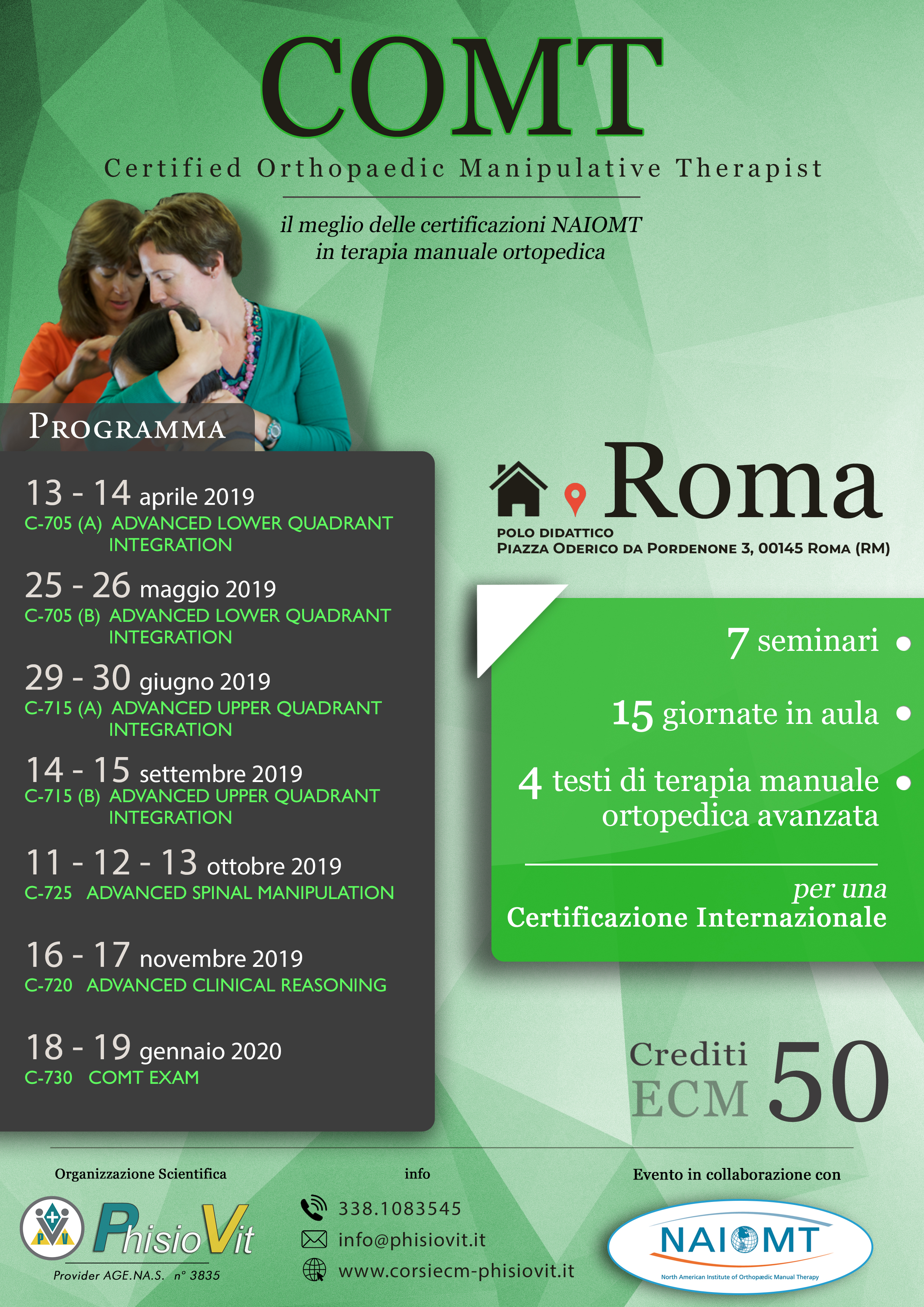 NAIOMT - North American Institute of Orthopaedic Manual Therapy - e PhisioVit si uniscono in Italia in una solida partnership didattica presentando la loro offerta formativa in Terapia Manuale Ortopedica (Orthopaedic Manual Therapy - OMT) attraverso l'organizzazione di questa certificazione internazionalmente riconosciuta da NAIOMT stessa e dalla Andrews University di Barrien Springs in Michigan - USA: il COMT - Certified Orthopaedic Manipulative Therapist -. Si tratta di un percorso di livello intermedio e avanzato in terapia manuale ortopedica accuratamente progettato per fornire al discente abilità avanzate di ragionamento clinico e approcci integrati di valutazione e gestione con la terapia manuale. Uno degli obiettivi principali verso i discenti è quello di costruire un'esplorazione dettagliata delle possibili eziologie alla base del deterioramento del movimento nel paziente e delle condizioni di salute che impediscono la piena partecipazione al lavoro e alla vita. Il quadrant system - sistema a quadrante - è il cuore della serie di seminari denominati Level 700 appartenenti al COMT - Certified Orthopaedic Manipulative Therapist -: durante le lezioni vengono analizzati problemi multiregionali complessi di pazienti con disordini del sistema neuromuscoloscheletrico in base ai vari modelli biomeccanici e neuromuscoloscheletrici disponibili. Vengono aggiunte alla pratica di ogni singolo discente lo sviluppo di una capacità di gestire pazienti focalizzandosi su un approccio multidimensionale che comprende tecniche di terapia manuale e altri interventi che riflettono un'integrazione delle competenze cliniche avanzate dei singoli istruttori, le preferenze dei pazienti e la ricerca sottoposta a peer review.