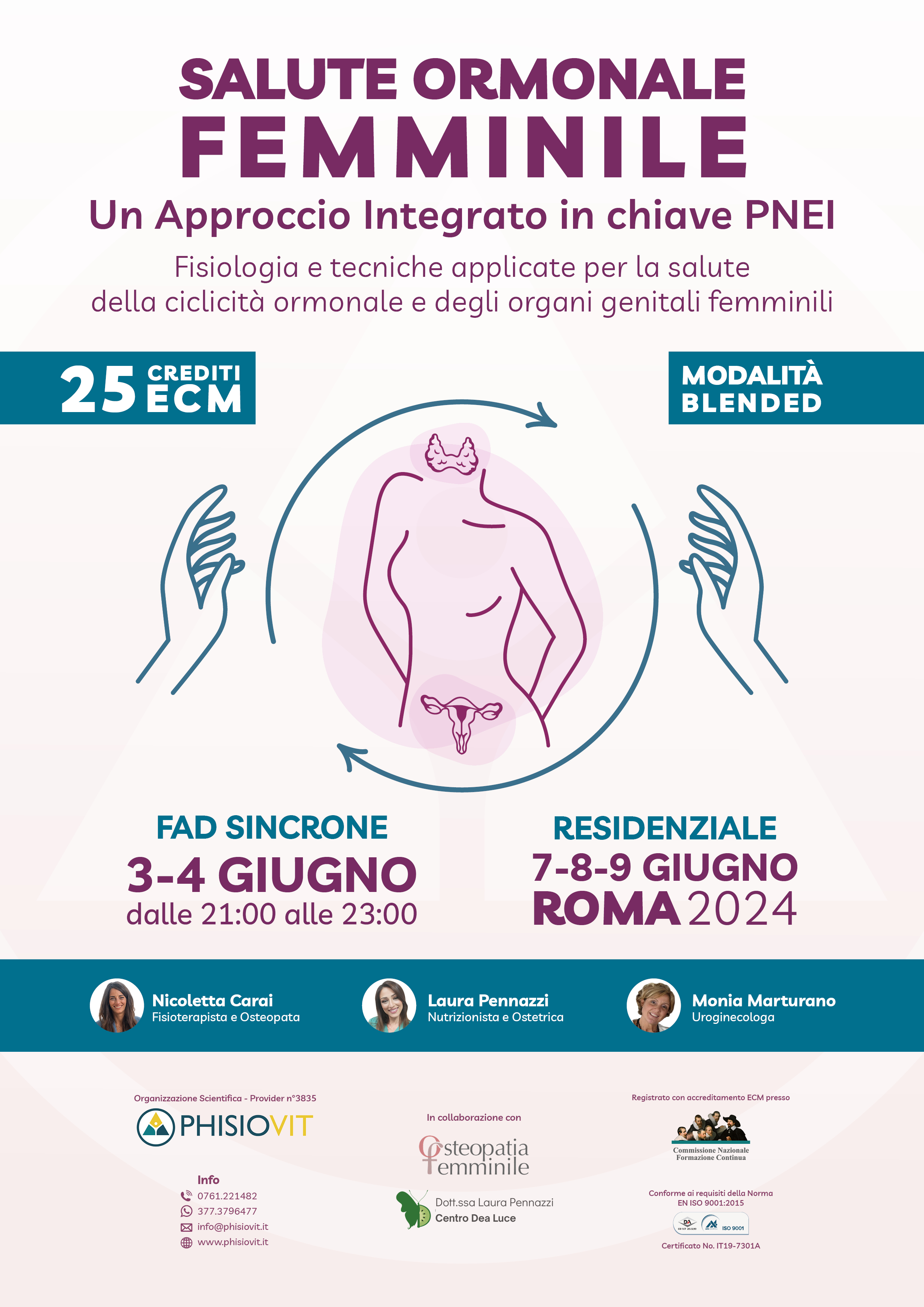 Il corso "Salute Ormonale Femminile: un Approccio Integrato in Chiave PNEI - Fisiologia e Tecniche Applicate per la Salute della Ciclicità Ormonale e degli Organi Genitali Femminili", si pone come obiettivo quello di fornire ai partecipanti un'ottica di tipo Psico-Neuro-Endocrino-Immunologica (PNEI) sul ciclo ormonale femminile: un approccio che integra il vissuto personale studiando le ripercussioni che lo stesso può avere da un punto di vista ormonale, strutturale, metabolico e funzionale. Fondamentale è sottolineare il lavoro d'équipe e capire qual è l'approccio di ciascuna figura sanitaria, così da creare un team di professionisti che lavorano con un obiettivo comune: mantenere o ristabilire il corretto equilibrio ormonale della donna. Le parti che compongono l'evento sono di natura teorica e pratica con laboratori guidati dal corpo docente, vengono fornite diverse nozioni affrontando tutti i vari approcci che possono essere utilizzati e che sono tesi al miglioramento della ciclicità femminile:
