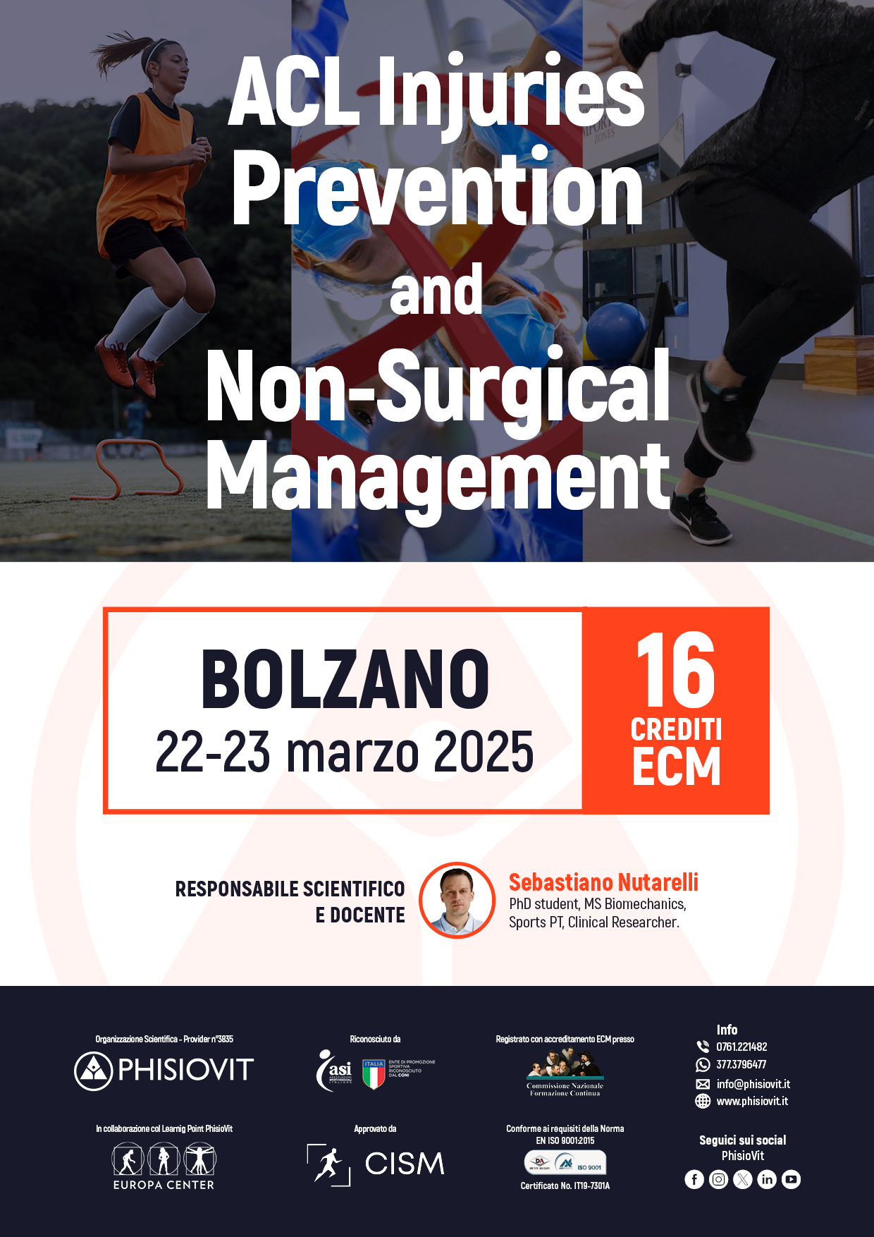 Il corso di due giorni "ACL Injuries Prevention and Non-Surgical Management" offre ai partecipanti l'opportunità di approfondire la gestione delle lesioni del legamento crociato anteriore (ACL), esplorando sia gli aspetti preventivi che quelli riabilitativi attraverso un approccio multidisciplinare e basato sulle evidenze.