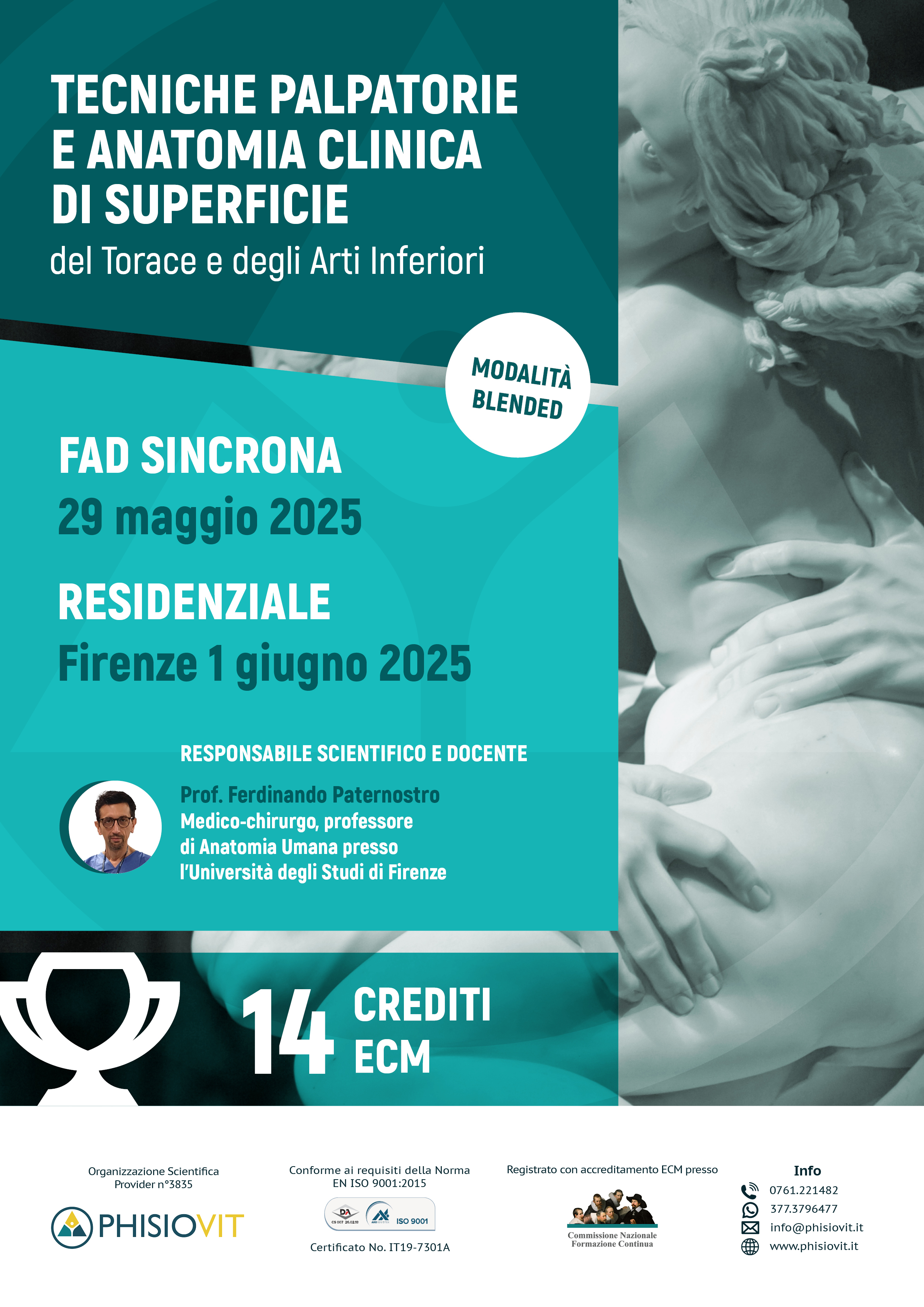 - STEP 1: si inizia con una FAD sincrona in diretta e interattiva della durata di due ore condotta dal Prof. Dott. Ferdinando Paternostro giovedì 29 maggio 2025 dalle 21.00 alle 23.00. A seguito dell'iscrizione si riceve un link per accedere nel giorno e all'orario prestabilito all'aula virtuale. Questa formazione serve a introdurre l'argomento, a studiare i principi cardine dell'anatomia, a recuperare concetti base di anatomia muscoloscheletrica e a garantire una prima preparazione allo studente attraverso un'interazione diretta col docente e con gli altri discenti in vista dell'incontro in aula fisica.