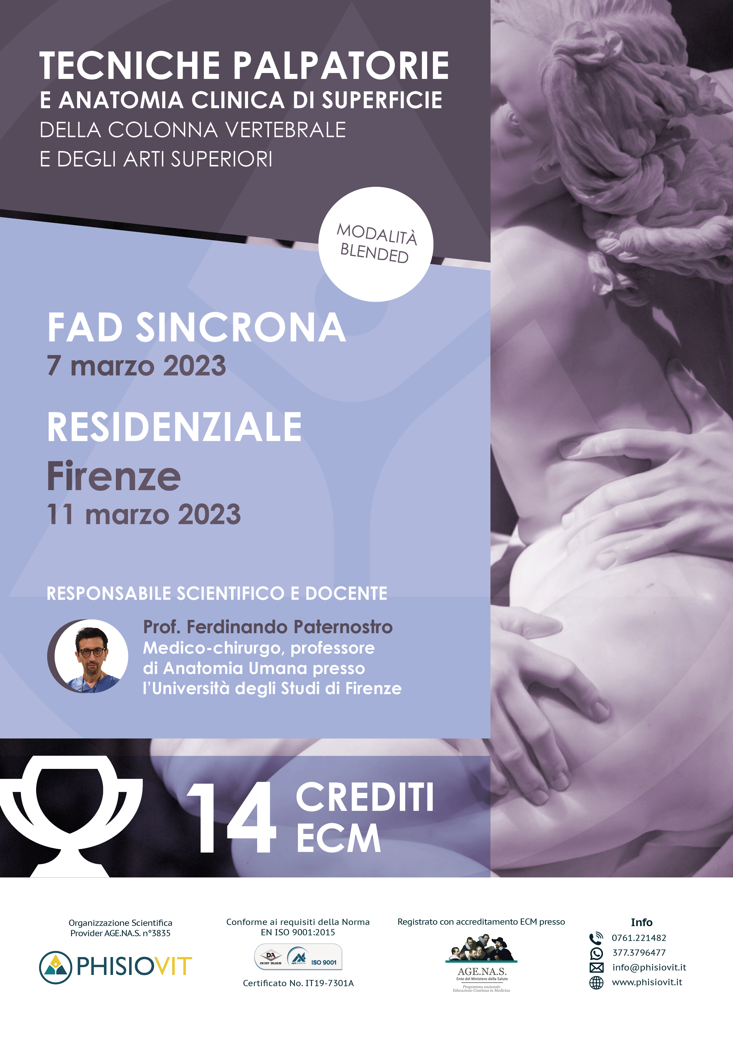 Nel quotidiano del professionista sanitario che si occupa a tutti i livelli di riabilitazione o del trainer che valorizza e allena le abilità del corpo umano, la capacità di orientarsi topograficamente attraverso le tecniche di palpazione è un imprescindibile e preziosissimo prerequisito: l'anatomia palpatoria consente infatti di comprendere la localizzazione e la disposizione di un numero incredibile di strutture destinatarie poi di atto riabilitativo, terapeutico o allenante. Per questi motivi il corso fornisce conoscenze e competenze qualificanti sia per gli operatori della sanità che per chi ha a che fare quotidianamente con l'allenamento di strutture anatomiche coinvolte in processi funzionali: è quindi rivolto in particolare a medici, fisioterapisti, infermieri, tecnici ortopedici, tecnici radiologi, laureati in scienze motorie e personale parasanitario.