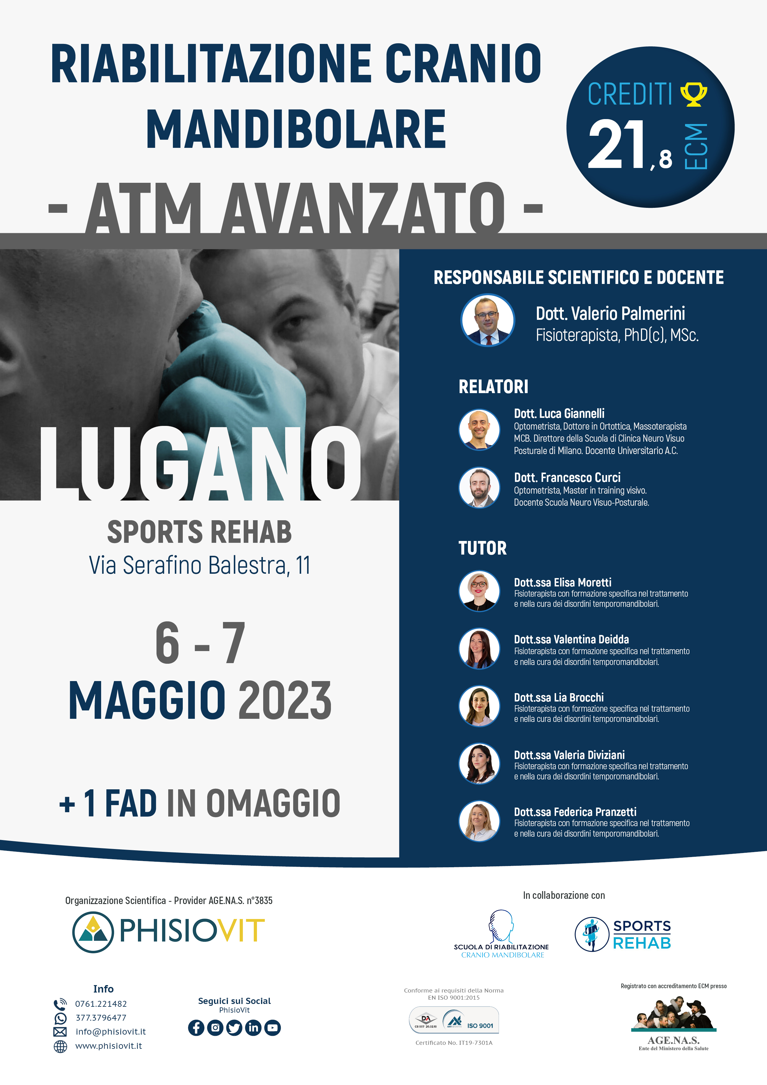 I vari livelli della scuola di riabilitazione cranio mandibolare offrono piani formativi completi per professionisti sanitari sui disordini temporomandibolari, dolore orofacciale e loro riabilitazione multidisciplinare, permettendo al discente una crescita ampia, graduale ed accurata. Durante la mattina del primo giorno del corso avanzato, dopo un riepilogo del livello precedente, viene approfondita la terza branca del trigemino, quella mandibolare, seguita dall'esecuzione di tecniche profonde come le Intraoral Myofascial Techniques; viene anche proposta la tecnica di riduzione manuale del disco dislocato, contestualizzata nell'adeguata fase terapeutica. Nel pomeriggio poi, spazio alla seconda branca del trigemino, al palato con l'illustrazione delle famiglie di bite più utilizzati e loro funzione. La prima giornata si conclude con la spiegazione dell'Axis II, col completamento del protocollo valutativo Diagnostic Criteria già introdotto nel livello base e con la distribuizione dei questionari utili ad un più ampio e corretto inquadramento del paziente con disordine temporomandibolare anche sotto un'ottica biopsicosociale. La mattina del secondo giorno è dedicata alle relazioni dell'ATM con lingua, osso ioide e reciproche influenze, accompagnata da una ricca parte pratica di tecniche manuali per i muscoli ioidei e integrata da semplici ma efficaci integrazioni di terapia miofunzionale. Nel pomeriggio poi, si completa l'approfondimento del nervo trigemino con la prima branca, quella oftalmica, impreziosito dall'esecuzione dei test neurovisuoposturali. La giornata si conclude con il capitolo dedicato al nervo faciale e ad alcune delle strategie riabilitative emergenti sia da un punto di vista clinico che di letteratura scientifica.