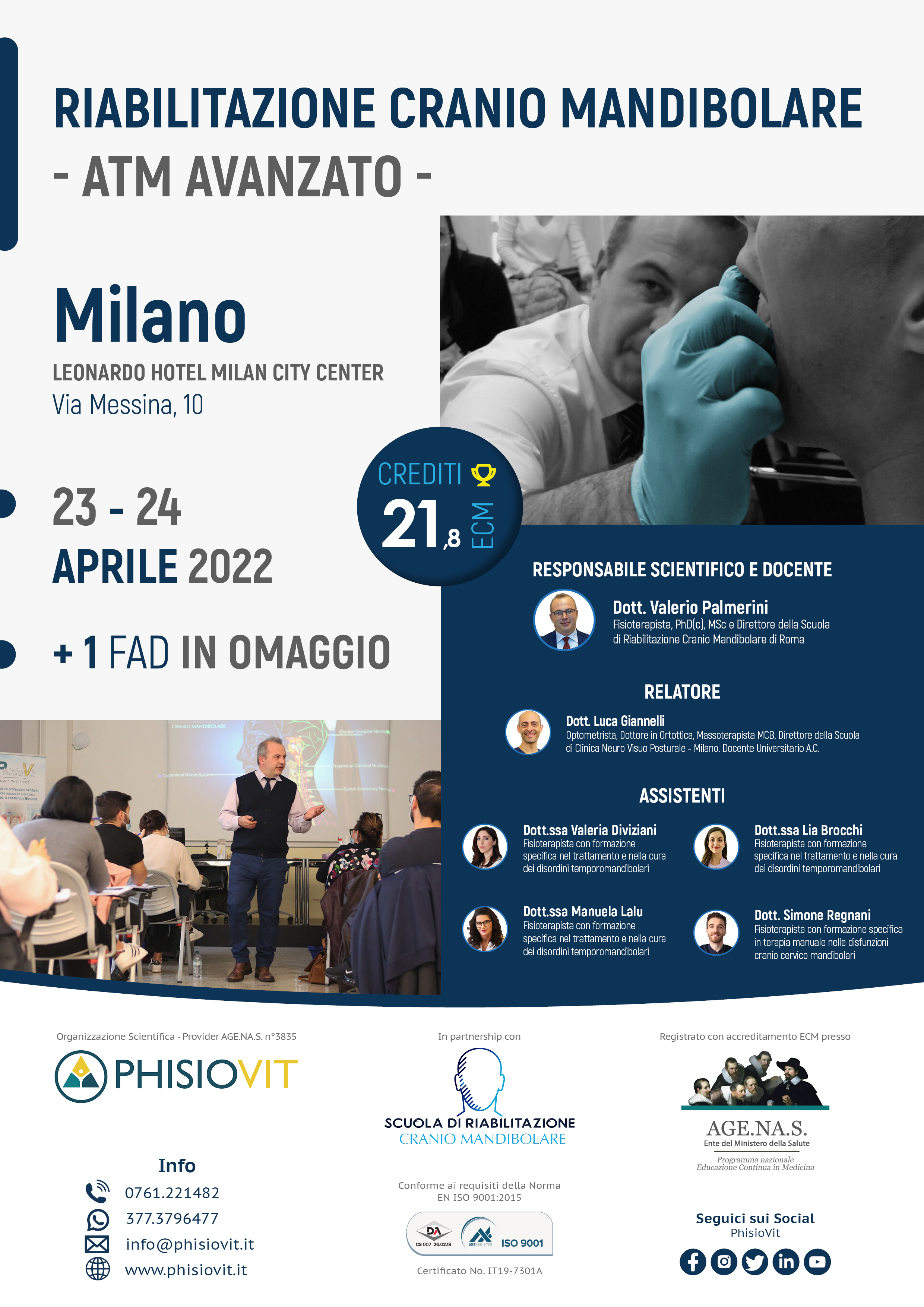 I vari livelli della scuola di riabilitazione cranio mandibolare offrono piani formativi completi per professionisti sanitari sui disordini temporomandibolari, dolore orofacciale e loro riabilitazione multidisciplinare, permettendo al discente una crescita ampia, graduale ed accurata. Durante la mattina del primo giorno del corso avanzato, dopo un riepilogo del livello precedente, viene approfondita la terza branca del trigemino, quella mandibolare, seguita dall'esecuzione di tecniche profonde come le Intraoral Myofascial Techniques; viene anche proposta la tecnica di riduzione manuale del disco dislocato, contestualizzata nell'adeguata fase terapeutica. Nel pomeriggio poi, spazio alla seconda branca del trigemino, al palato con l'illustrazione delle famiglie di bite più utilizzati e loro funzione. La prima giornata si conclude con la spiegazione dell'Axis II, col completamento del protocollo valutativo Diagnostic Criteria già introdotto nel livello base e con la distribuizione dei questionari utili ad un più ampio e corretto inquadramento del paziente con disordine temporomandibolare anche sotto un'ottica biopsicosociale. La mattina del secondo giorno è dedicata alle relazioni dell'ATM con lingua, osso ioide e reciproche influenze, accompagnata da una ricca parte pratica di tecniche manuali per i muscoli ioidei e integrata da semplici ma efficaci integrazioni di terapia miofunzionale. Nel pomeriggio poi, si completa l'approfondimento del nervo trigemino con la prima branca, quella oftalmica, impreziosito dall'esecuzione dei test neurovisuoposturali. La giornata si conclude con il capitolo dedicato al nervo faciale e ad alcune delle strategie riabilitative emergenti sia da un punto di vista clinico che di letteratura scientifica.