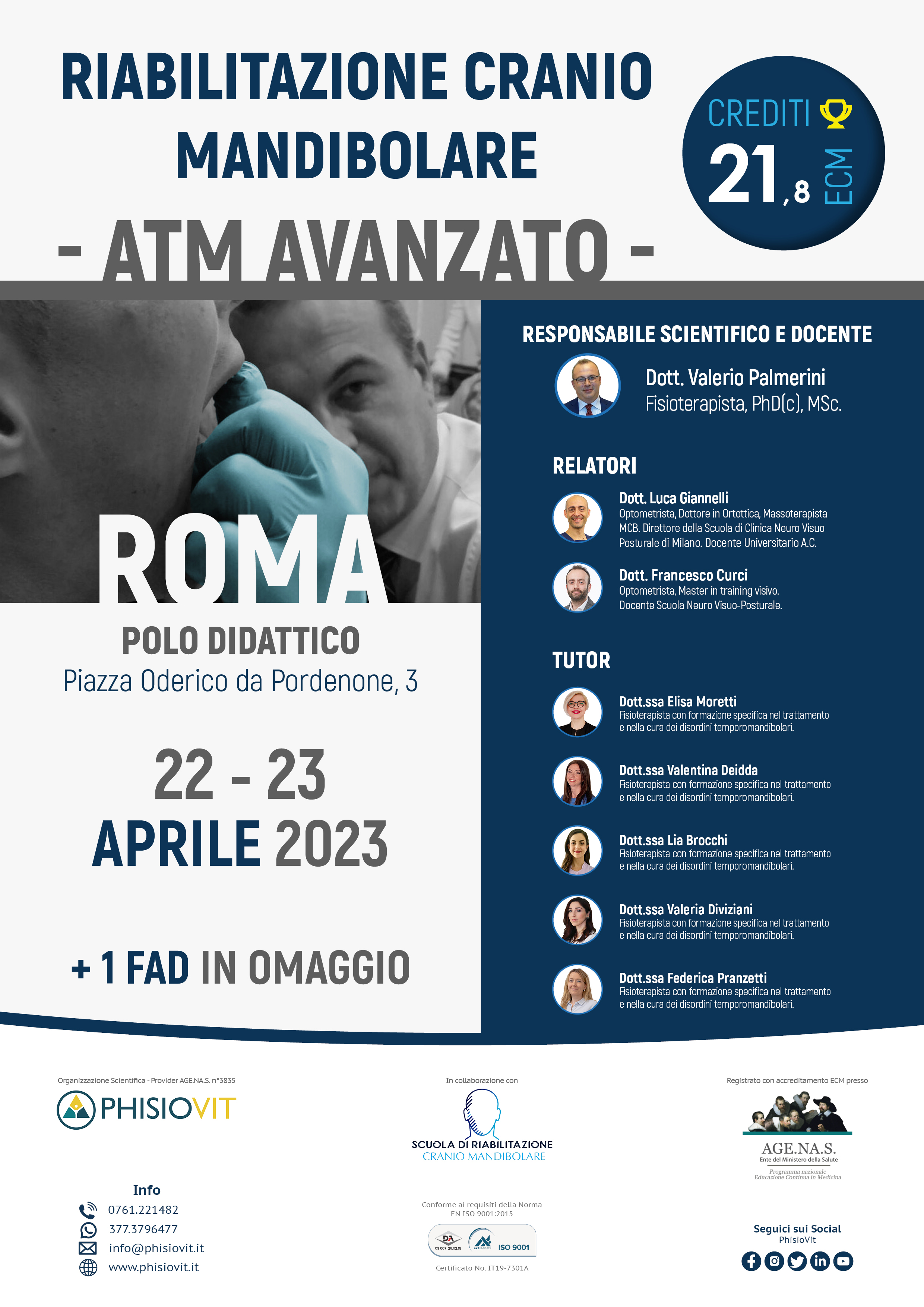 I vari livelli della scuola di riabilitazione cranio mandibolare offrono piani formativi completi per professionisti sanitari sui disordini temporomandibolari, dolore orofacciale e loro riabilitazione multidisciplinare, permettendo al discente una crescita ampia, graduale ed accurata. Durante la mattina del primo giorno del corso avanzato, dopo un riepilogo del livello precedente, viene approfondita la terza branca del trigemino, quella mandibolare, seguita dall'esecuzione di tecniche profonde come le Intraoral Myofascial Techniques; viene anche proposta la tecnica di riduzione manuale del disco dislocato, contestualizzata nell'adeguata fase terapeutica. Nel pomeriggio poi, spazio alla seconda branca del trigemino, al palato con l'illustrazione delle famiglie di bite più utilizzati e loro funzione. La prima giornata si conclude con la spiegazione dell'Axis II, col completamento del protocollo valutativo Diagnostic Criteria già introdotto nel livello base e con la distribuizione dei questionari utili ad un più ampio e corretto inquadramento del paziente con disordine temporomandibolare anche sotto un'ottica biopsicosociale. La mattina del secondo giorno è dedicata alle relazioni dell'ATM con lingua, osso ioide e reciproche influenze, accompagnata da una ricca parte pratica di tecniche manuali per i muscoli ioidei e integrata da semplici ma efficaci integrazioni di terapia miofunzionale. Nel pomeriggio poi, si completa l'approfondimento del nervo trigemino con la prima branca, quella oftalmica, impreziosito dall'esecuzione dei test neurovisuoposturali. La giornata si conclude con il capitolo dedicato al nervo faciale e ad alcune delle strategie riabilitative emergenti sia da un punto di vista clinico che di letteratura scientifica.