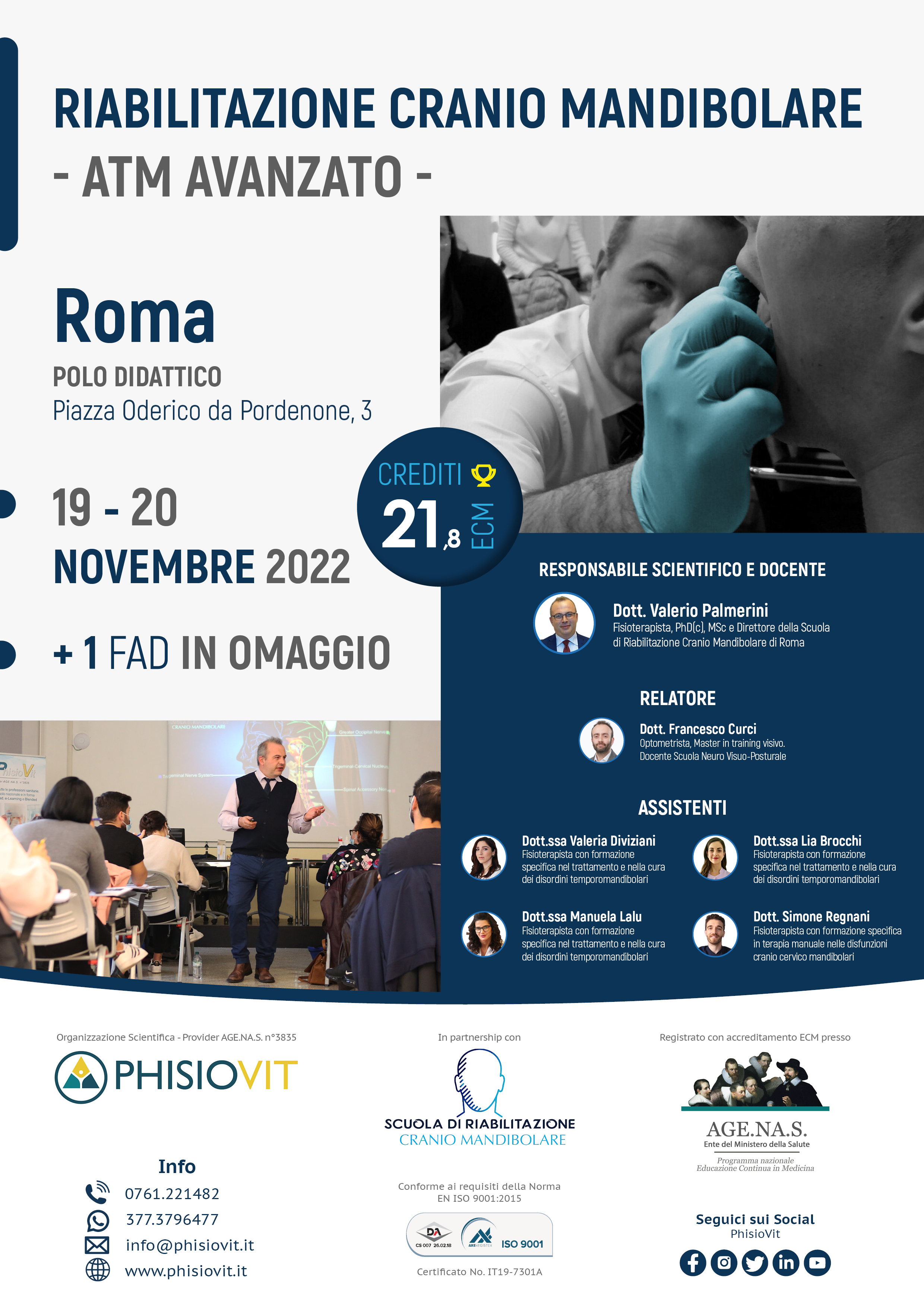I vari livelli della scuola di riabilitazione cranio mandibolare offrono piani formativi completi per professionisti sanitari sui disordini temporomandibolari, dolore orofacciale e loro riabilitazione multidisciplinare, permettendo al discente una crescita ampia, graduale ed accurata. Durante la mattina del primo giorno del corso avanzato, dopo un riepilogo del livello precedente, viene approfondita la terza branca del trigemino, quella mandibolare, seguita dall'esecuzione di tecniche profonde come le Intraoral Myofascial Techniques; viene anche proposta la tecnica di riduzione manuale del disco dislocato, contestualizzata nell'adeguata fase terapeutica. Nel pomeriggio poi, spazio alla seconda branca del trigemino, al palato con l'illustrazione delle famiglie di bite più utilizzati e loro funzione. La prima giornata si conclude con la spiegazione dell'Axis II, col completamento del protocollo valutativo Diagnostic Criteria già introdotto nel livello base e con la distribuizione dei questionari utili ad un più ampio e corretto inquadramento del paziente con disordine temporomandibolare anche sotto un'ottica biopsicosociale. La mattina del secondo giorno è dedicata alle relazioni dell'ATM con lingua, osso ioide e reciproche influenze, accompagnata da una ricca parte pratica di tecniche manuali per i muscoli ioidei e integrata da semplici ma efficaci integrazioni di terapia miofunzionale. Nel pomeriggio poi, si completa l'approfondimento del nervo trigemino con la prima branca, quella oftalmica, impreziosito dall'esecuzione dei test neurovisuoposturali. La giornata si conclude con il capitolo dedicato al nervo faciale e ad alcune delle strategie riabilitative emergenti sia da un punto di vista clinico che di letteratura scientifica.