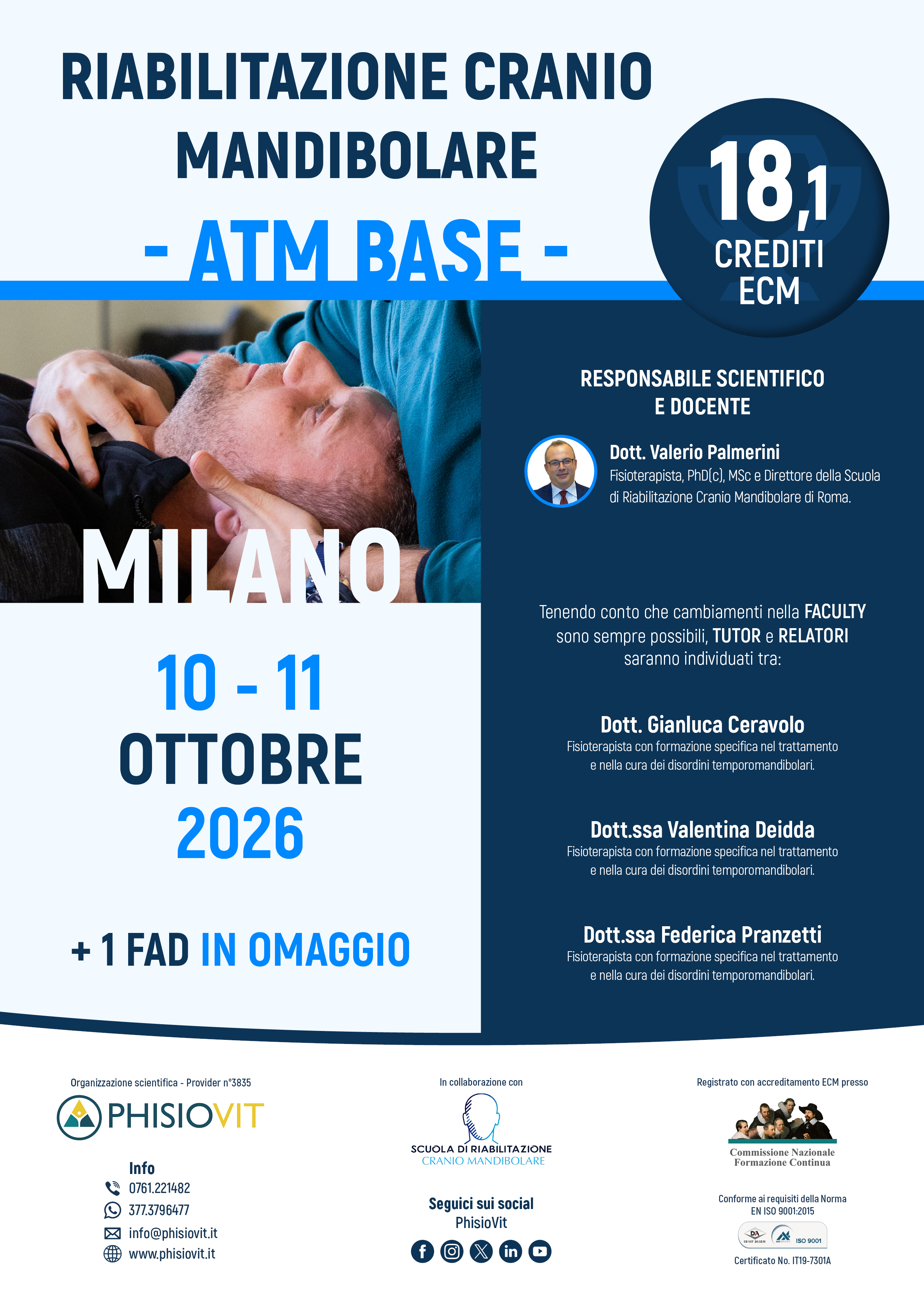 I vari livelli della scuola di riabilitazione cranio mandibolare offrono piani formativi completi per professionisti sanitari sui disordini temporomandibolari, dolore orofacciale e loro riabilitazione multidisciplinare, permettendo al discente una crescita ampia, graduale e accurata. Durante la mattina del primo giorno del corso base, dopo un'introduzione di anatomia e biomeccanica, viene ampiamente discussa la fisiopatologia di un disordine cranio mandibolare, con attenzione particolare alle due condizioni più diffuse, ovvero la dislocazione di disco e il lock, e loro valutazione. La valutazione proposta nel corso segue le indicazione della Diagnostic Criteria for Temporomandibular Disorders (TMD), procedura validata e riconosciuta a livello internazionale, di cui viene consegnata al discente cartella clinica, algoritmo decisionale e strumento di misurazione dei movimenti mandibolari. Il pomeriggio è poi all'insegna dell'esecuzione e della pratica delle tecniche di terapia manuale, sia articolare che miofasciale, sostenute dalla letteratura scientifica di settore, oltreché sintesi della miglior Evidence Based Practice (EBP). Il secondo giorno è invece dedicato alle relazioni fondamentali dell'ATM con il rachide cervicale e le reciproche influenze, con il cranio e il sintomo più frequente nei DTM, la cefalea, attraverso un inquadramento come proposto dalla International Headache Society e associata valutazione fisioterapica secondo letteratura aggiornata. Oltre a tecniche di terapia manuale specifiche per la cefalea e di efficacia sostenuta dalla letteratura, vengono mostrati esercizi terapeutici da integrare nella terapia del paziente, sia in presenza del terapista, sia come home treatment. Ampio risalto viene dato inoltre agli aspetti comunicativi e comportamentali da porre in essere col paziente con disordine temporomandibolare.