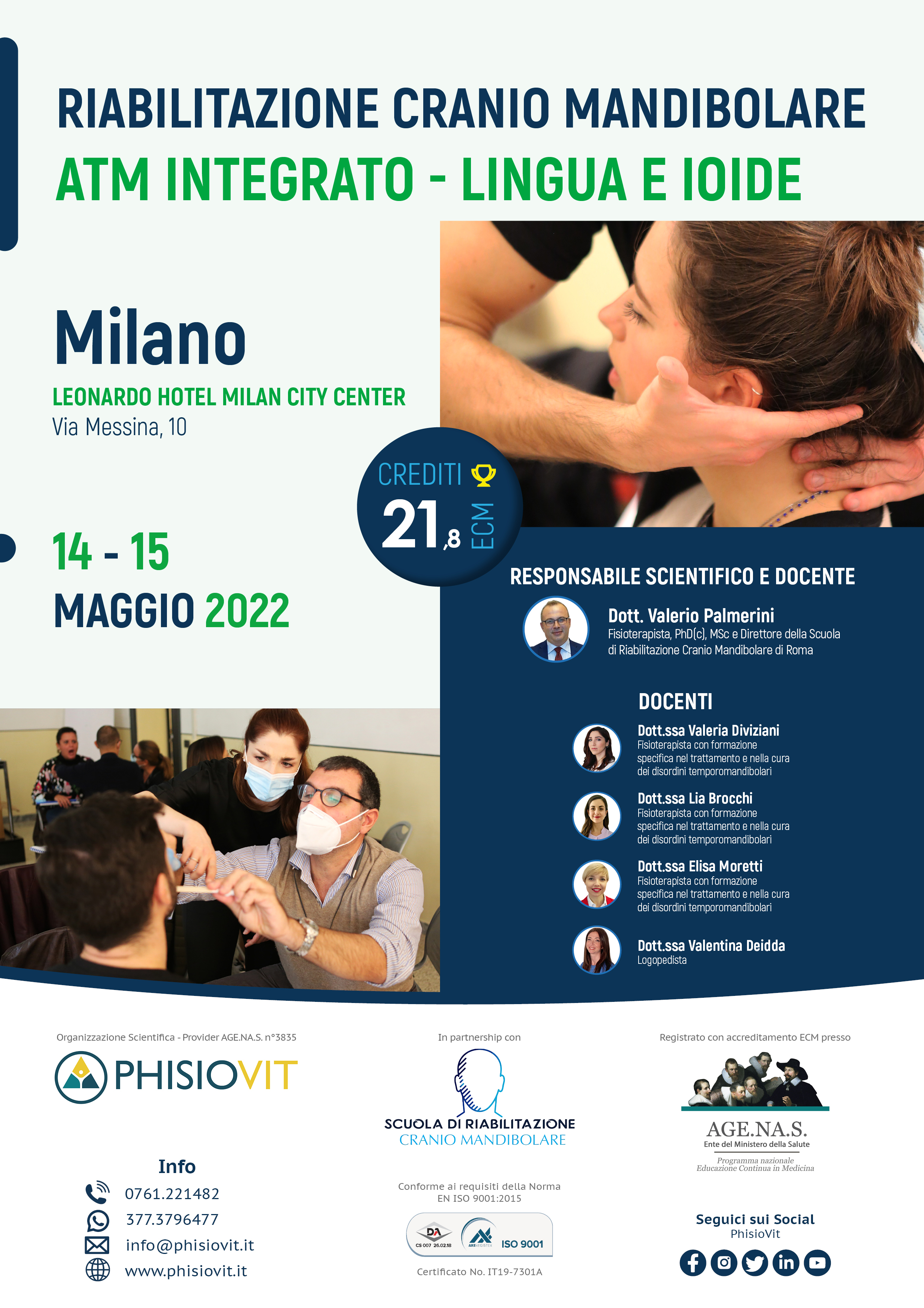 I vari livelli della scuola di riabilitazione cranio mandibolare offrono piani formativi completi per professionisti sanitari sui disordini temporomandibolari, dolore orofacciale e loro riabilitazione multidisciplinare, permettendo al discente una crescita ampia, graduale ed accurata. La mattina del primo giorno del corso integrato - lingua e ioide, è dedicata ad introdurre al meglio il partecipante a riconoscere segni e sintomi della sfera otorinolaringoiatrica nei pazienti con disordine temporomandibolare, attraverso esercizi terapeutici e valutativi semplici, pratici ed efficaci. Spostandosi dalle componenti della crescita facciale a come funziona la voce e alla deglutizione, già nel pomeriggio della prima giornata si passa all'approfondimento del palato e della lingua, dello stretto legame anatomico, funzionale nonché disfunzionale che li correla per cui viene offerta un'ampia antologia di tecniche terapeutiche miofunzionali sostenute dalla più recente letteratura. La mattina del secondo giorno è dedicata alle relazioni dell'ATM con l'osso ioide e reciproche influenze, accompagnata da una ricca parte pratica di tecniche manuali per i muscoli ioidei che precede l'innovativa lezione sulla voce, sulla sua fisiologia, sulla sua valutazione e su principi di trattamento validati. Nel pomeriggio poi viene trattata la relazione fra ATM, respirazione e disordini del sonno, in modo particolare insistendo su un argomento molto attuale e sentito dalla popolazione quale le apnee notturne.