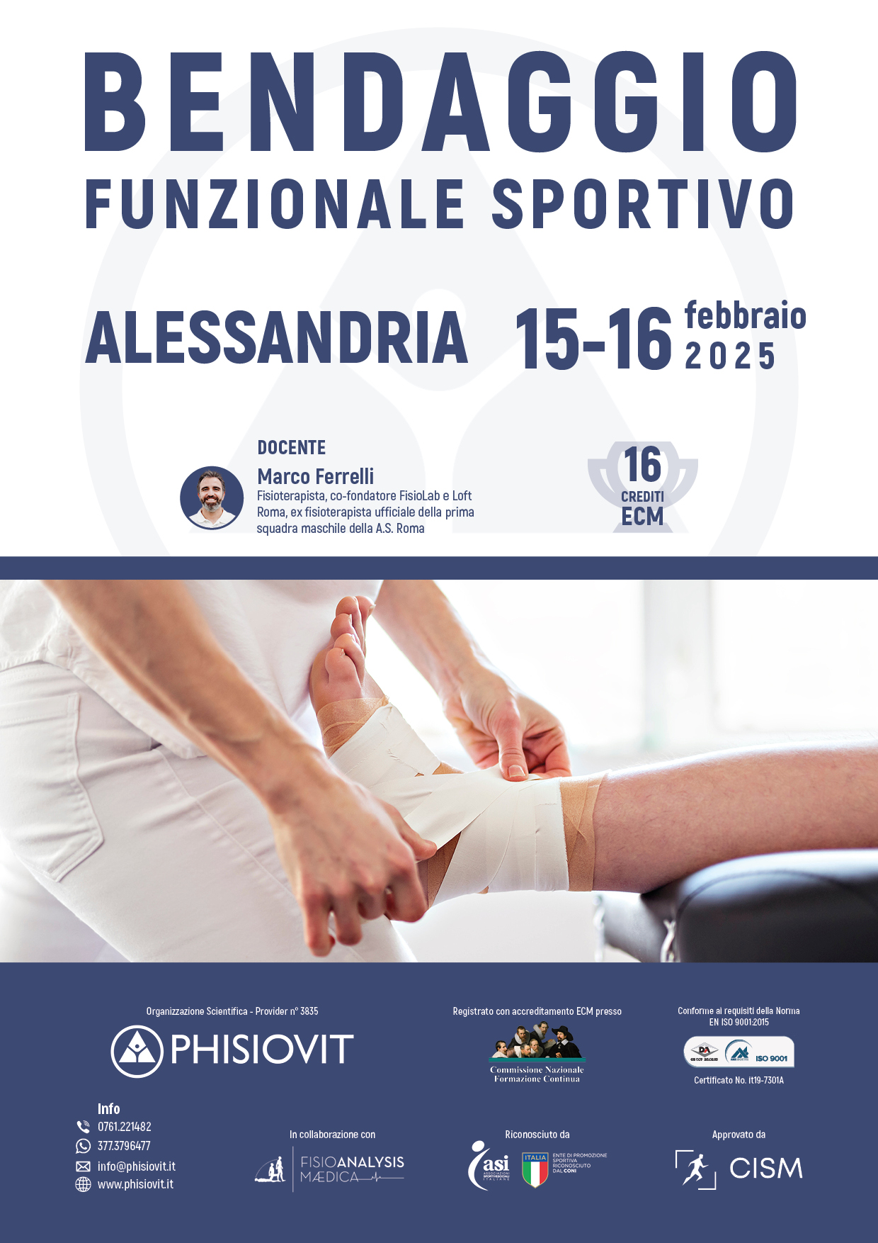 Durante il corso vengono descritte tutte le tecniche maggiormente utilizzate nella pratica clinica, con particolare attenzione alla struttura anatomica e alla fisiologia articolare. Il confezionamento di un buon bendaggio funzionale prevede l'utilizzo di diversi materiali combinati tra loro; la sovrapposizione di bende elastiche e anelastiche permette di proteggere le strutture più vulnerabili senza limitare completamente la loro funzionalità. Per questo motivo, trova applicazione in molte situazioni cliniche.