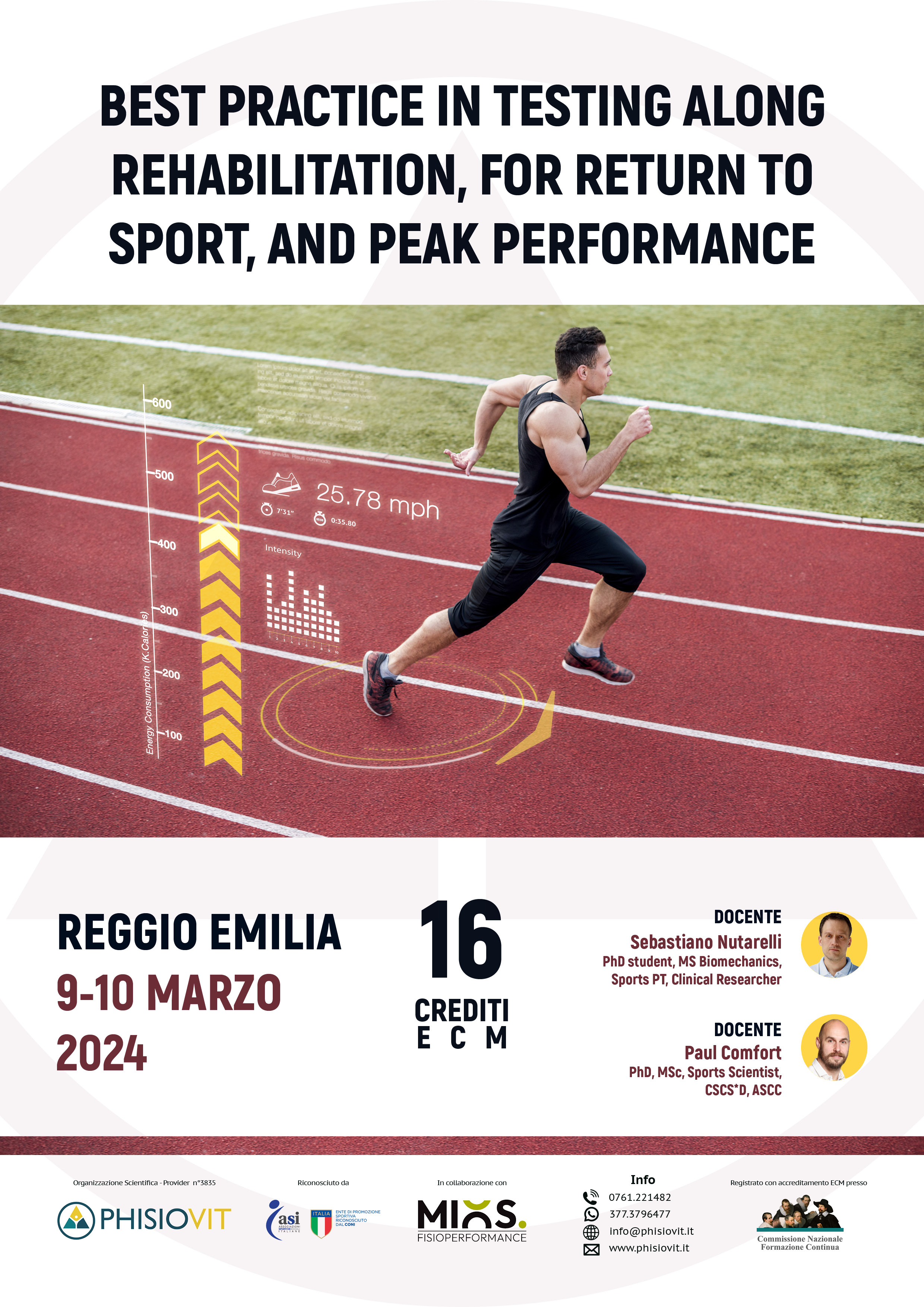 Questo innovativo corso di due giorni mira a presentare le prove scientifiche con ampie sessioni pratiche, usando tecnologie come pedane di forza, elastometri, sensori inerziali indossabili e dinamometri per monitorare il movimento dell'atleta, per misurare forza e potenza e guidare con dati oggettivi la riabilitazione supportando al meglio il ritorno allo sport (RTS) e l'ottimizzazione del rendimento fino al ritorno alle prestazioni (RTP). Attraverso un'introduzione on line pre-corso sui fondamenti della biomeccanica umana e sulla sua applicazione al campo del movimento e grazie alle due intense e complete giornate di corso in presenza, questa accurata formazione progettata per fisioterapisti, medici, preparatori atletici ed esperti del movimento, sarà in grado di fornire tutti gli elementi necessari allo studio, ai test e all'ottimizzazione della biomeccanica e del movimento umano.