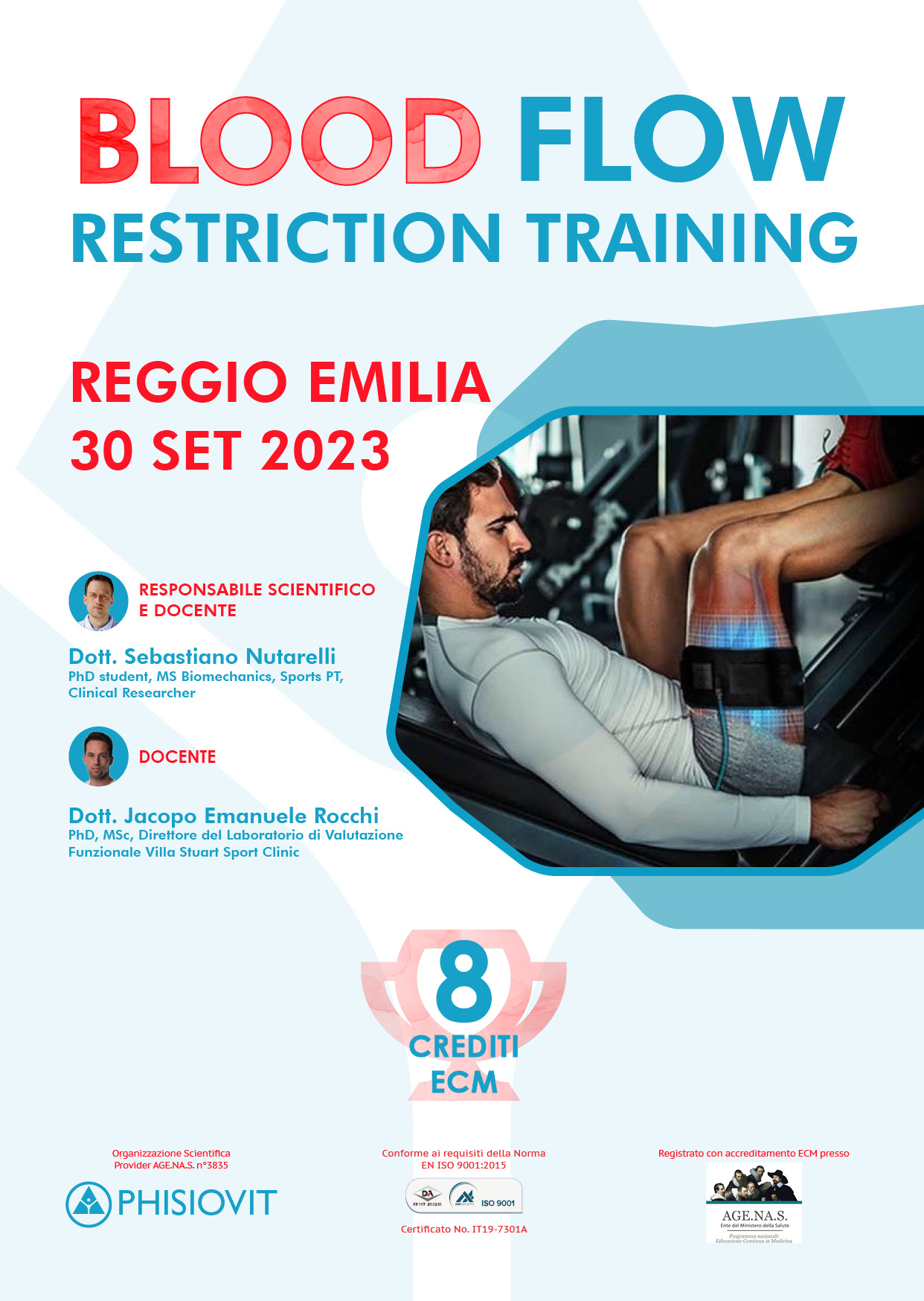Il corso, della durata di un giorno (30 settembre 2023 BFR - Blood Flow Restriction Training), è tenuto dal Dott. Sebastiano Nutarelli, PhD student, MS Biomechanics, Sports PT, Clinical Researcher, al quale è anche affidata la responsabilità scientifica dell'evento. Il corpo docente è completato dal Dott. Jacopo Rocchi, PhD, Lecturer University of Rome "Foro Italico", Director of the Laboratory of Functional Assessment at "Villa Stuart" Sports Clinic. Gli orari vanno dalle 9.00 alle 18.00 e sono previste due pause caffè a metà mattina e metà pomeriggio oltre a una pausa pranzo di un'ora.