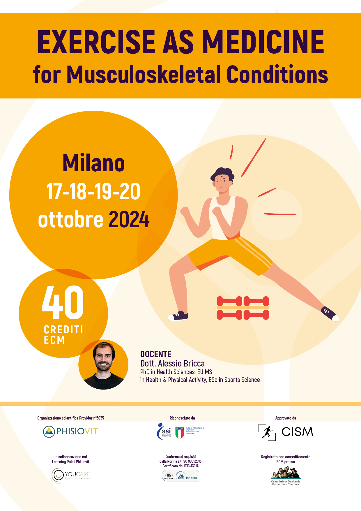 Il corso Exercise as Medicine for Musculoskeletal Conditions è composto da due moduli consecutivi della durata di due giorni ciascuno, per un totale di 40 crediti ECM: