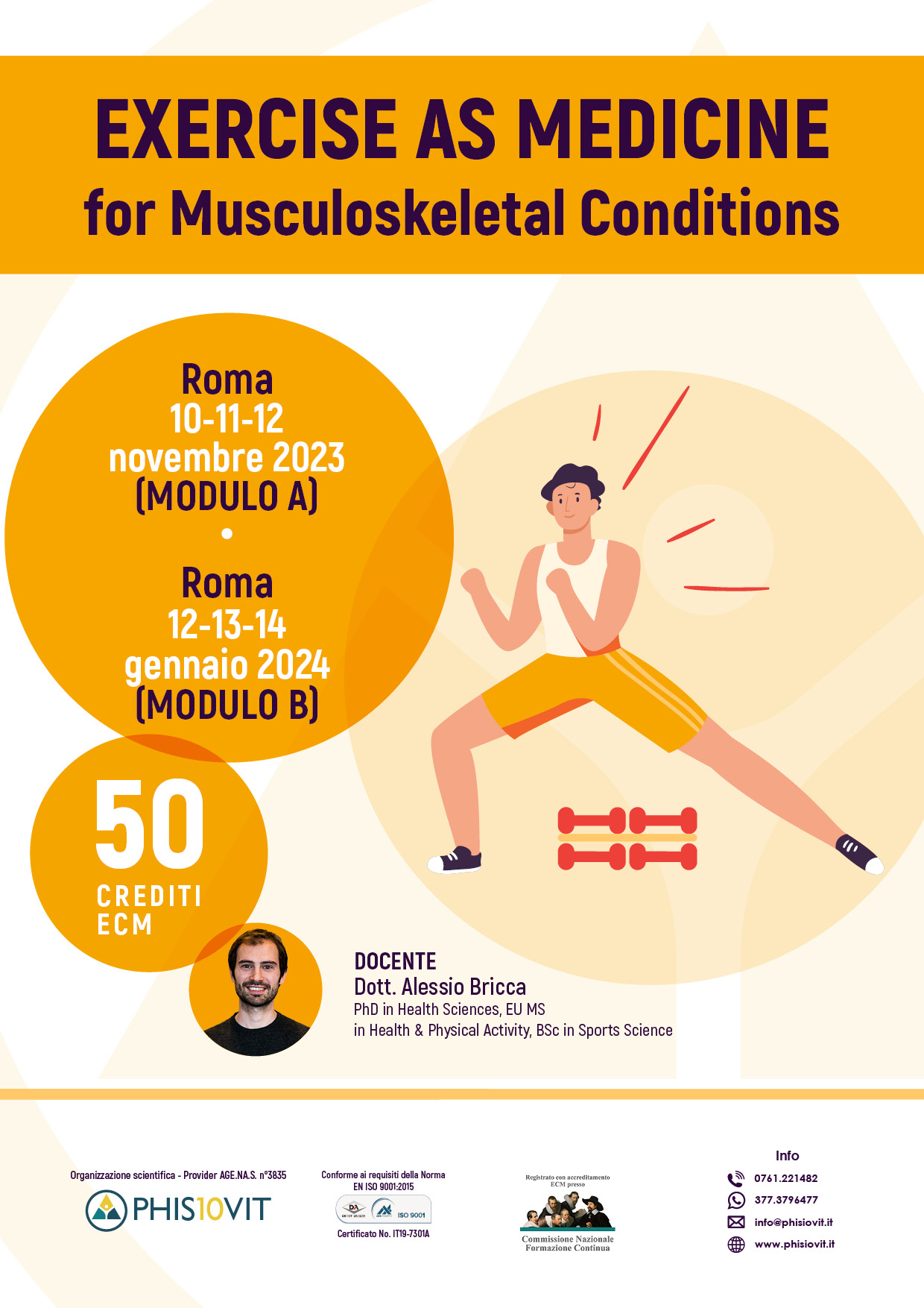 Il corso Exercise as Medicine for Musculoskeletal Conditions è composto da due moduli della durata di tre giorni ciascuno, per un totale di 50 crediti ECM: