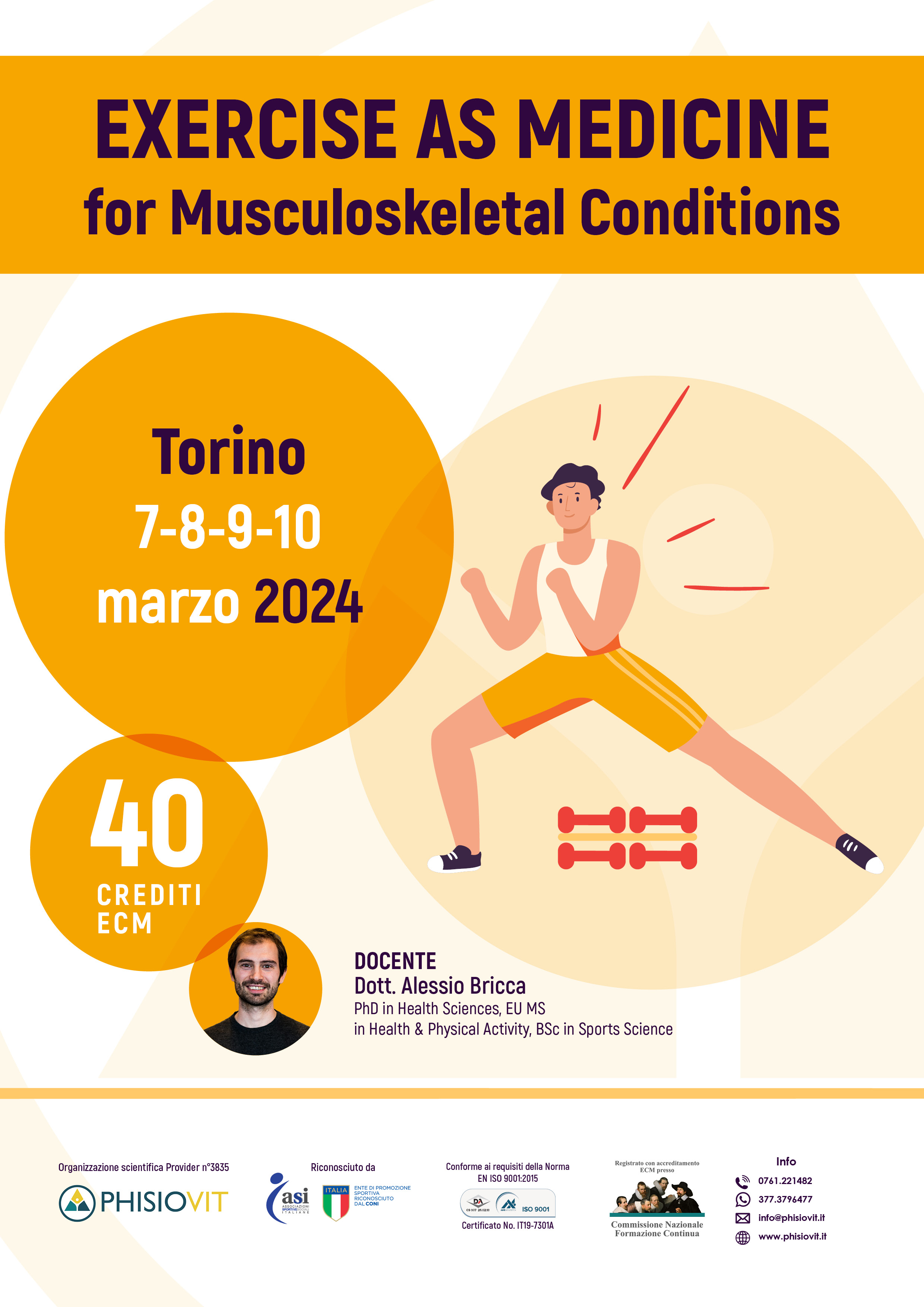 Il corso Exercise as Medicine for Musculoskeletal Conditions è composto da due moduli consecutivi della durata di due giorni ciascuno, per un totale di 40 crediti ECM: