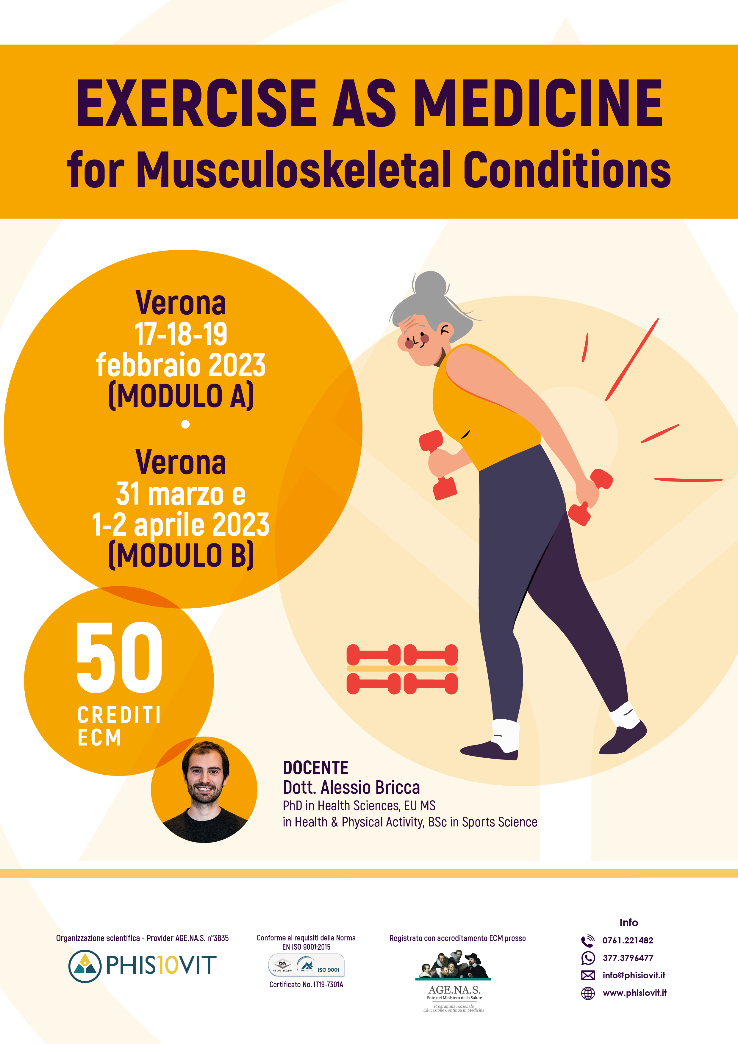 Il corso Exercise as Medicine for Musculoskeletal Conditions è composto da due moduli della durata di tre giorni ciascuno, per un totale di 50 crediti ECM: