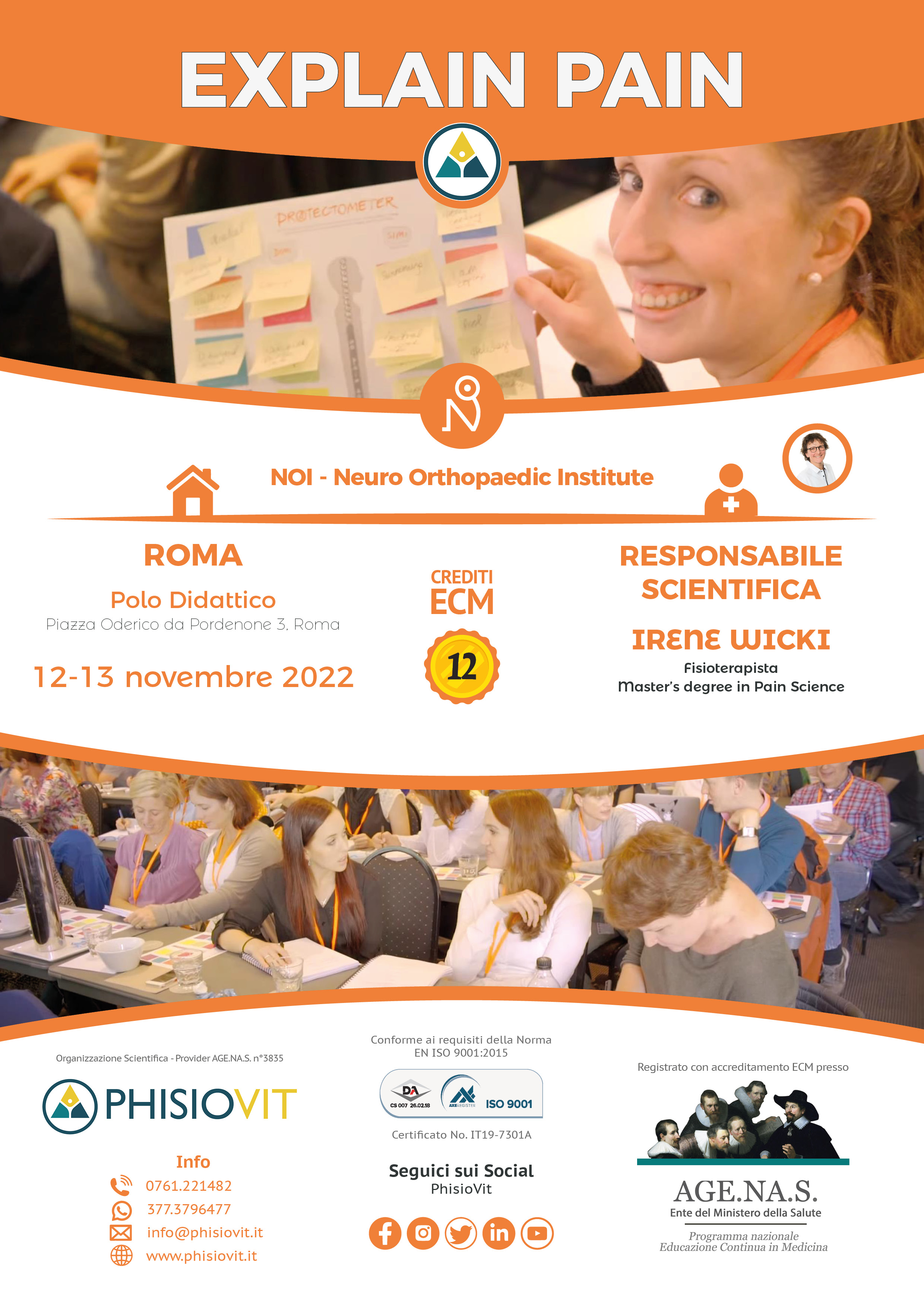 Viviamo oggi in un mondo che sta sperimentando un'epidemia di dolore cronico contro la quale i farmaci stanno mostrando sempre più la loro inefficacia e una sempre più evidente prova del loro fallimento. Abbiamo però fortunatamente a disposizione strumenti educativi semplici ma estremamente potenti che possono individuare efficacemente dentro ognuno di noi il sistema naturale di trattamento del dolore. La conoscenza è potere e nella nuova serie di corsi Explain Pain offerti dal NOI - Neuro Orthopaedic Institute nel mondo, la scienza del dolore più all'avanguardia è stata resa accessibile e comprensibili a tutti. I partecipanti vengono istruiti e condotti puntualmente in un viaggio attraverso le più recenti acquisizioni su tessuti, nervi, encefalo e sugli effetti dello stress sul dolore e sul movimento. Spiegare le moderne neuroscienze al paziente è una strategia evidence based con la quale è possibile modificare i comportamenti legati a stress e dolore. Spiegare il dolore è un processo a due vie: i meccanismi del dolore, le metafore e le storie viste dalla prospettiva del paziente richiedono un'analisi ragionata e sono cruciali per entrare nel mondo di chi soffre.