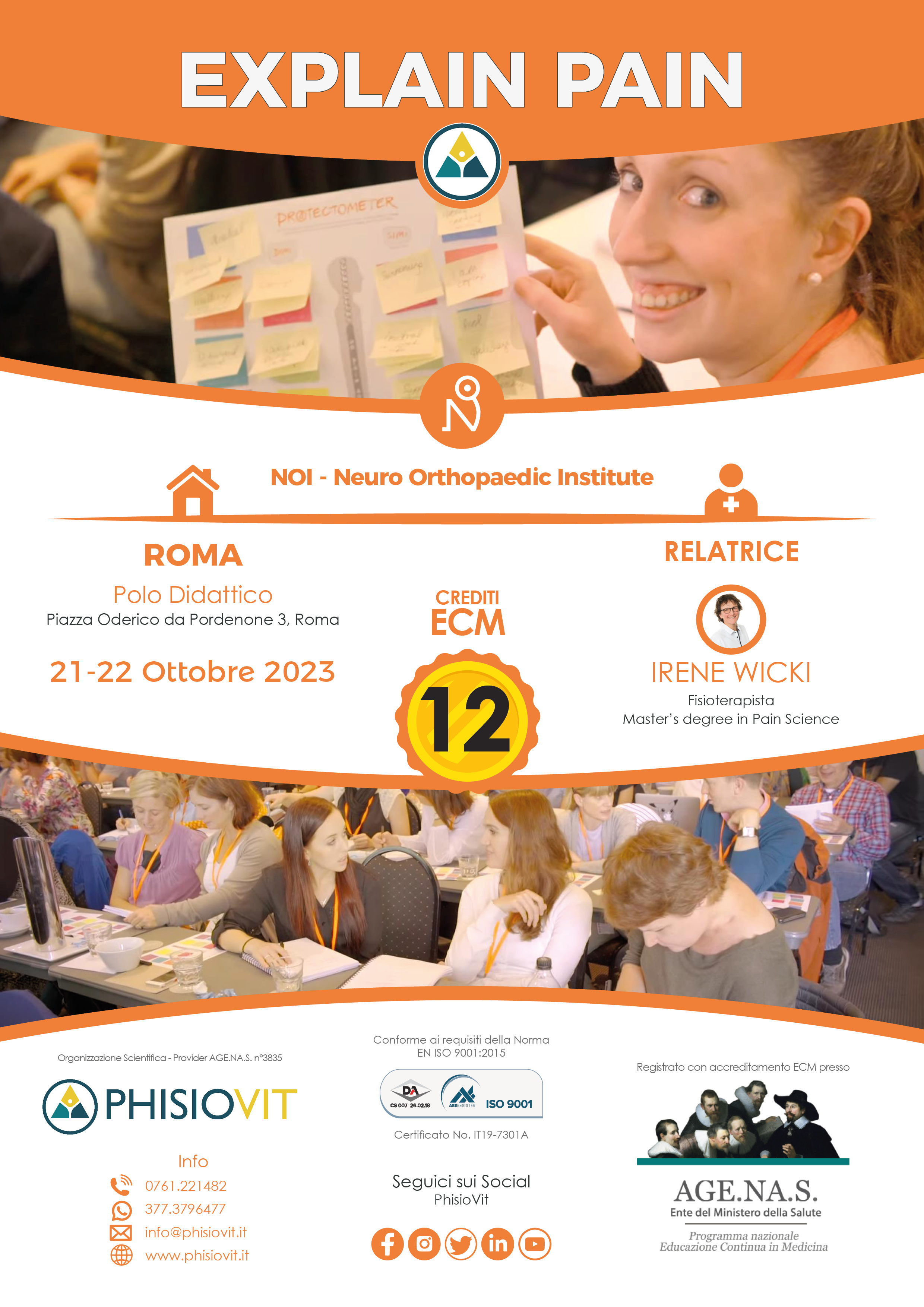 Viviamo oggi in un mondo che sta sperimentando un'epidemia di dolore cronico contro la quale i farmaci stanno mostrando sempre più la loro inefficacia e una sempre più evidente prova del loro fallimento. Abbiamo però fortunatamente a disposizione strumenti educativi semplici ma estremamente potenti che possono individuare efficacemente dentro ognuno di noi il sistema naturale di trattamento del dolore. La conoscenza è potere e nella nuova serie di corsi Explain Pain offerti dal NOI - Neuro Orthopaedic Institute nel mondo, la scienza del dolore più all'avanguardia è stata resa accessibile e comprensibili a tutti. I partecipanti vengono istruiti e condotti puntualmente in un viaggio attraverso le più recenti acquisizioni su tessuti, nervi, encefalo e sugli effetti dello stress sul dolore e sul movimento. Spiegare le moderne neuroscienze al paziente è una strategia evidence based con la quale è possibile modificare i comportamenti legati a stress e dolore. Spiegare il dolore è un processo a due vie: i meccanismi del dolore, le metafore e le storie viste dalla prospettiva del paziente richiedono un'analisi ragionata e sono cruciali per entrare nel mondo di chi soffre.