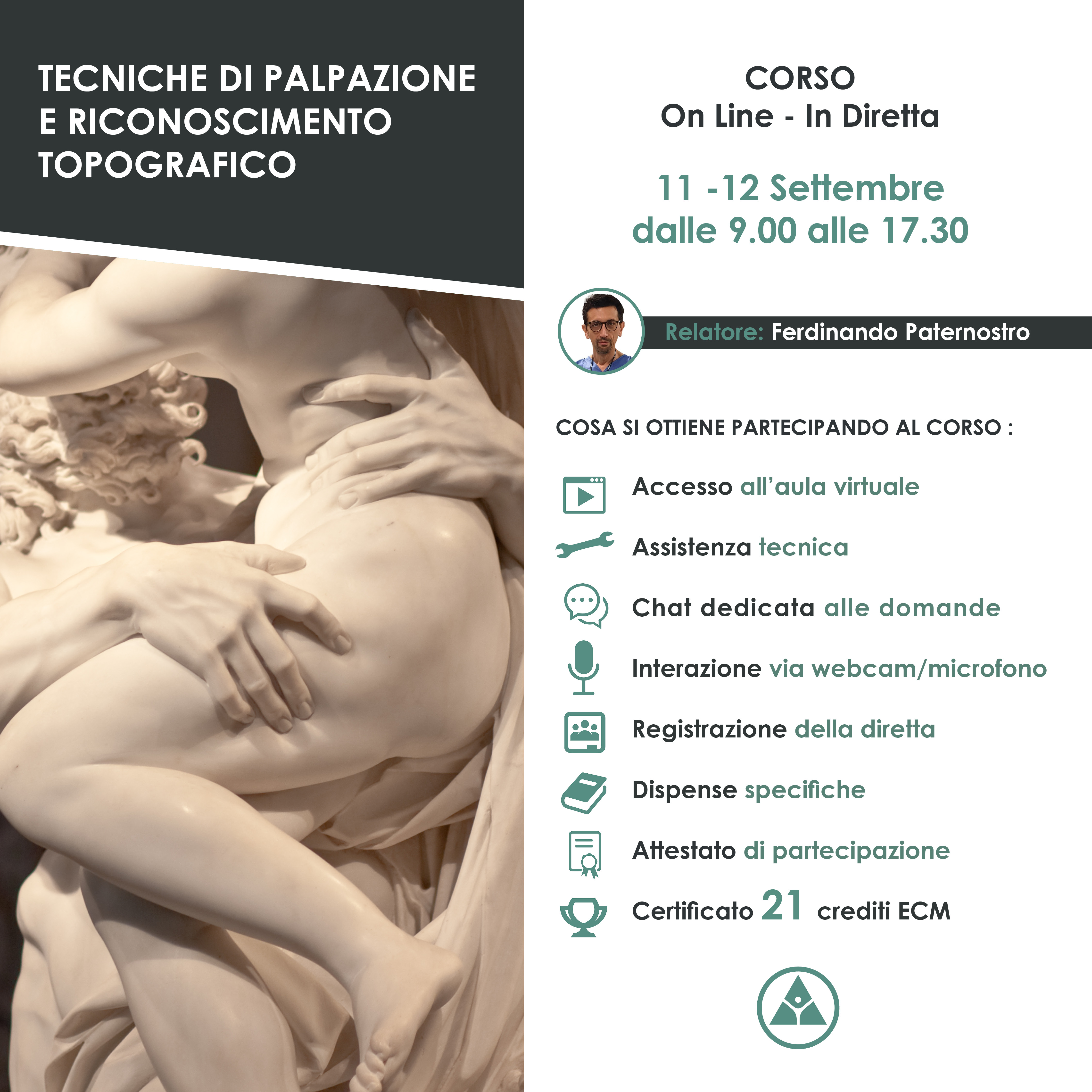 Questo corso on line si apre con una serie di brevi e schematiche unità didattiche sulla valutazione della cute, sulla valutazione meccanica del sistema nervoso, sulla palpazione, sulle articolazioni e sui principali test per la valutazione di disfunzioni del sistema muscolare. È orientato in modo da suddividere concettualmente ogni regione anatomica e ogni distretto topografico in tre aree sistematiche ben distinte: osteologia, miologia, nervi e vasi. Per ogni distretto preso in esame, vengono individuate le varie componenti strutturali cercando di acquisirne con precisione la localizzazione, affinando la sensazione palpatoria che ne deriva. L'evento è concentrato in due giorni durante i quali un body painter disegnerà sul corpo di un modello le strutture illustrate, facilitando così la comprensione a distanza delle tecniche palpatorie illustrate dal docente Prof. Ferdinando Paternostro.