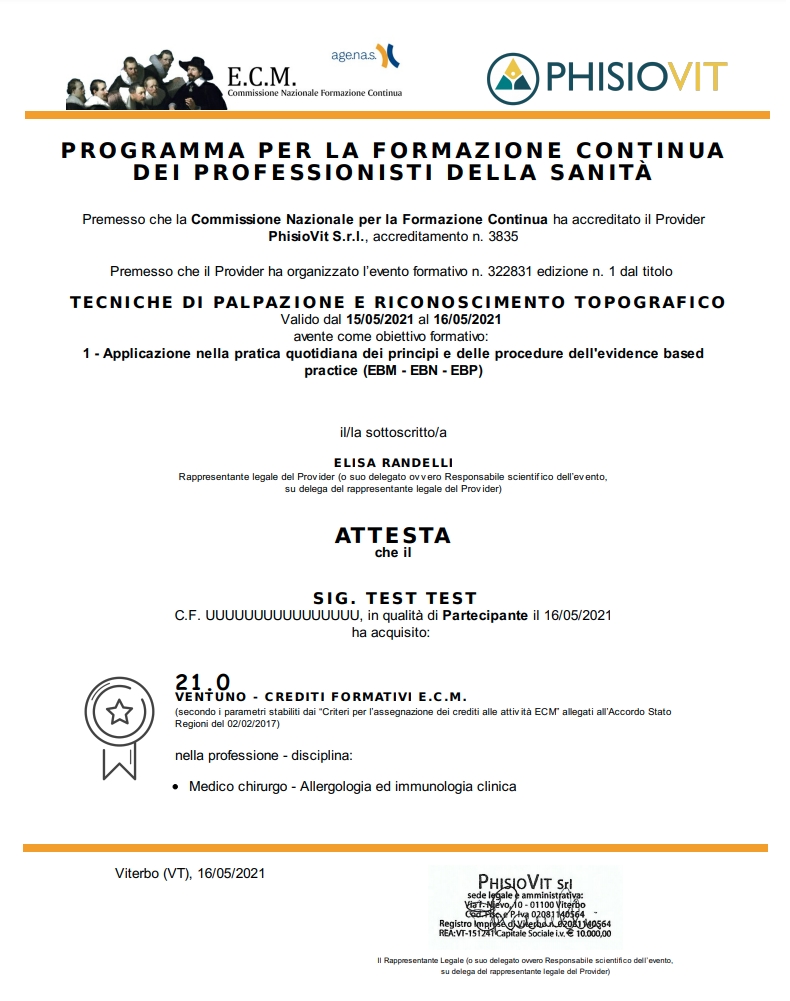 • Certificato dei 21 Crediti ECM ottenuti al superamento del questionario (*2) (guarda qui il certificato ECM che riceverai al superamento del quiz)