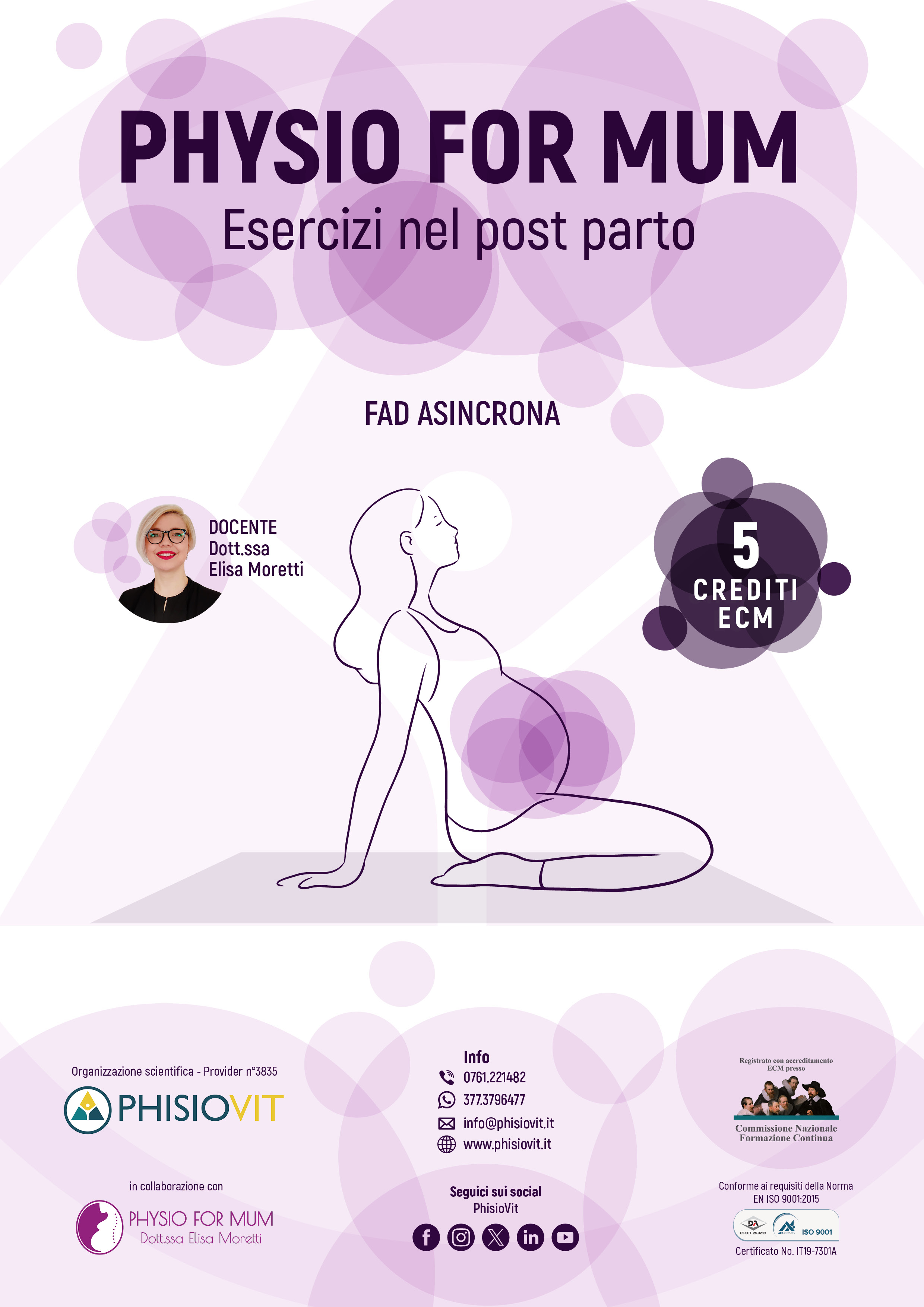 Physio For Mum 2 è un approfondimento su esercizi sia a corpo libero che con piccoli attrezzi, mirati e adattati per le donne nella fase del post parto: il focus è posto sul pavimento pelvico, sulla mobilità di bacino, della colonna e sul rinforzo globale. Durante la formazione il discente avrà una panoramica ampia su quali possono essere gli esercizi da somministrare alla paziente sia in studio che a casa come autotrattamento. Questo corso FAD asincrono in distance learning si divide in una prima parte teorica sulle principali patologie che possono emergere nel post parto e sul razionale degli esercizi proposti, mentre la seconda parte è molto più ampia e contiene esercizi pratici in varie posizioni e con diverse tipologie di materiale per poter lavorare su: pavimento pelvico, mobilità di bacino, mobilità e rinforzo della colonna, rinforzo globale. Questo progetto formativo nasce dall'esigenza di trovare una serie di esercizi adatti alla donna in gravidanza e nel post parto, trasformando tutto ciò in un percorso per poterla supportare sotto tutta la sfera che riguarda le disfunzioni muscoloscheletriche. Si tratta di un percorso formativo che nasce dall'esperienza della Dott.ssa Elisa Moretti nel campo dell'esercizio riabilitativo e in quello del pilates terapeutico durante la sua maternità: la gravidanza in lockdown, l'ha portata ad ideare un percorso di prevenzione facile da riprodurre presso le strutture sanitarie e gli studi professionali, ma anche un valido supporto per l'educazione all'esercizio e agli autotrattamenti da svolgere a casa. È un corso pensato per tutte le figure sanitarie che lavorano con donne in gravidanza e post parto: un approfondimento su esercizi sia a corpo libero che con piccoli attrezzi, mirato e adattato alle donne in maternità con focus sul post parto.