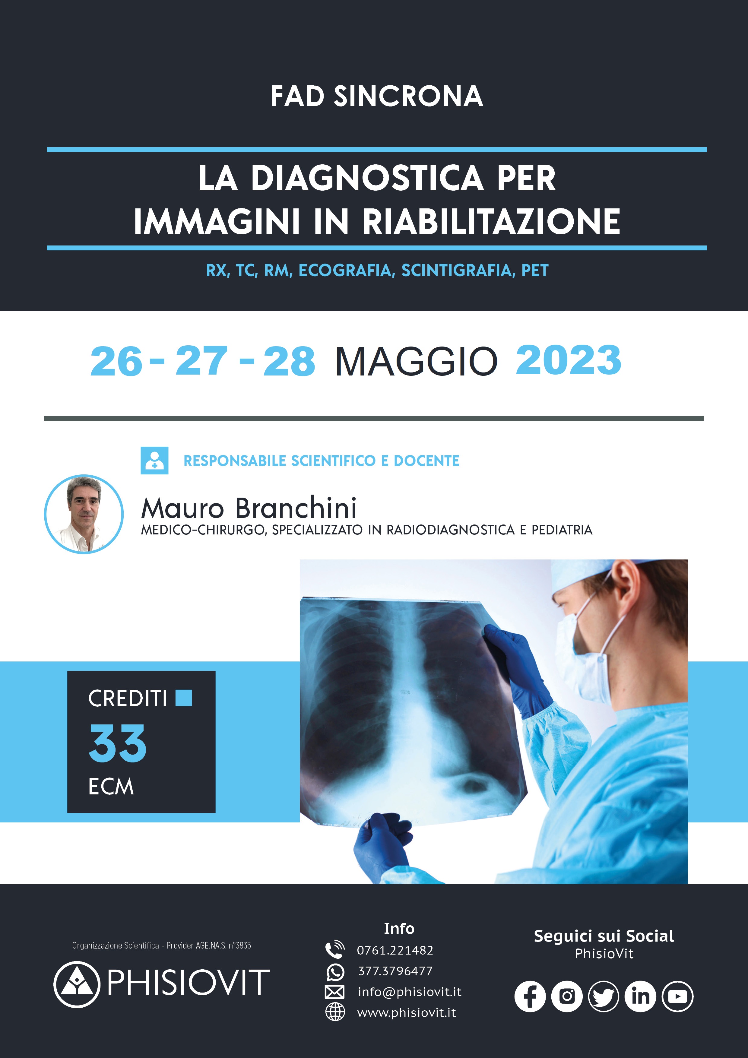 Scopo del corso non è quello di insegnare tutta la radiologia, ma di dare le basi e le nozioni per analizzare l'imaging radiologico ed interpretare nel modo più corretto possibile quello che si vede. Un corso dedicato esclusivamente a migliorare la pratica nel settore della riabilitazione al fine di un più corretto e specifico approccio alla patologia del paziente. L'obiettivo è dare al riabilitatore anche informazioni aggiuntive per una valutazione ancora più completa dell'imaging dei diversi distretti anatomici. Un referto radiologico, seppur corretto, completo ed esaustivo, non può essere comprensivo di quelle informazioni che non vengono richieste alla radiologia, ma che il riabilitatore può in prima persona trovare nell'imaging e trasformare in un valido aiuto per il trattamento riabilitativo che ritiene utile impostare.