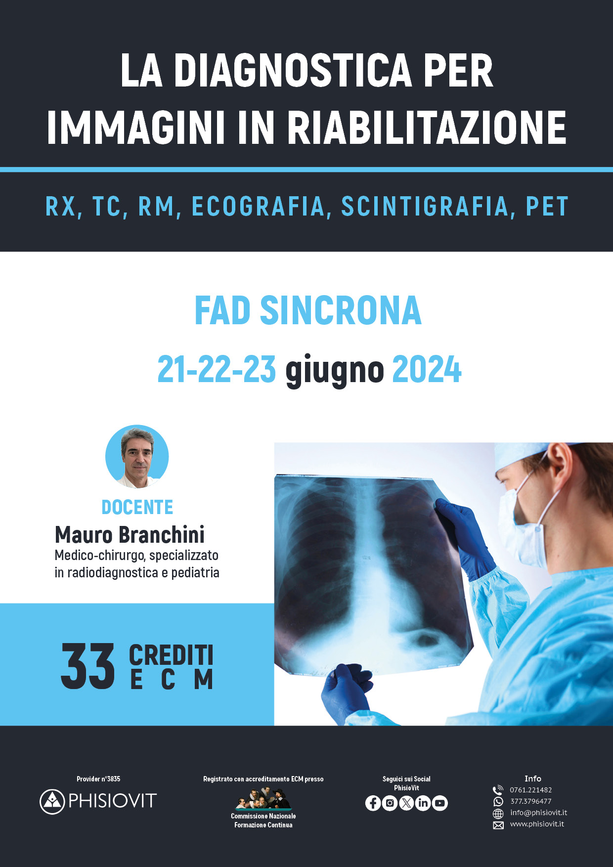 Scopo del corso non è quello di insegnare tutta la radiologia, ma di dare le basi e le nozioni per analizzare l'imaging radiologico e interpretare nel modo più corretto possibile quello che si vede. Un corso dedicato esclusivamente a migliorare la pratica nel settore della riabilitazione al fine di un più corretto e specifico approccio alla patologia del paziente. L'obiettivo è dare al riabilitatore anche informazioni aggiuntive per una valutazione ancora più completa dell'imaging dei diversi distretti anatomici. Un referto radiologico, seppur corretto, completo ed esaustivo, non può essere comprensivo di quelle informazioni che non vengono richieste alla radiologia, ma che il riabilitatore può in prima persona trovare nell'imaging e trasformare in un valido aiuto per il trattamento riabilitativo che ritiene utile impostare.
