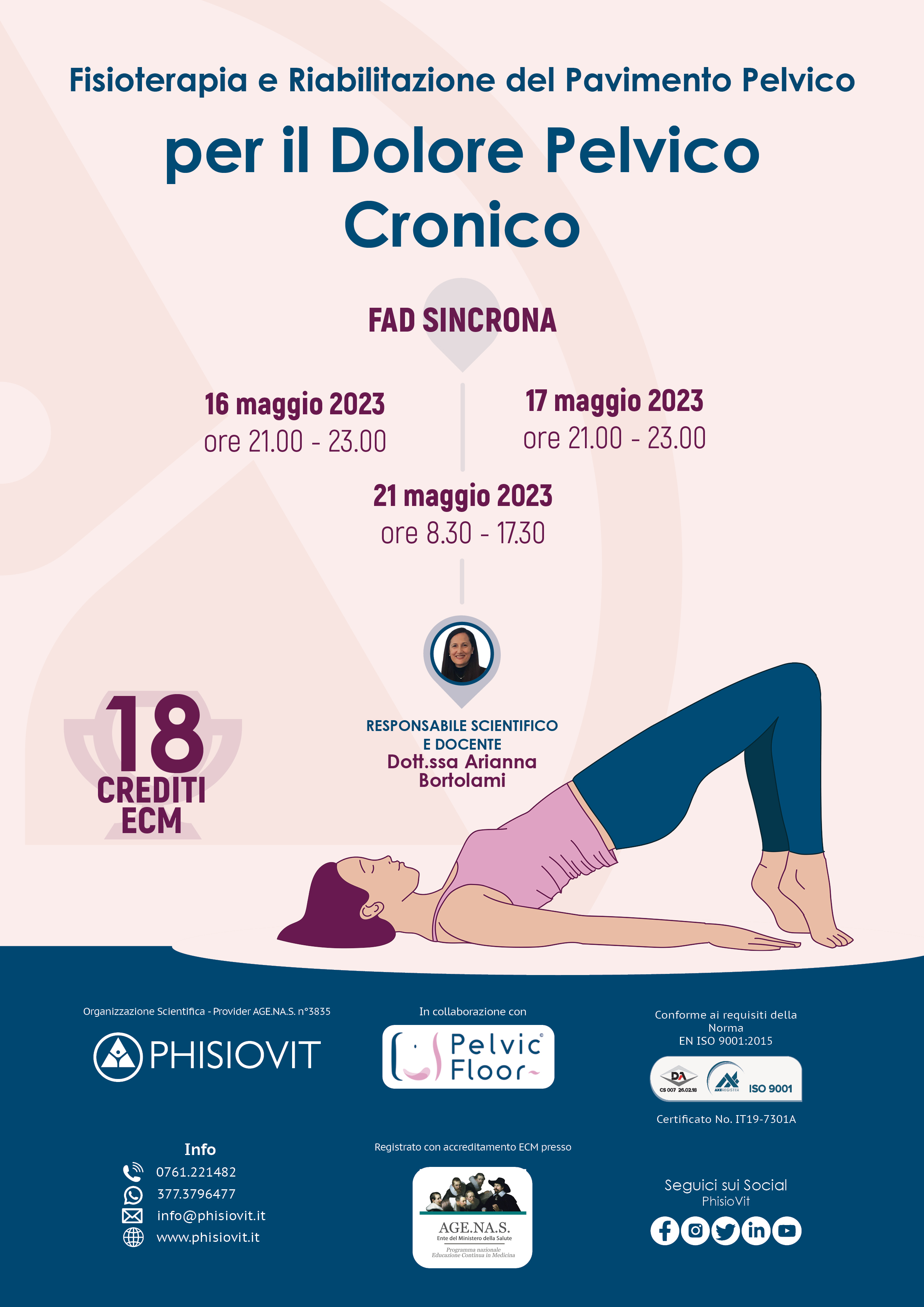 Questo progetto didattico dal titolo "Fisioterapia e Riabilitazione nella Sindrome del Dolore Pelvico Cronico" è la versione streaming on line del corso blended della Dott.ssa Arianna Bortolami che si tiene il 16 maggio, 17 maggio e 21 maggio 2023 con data in presenza a Roma: questo progetto formativo è un modulo didattico specificatamente progettato per la gestione riabilitativa della sindrome del dolore pelvico cronico (Chronic Pelvic Pain Syndrome - CPPS) che è una condizione determinata dalla presenza di dolore cronico o persistente da almeno sei mesi percepito in strutture correlate alla pelvi, in assenza di comprovate infezioni o altra evidente patologia locale che possa essere responsabile del dolore. I sintomi possono comprendere il basso tratto urinario, gli organi sessuali, il tratto intestinale, l'apparato ginecologico; spesso le conseguenze riguardano l'ambito cognitivo, comportamentale, sessuale, emotivo. Il dolore può essere percepito in uno o più organi o zone. Tale sindrome, che può colpire sia uomini che donne, costituisce una condizione così invalidante da limitare gravemente la vita di chi ne soffre. Negli ultimi anni la letteratura scientifica, riconoscendo l'esistenza di questa sindrome, ne ha identificato le condotte diagnostico-terapeutiche, indicando il sistema muscolo-scheletrico come uno degli apparati coinvolti, particolarmente per quanto riguarda i muscoli del pavimento pelvico; ha inoltre riconosciuto la fisioterapia tra le terapie indicate nella gestione di tale sindrome.