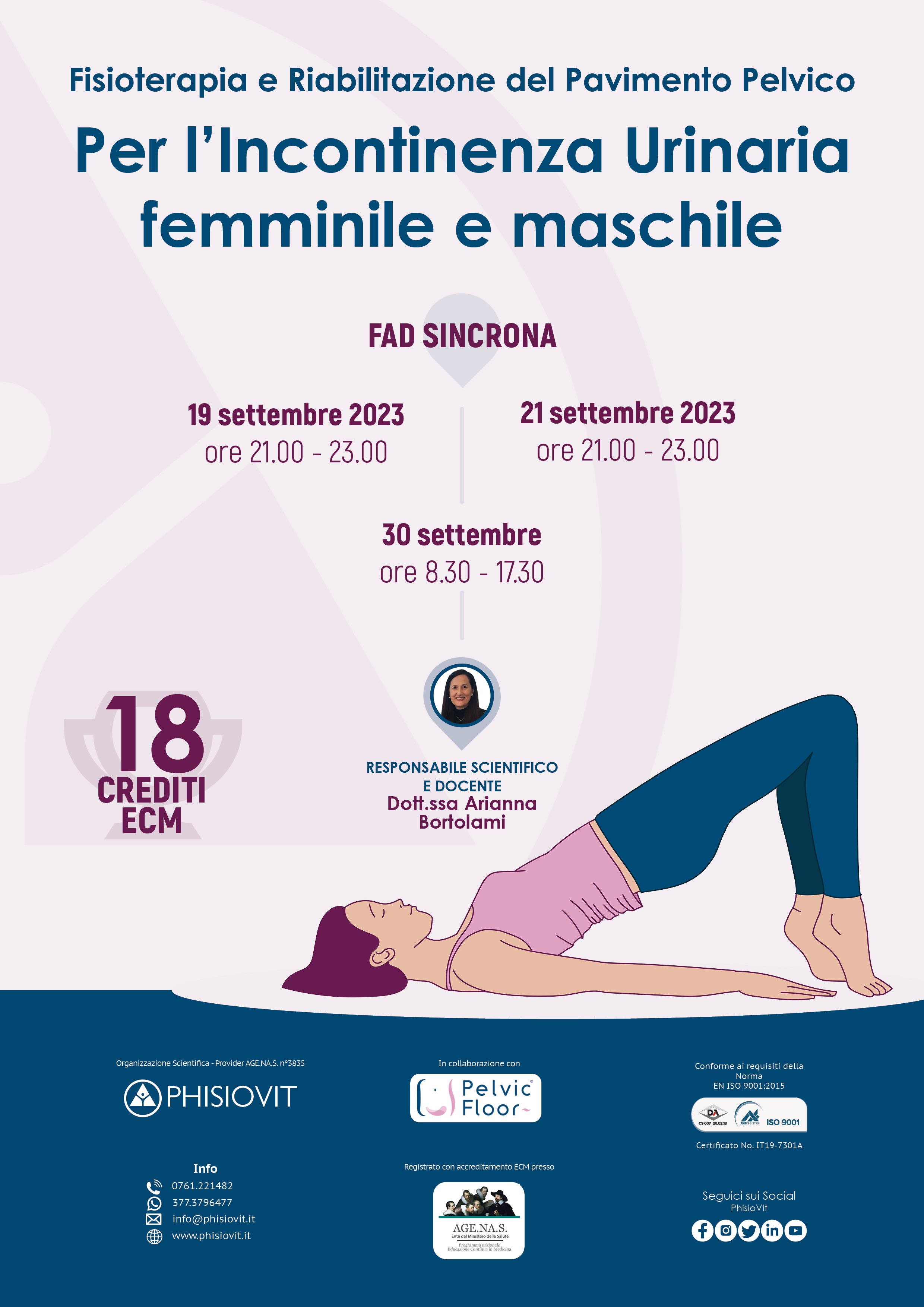 Questo progetto didattico dal titolo "Fisioterapia e Riabilitazione del Pavimento Pelvico per l'Incontinenza Urinaria Femminile e Maschile" è la versione streaming online del corso blended della Dott.ssa Arianna Bortolami che si tiene il 19 settembre, il 21 settembre e il 30 settembre 2023 con data in presenza a Roma: si tratta di un evento specifico per questo tipo di disfunzioni e include strategie riabilitative per le diverse forme di incontinenza urinaria femminile e maschile di origine non neurogena. La fisioterapia e la riabilitazione del pavimento pelvico costituiscono la prima opzione terapeutica per l'incontinenza urinaria di origine non neurogena. Questo sintomo, definito come la perdita involontaria di urina, riguarda intimamente la qualità di vita: chi ne soffre spesso riferisce sensazioni di imbarazzo, frustrazione, disagio nei confronti dell'ambiente circostante e delle persone che gli stanno vicino. A ciò possono conseguire alterazioni della vita affettiva, relazionale e sociale. Inoltre, l'incontinenza può avere un costo economico considerevole. Negli ultimi decenni la letteratura internazionale ha dedicato molta attenzione a questo problema: in questo modo l'evidenza scientifica e le prove ottenute hanno dimostrato l'efficacia delle varie opzioni terapeutiche, tra le quali è appunto compresa la fisioterapia e la riabilitazione del pavimento pelvico. Essa è costituita da una serie di tecniche e strumenti, che all'interno di un processo di ragionamento clinico e alla luce del paradigma dell'evidence based practice, permettono la gestione del sintomo relativo all'incontinenza urinaria di origine non neurogena.