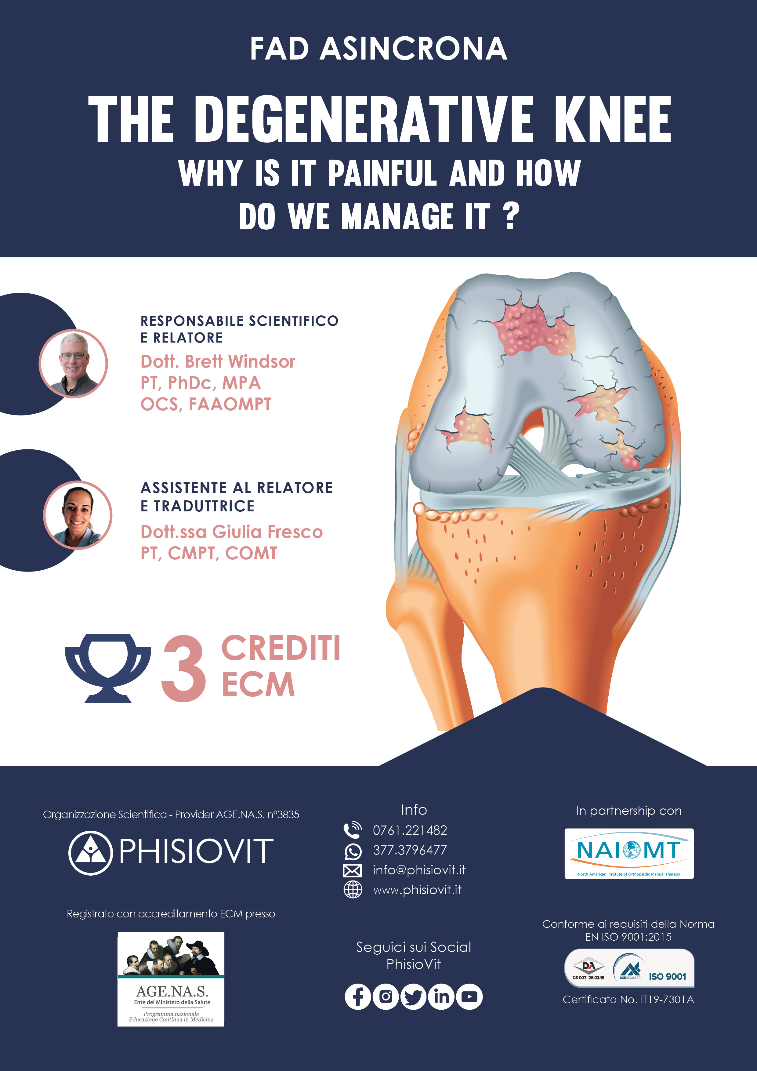 Il dolore nel ginocchio degenerativo rappresenta un aspetto di comune riscontro nella popolazione rappresentativa di questa classe di pazienti. I recenti progressi nella scienza del dolore e nella fisiopatologia della degenerazione articolare hanno migliorato la nostra capacità di gestire questa affezione molto comune, specie dopo la quinta decade di vita. Perché l'articolazione del ginocchio degenera? Quali sono i primi cambiamenti? Qual è il meccanismo del dolore? Come si valuta l'articolazione in modo da poter riconoscere precocemente il problema, quando è meglio gestirlo in modo conservativo? Cosa possiamo imparare da Cyriax su come gestire il dolore degenerativo al ginocchio? Questo corso fa il punto sulle ultime ricerche riguardo le condizioni degenerative articolari, sui loro effetti a carico dell'articolazione del ginocchio e sulla funzione generale. Vengono presentate informazioni dettagliate su degenerazione e fisiopatologia, con particolare attenzione ai migliori metodi di valutazione utili per prendere decisioni su quali pazienti devono essere indirizzati al medico e quali possono essere gestiti in modo conservativo per mezzo di principi di gestione basati sull'evidenza.