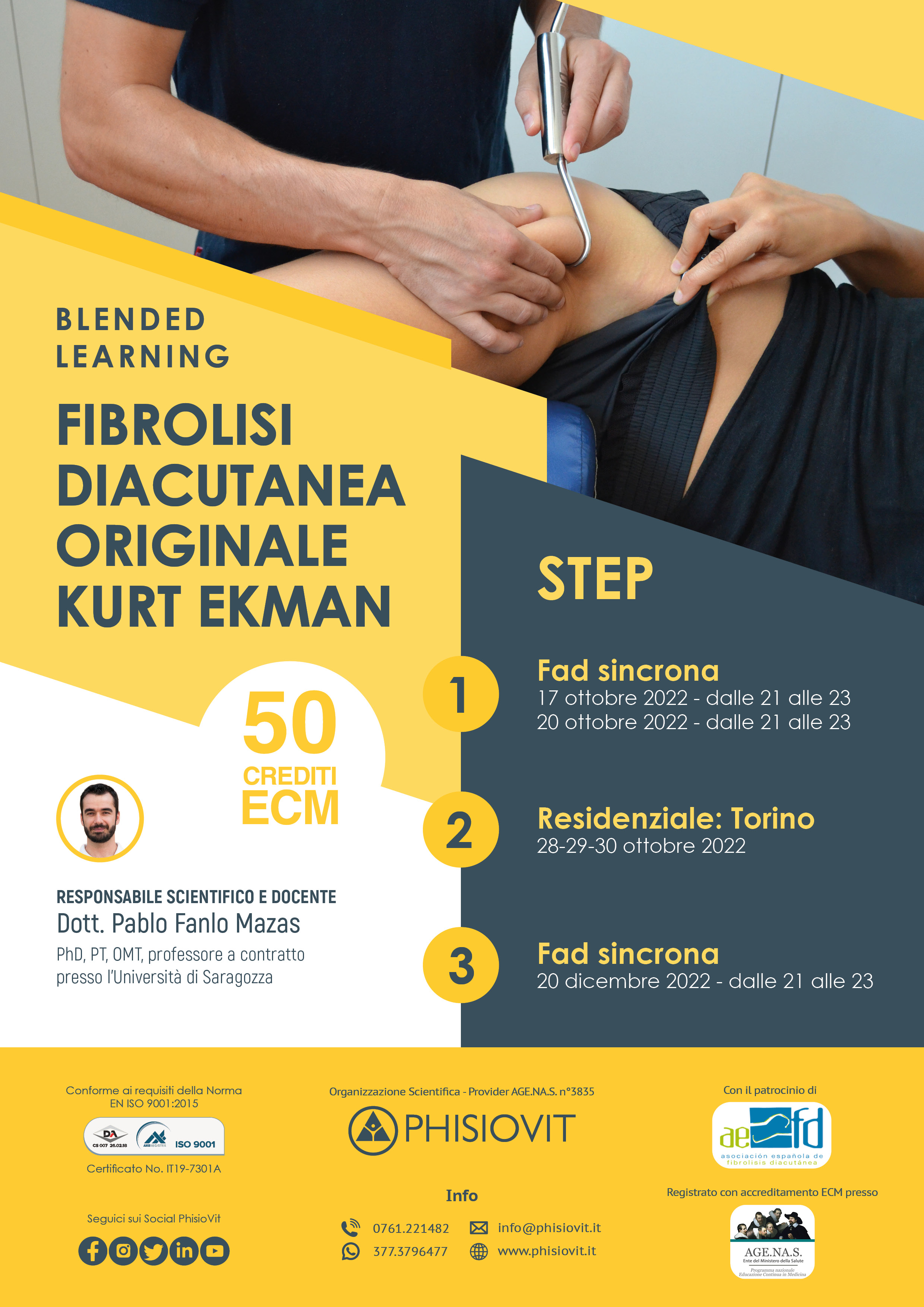 - STEP 1: si inizia con due FAD sincrone in diretta e interattive, della durata di 2 ore l'una, realizzate con il Dott. Pablo Fanlo Mazas. La prima lunedì 17 ottobre 2022 e la seconda giovedì 20 ottobre 2022 entrambe con orario che va dalle 21.00 alle 23.00. A seguito dell'iscrizione, si ricevono due link per accedere nei giorni e agli orari prestabiliti. Questa formazione serve ad introdurre l'argomento, a studiare i principi cardine della fibrolisi, a recuperare concetti di anatomia muscoloscheletrica e a garantire una preparazione più completa al partecipante, oltre che un'interazione diretta tra discenti e docente in vista dell'incontro in aula fisica.