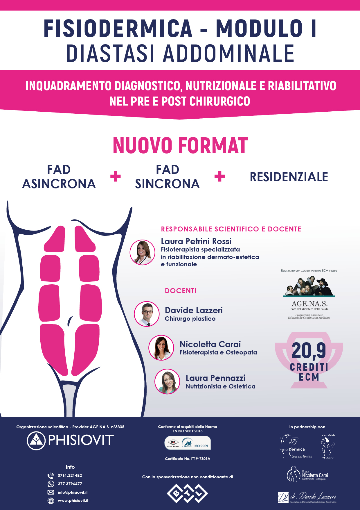 Il corso "Diastasi Addominale: Inquadramento Diagnostico, Nutrizionale e Riabilitativo nel Pre e Post Chirurgico" vede la presenza tra i relatori dei maggiori esperti di settore e nasce con l'obiettivo di favorire lo studio e la pratica clinica dei professionisti sanitari che intervengono in qualità di discenti. Si svolge parte on line e parte in presenza attraverso l'esposizione delle relazioni dei docenti: la successiva discussione che ne nasce attraverso l'elaborazione della valutazione funzionale più utile e del trattamento terapeutico più idoneo, alla luce del paradigma dell'Evidence Based Practice, migliora nettamente le abilità del partecipante favorito anche dal brain storming prima in aula virtuale e poi in aula fisica. Il corsista stesso può anche esporre i dubbi insorti in itinere durante gli incontri in presenza e a distanza così da aumentare, attraverso l'interazione diretta con i relatori e con la classe stessa, l'esperienza e la sicurezza in materia di riabilitazione dermato-estetica e funzionale.