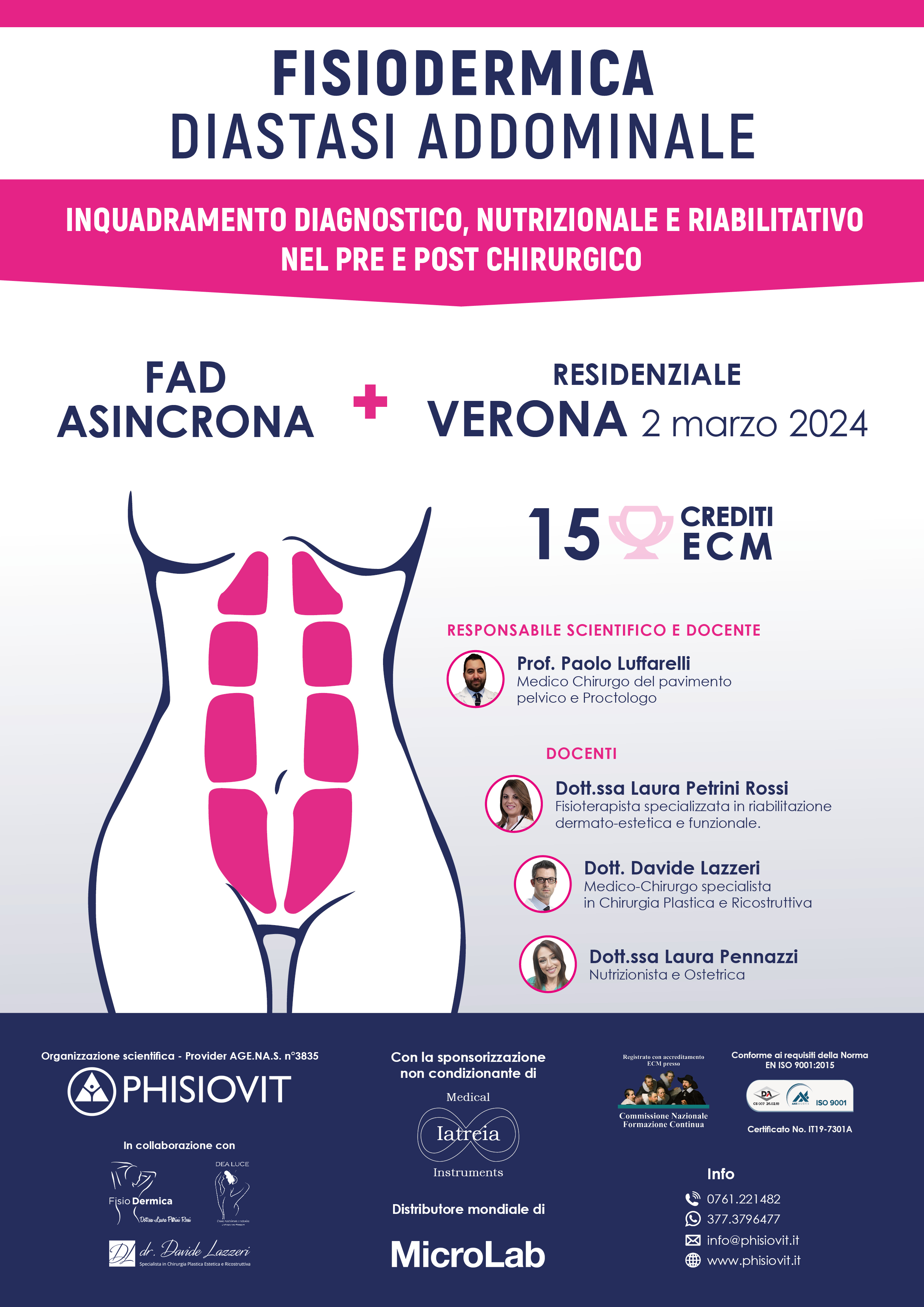 Il corso "Diastasi Addominale: Inquadramento Diagnostico, Nutrizionale e Riabilitativo nel Pre e Post Chirurgico" vede la presenza tra i relatori dei maggiori esperti di settore e nasce con l'obiettivo di favorire lo studio e la pratica clinica dei professionisti sanitari che intervengono in qualità di discenti. Si svolge parte on line e parte in presenza attraverso l'esposizione delle relazioni dei docenti: la successiva discussione che ne nasce attraverso l'elaborazione della valutazione funzionale più utile e del trattamento terapeutico più idoneo, alla luce del paradigma dell'Evidence Based Practice, migliora nettamente le abilità del partecipante favorito anche dal brain storming prima in aula virtuale e poi in aula fisica. Il corsista stesso può anche esporre i dubbi insorti in itinere durante gli incontri in presenza e a distanza così da aumentare, attraverso l'interazione diretta con i relatori e con la classe stessa, l'esperienza e la sicurezza in materia di riabilitazione dermato-estetica e funzionale.